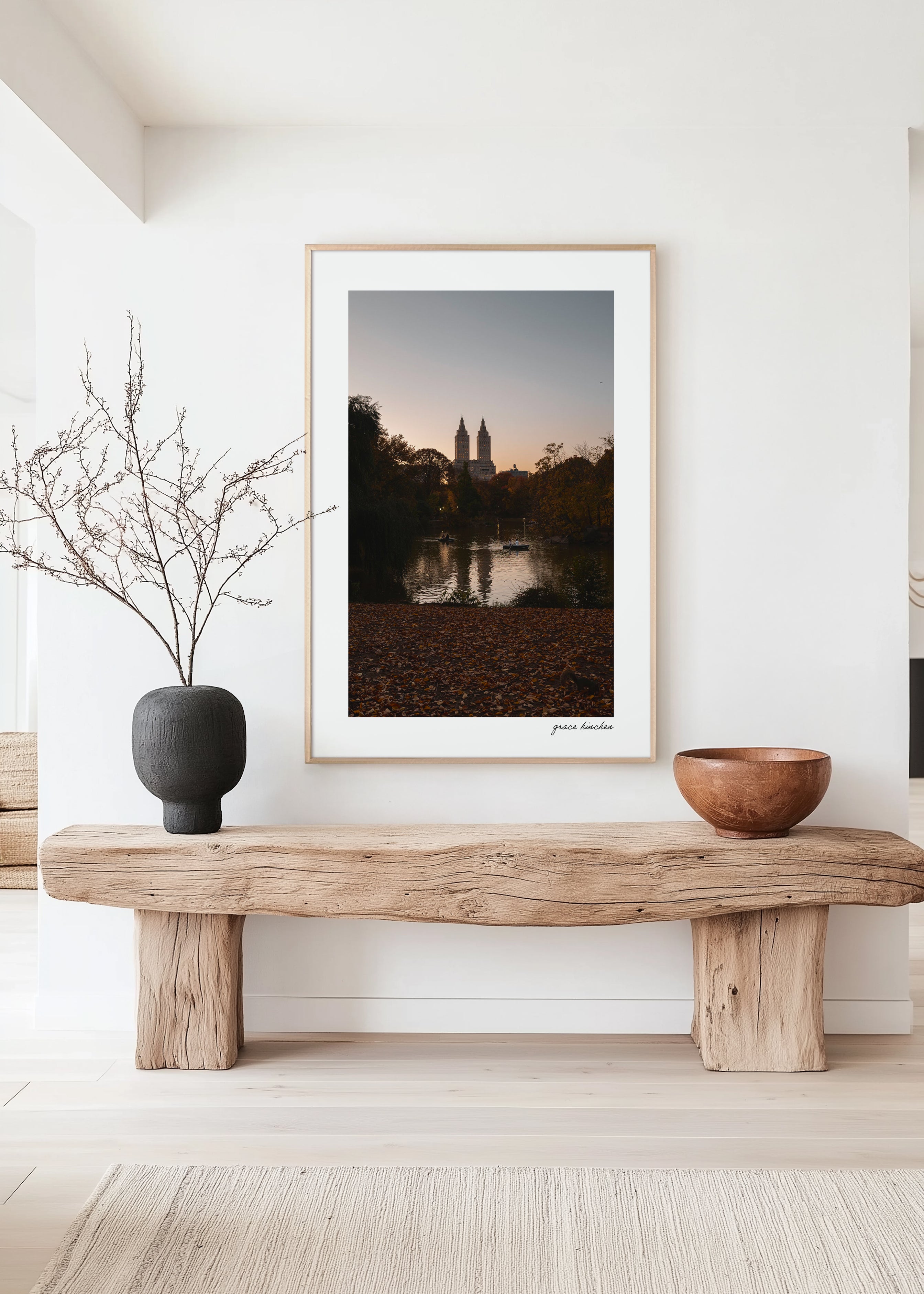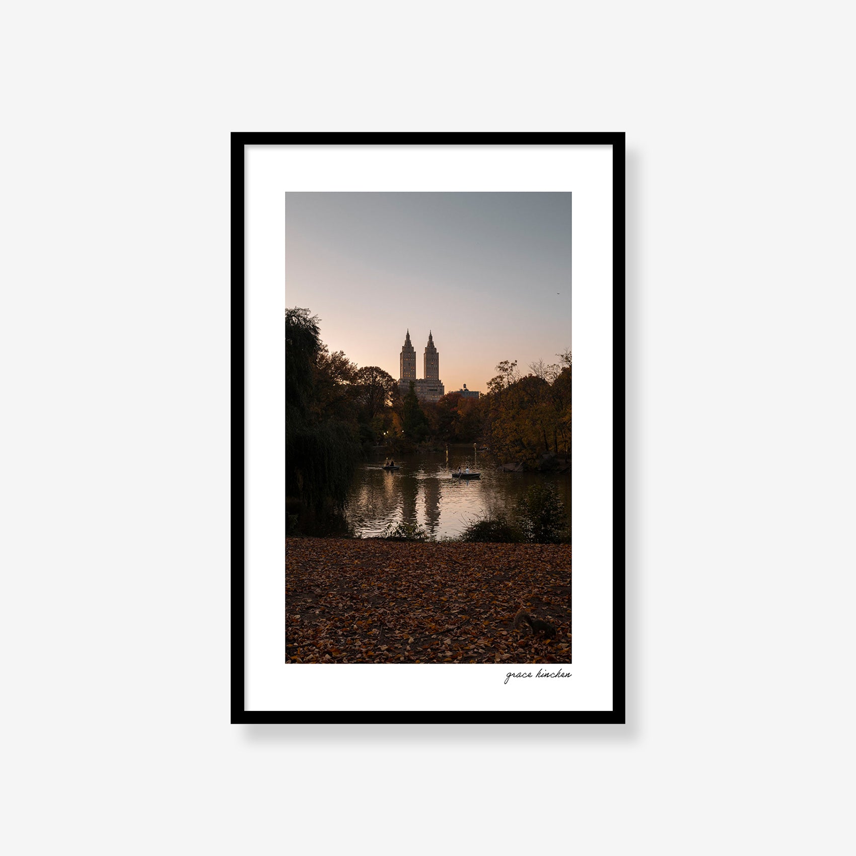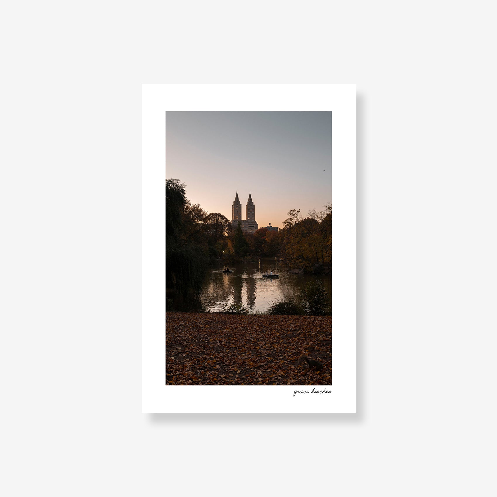 Rowboats drift across Central Park Lake beneath Manhattan's San Remo as autumn takes center stage. Shot October 2024.