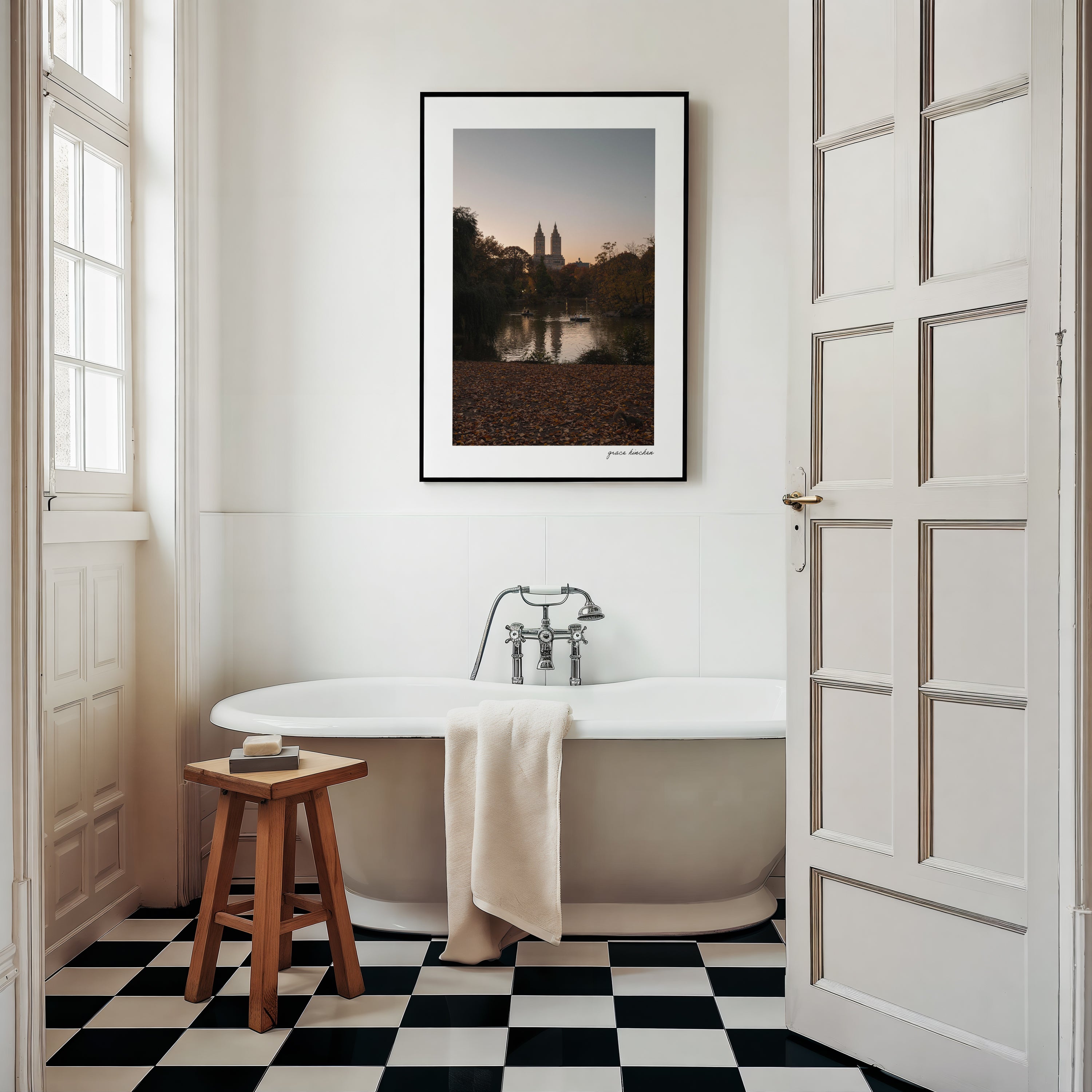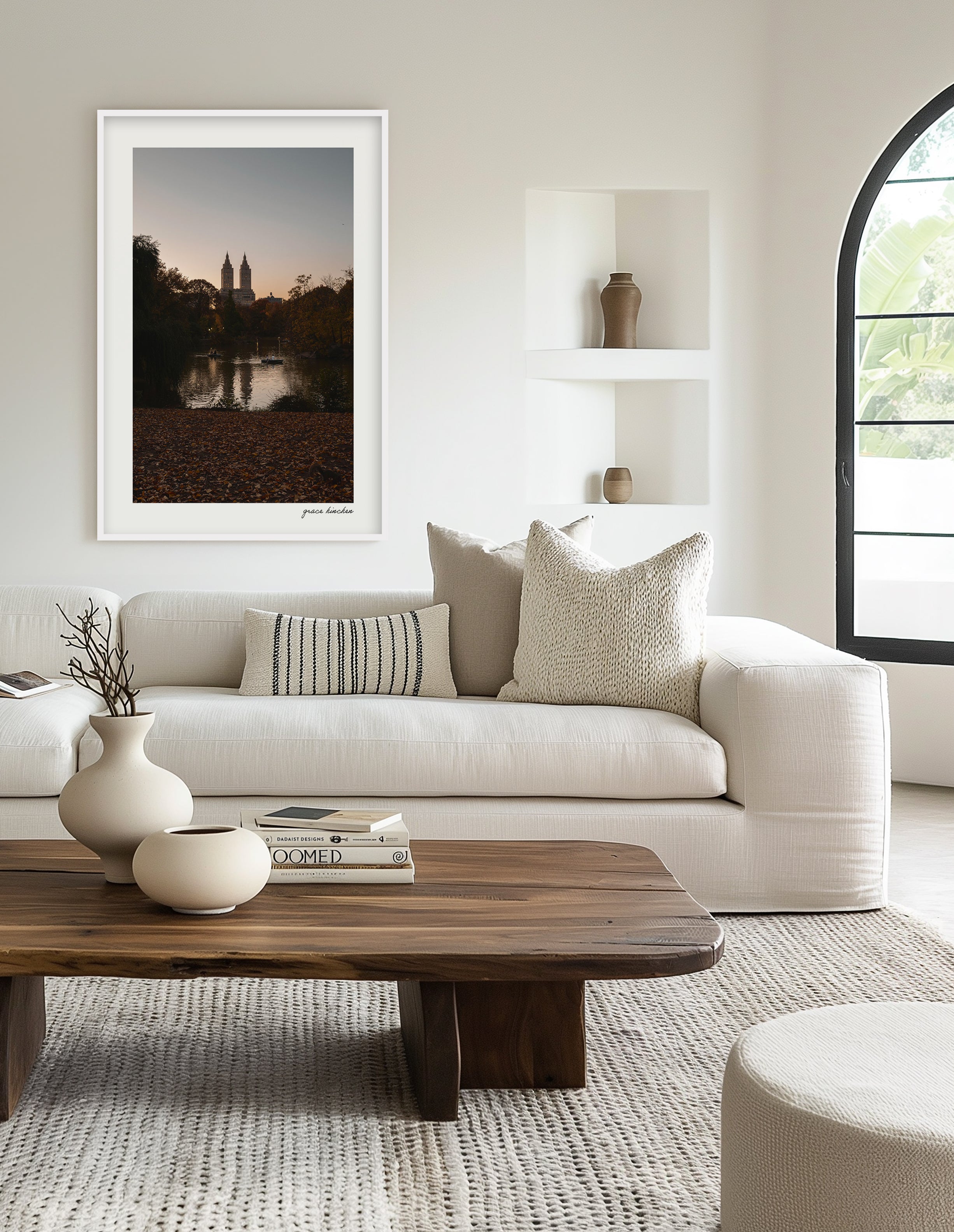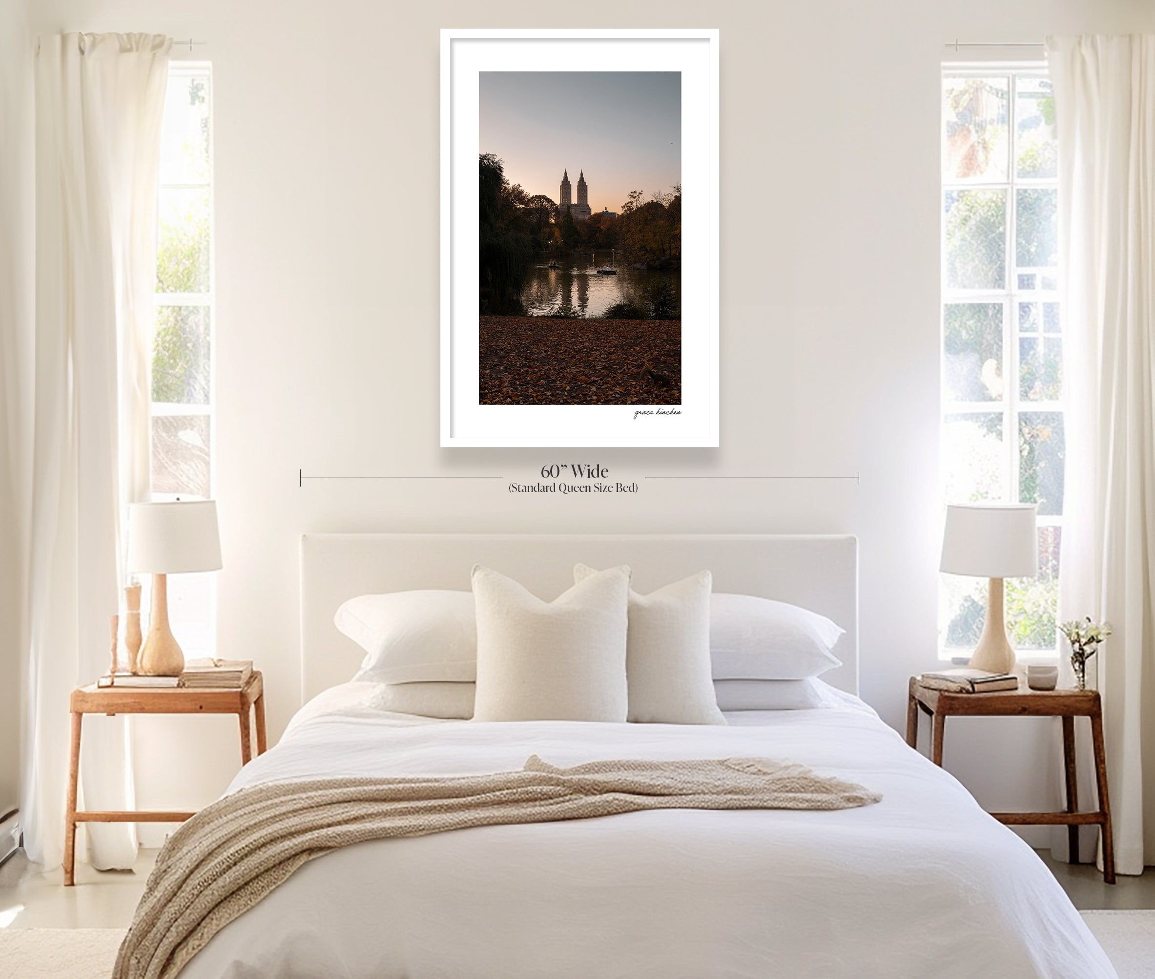 Rowboats drift across Central Park Lake beneath Manhattan's San Remo as autumn takes center stage. Shot October 2024.