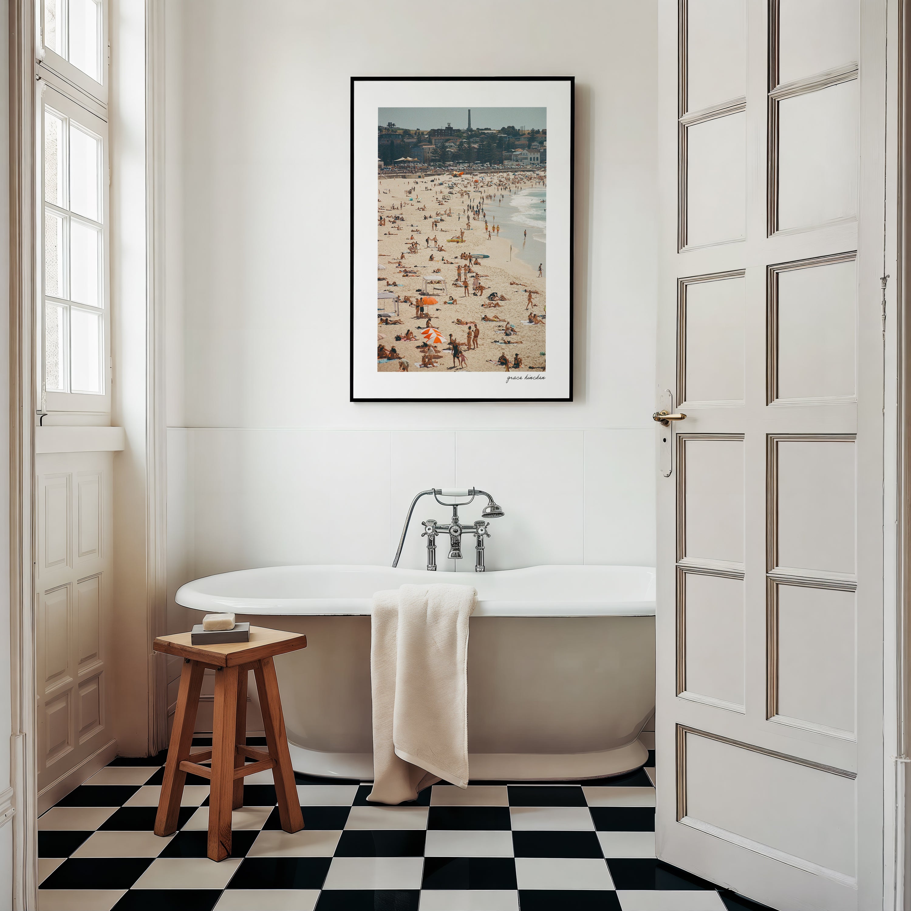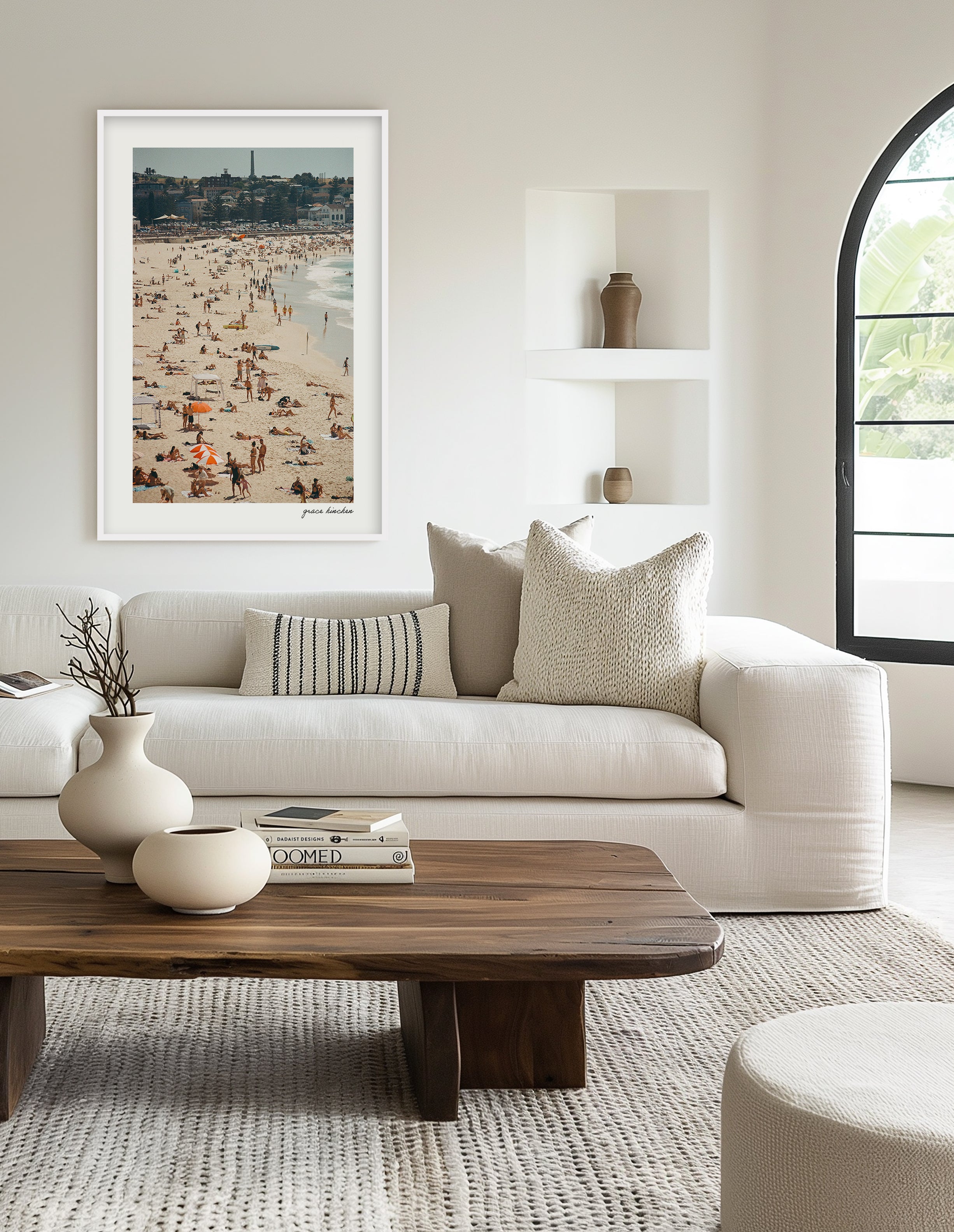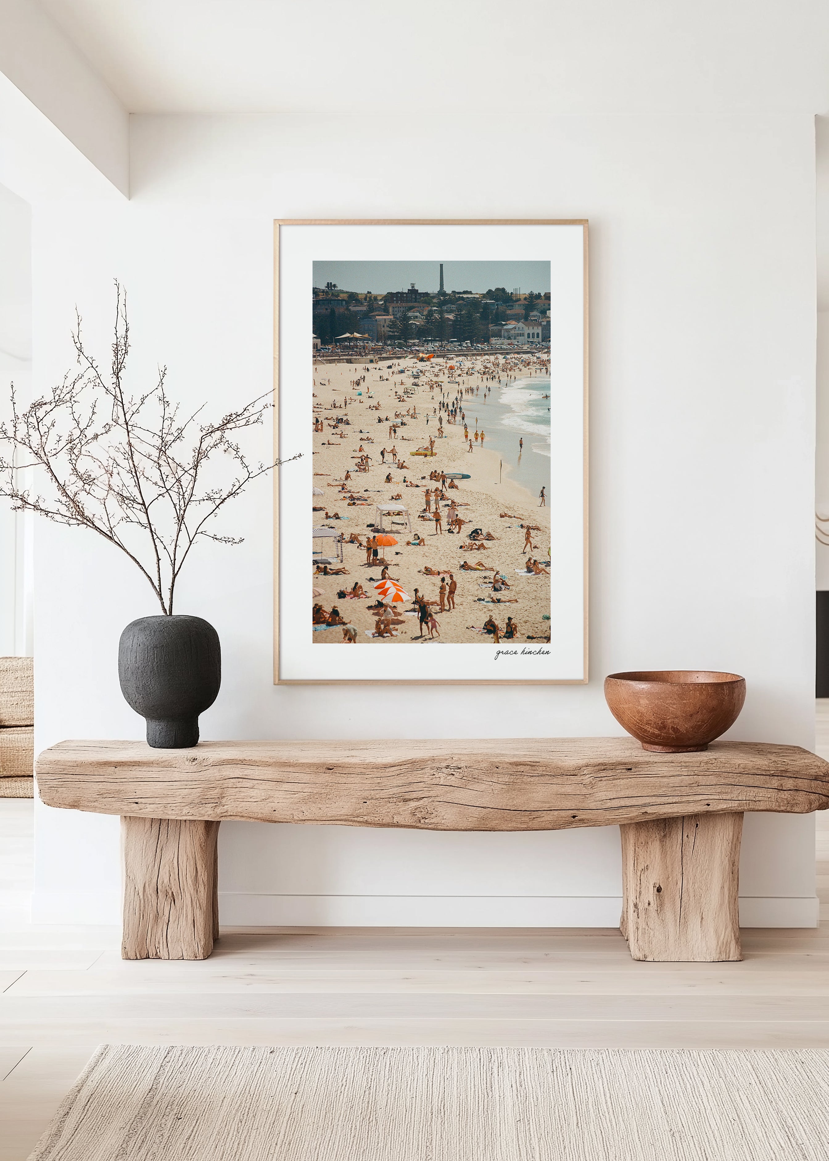 Bondi Beach view facing North Bondi, showing the stretch of sand filled with beachgoers, January 2025. Shot on film.