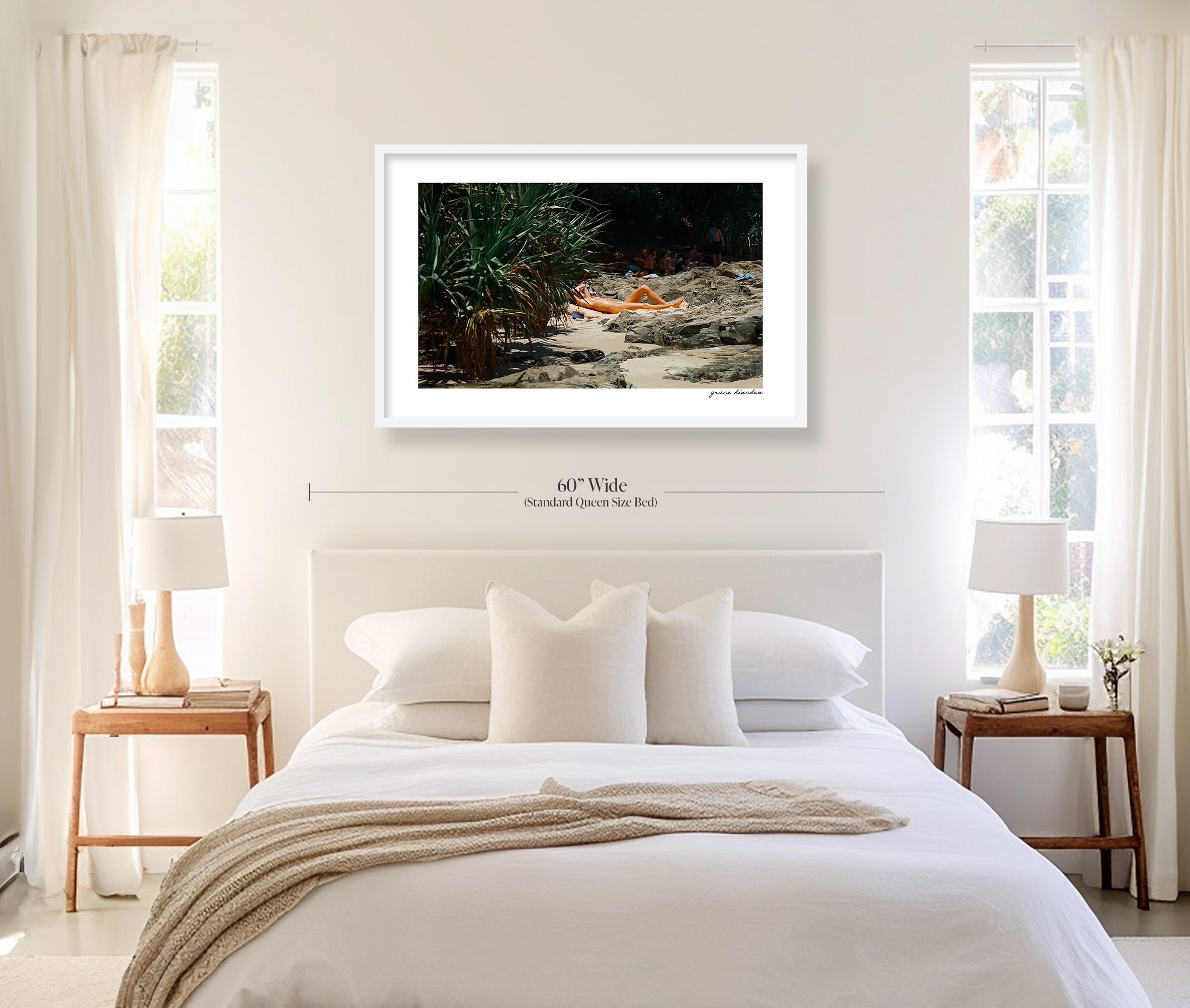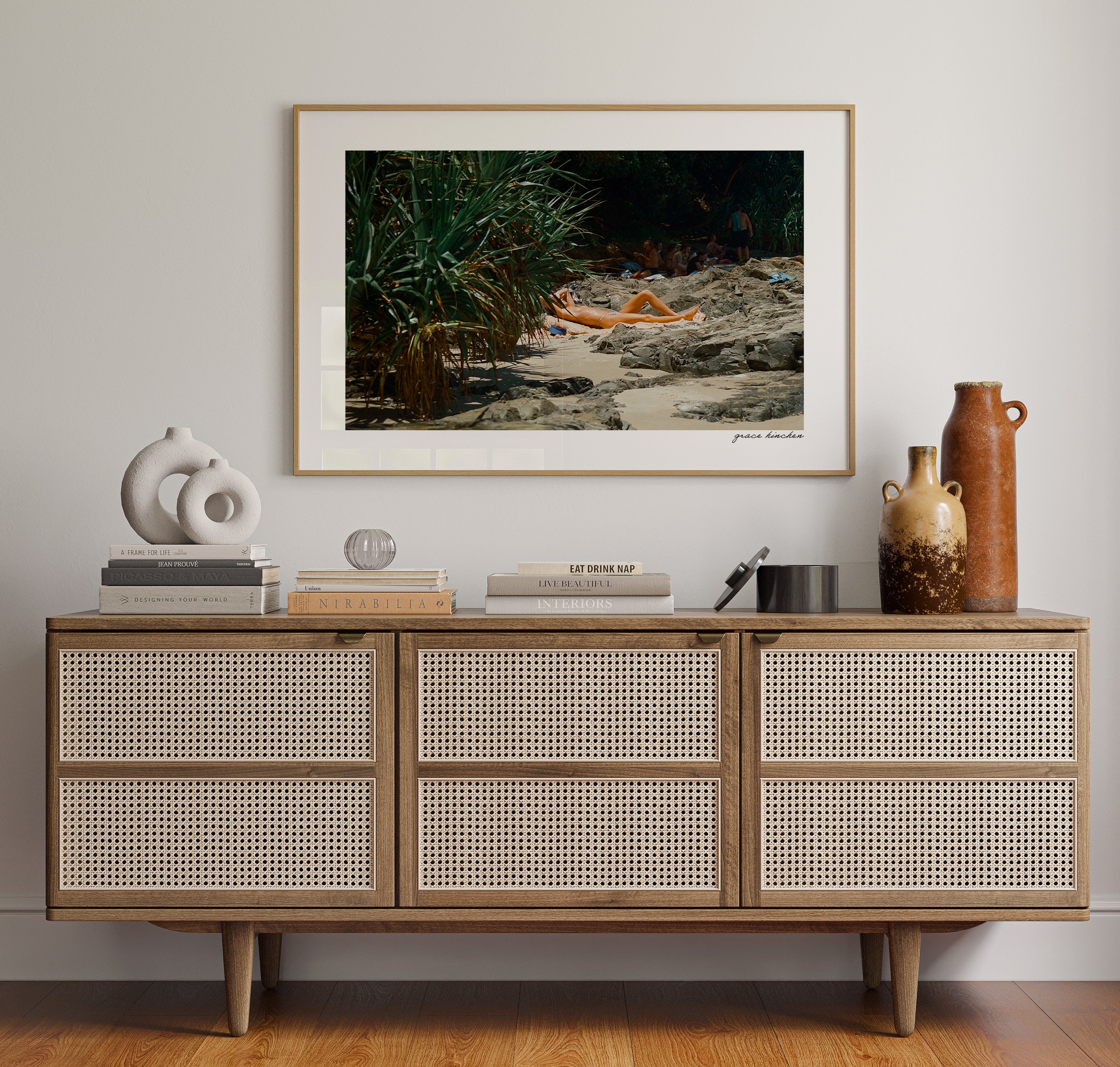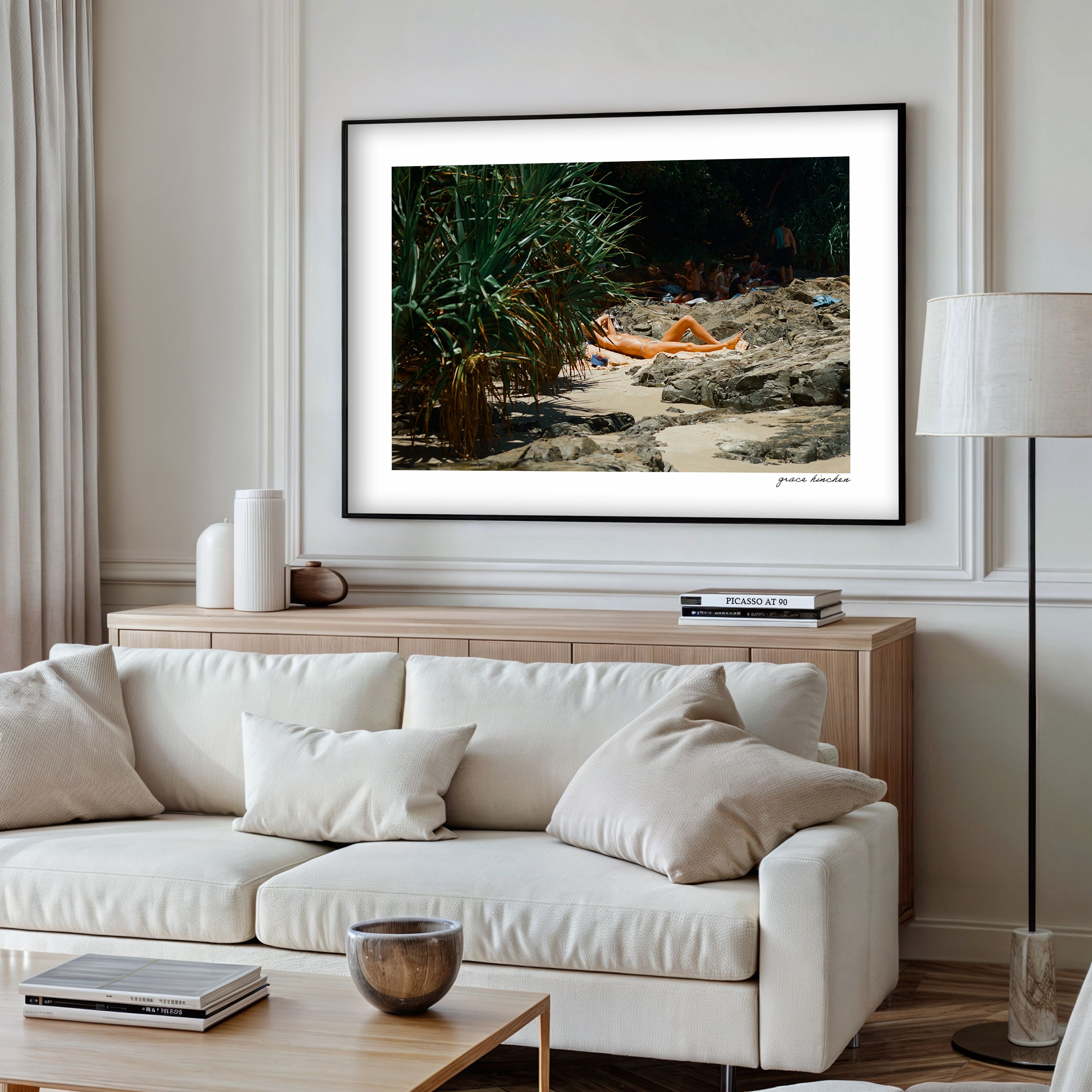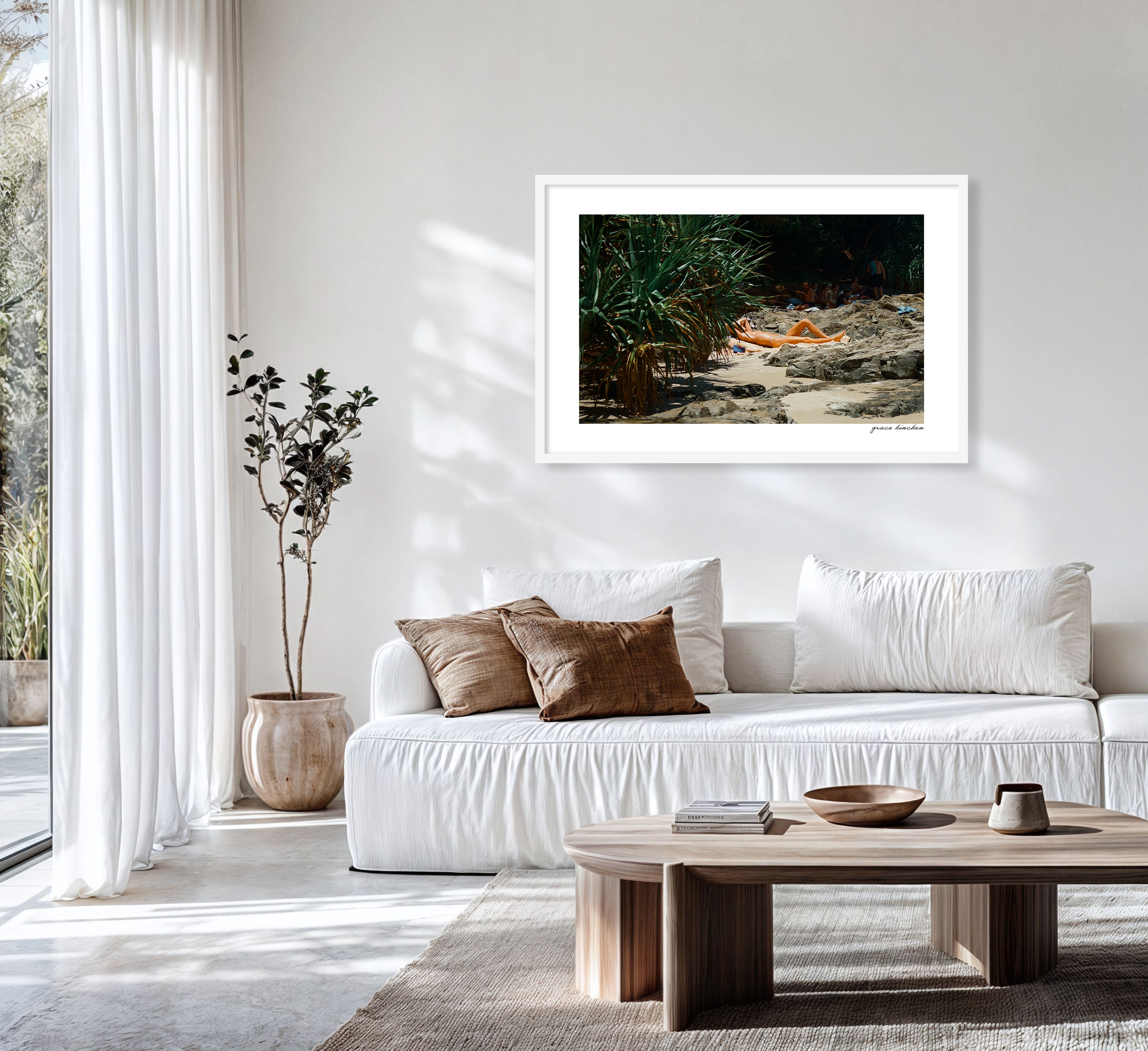 A woman sunbathes among rocks and palms in Byron Bay, savoring a quiet moment of summer stillness, January 2025. Shot on film.