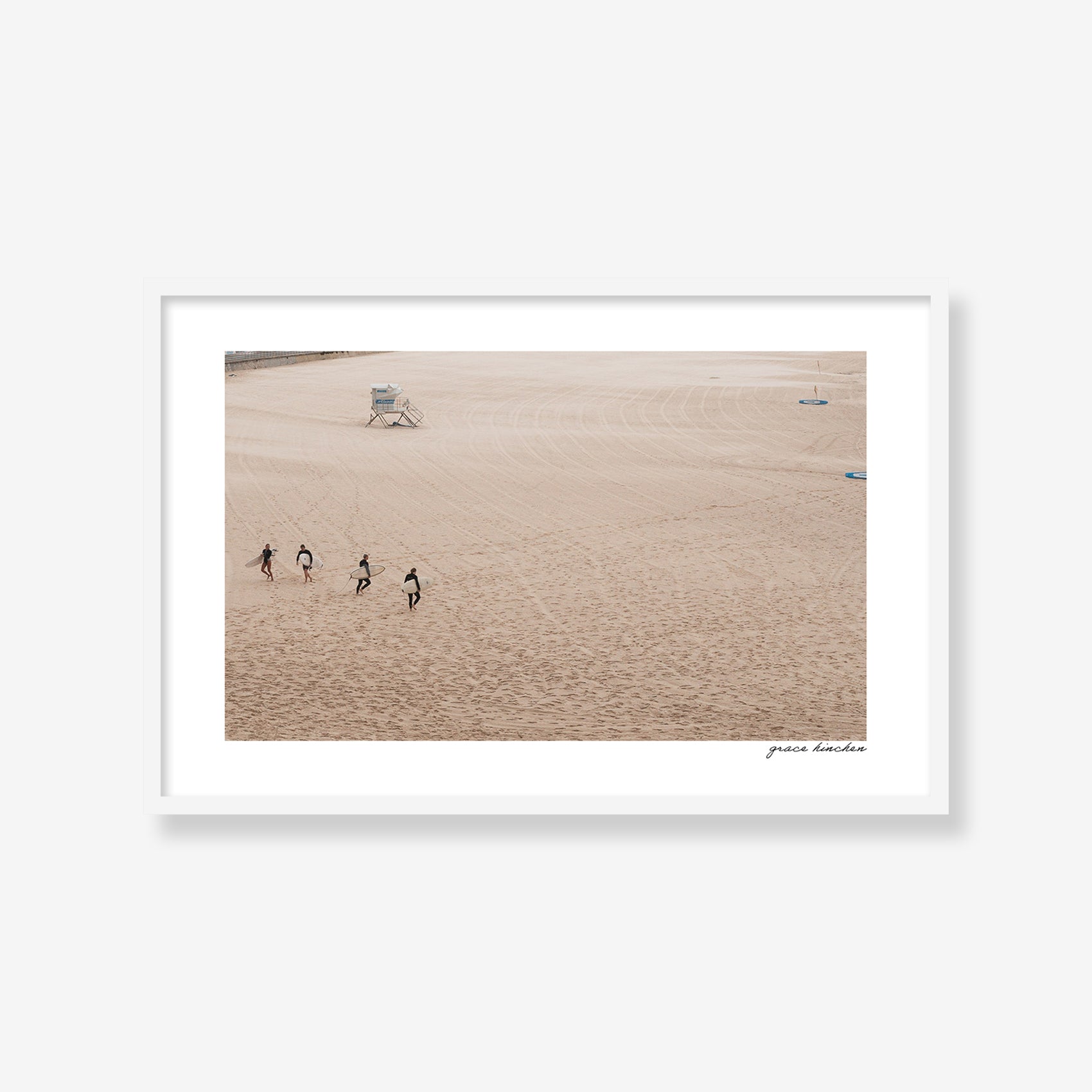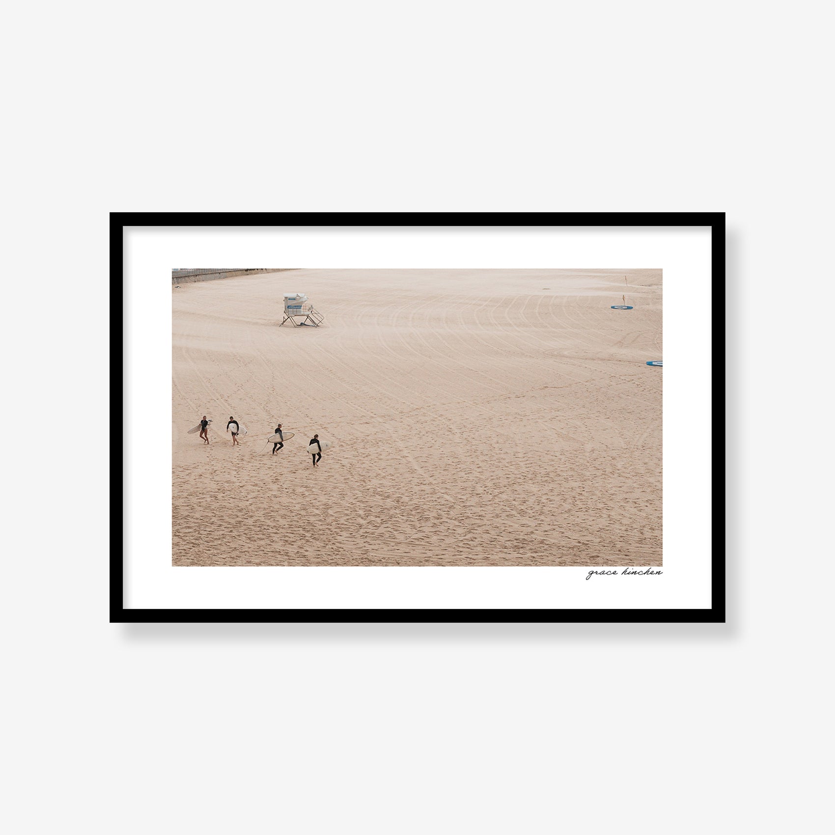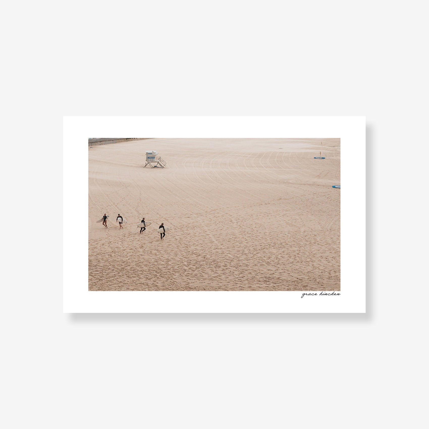 A quiet moment of changeover at Bondi Beach as surfers enter and exit the water, January 2025.