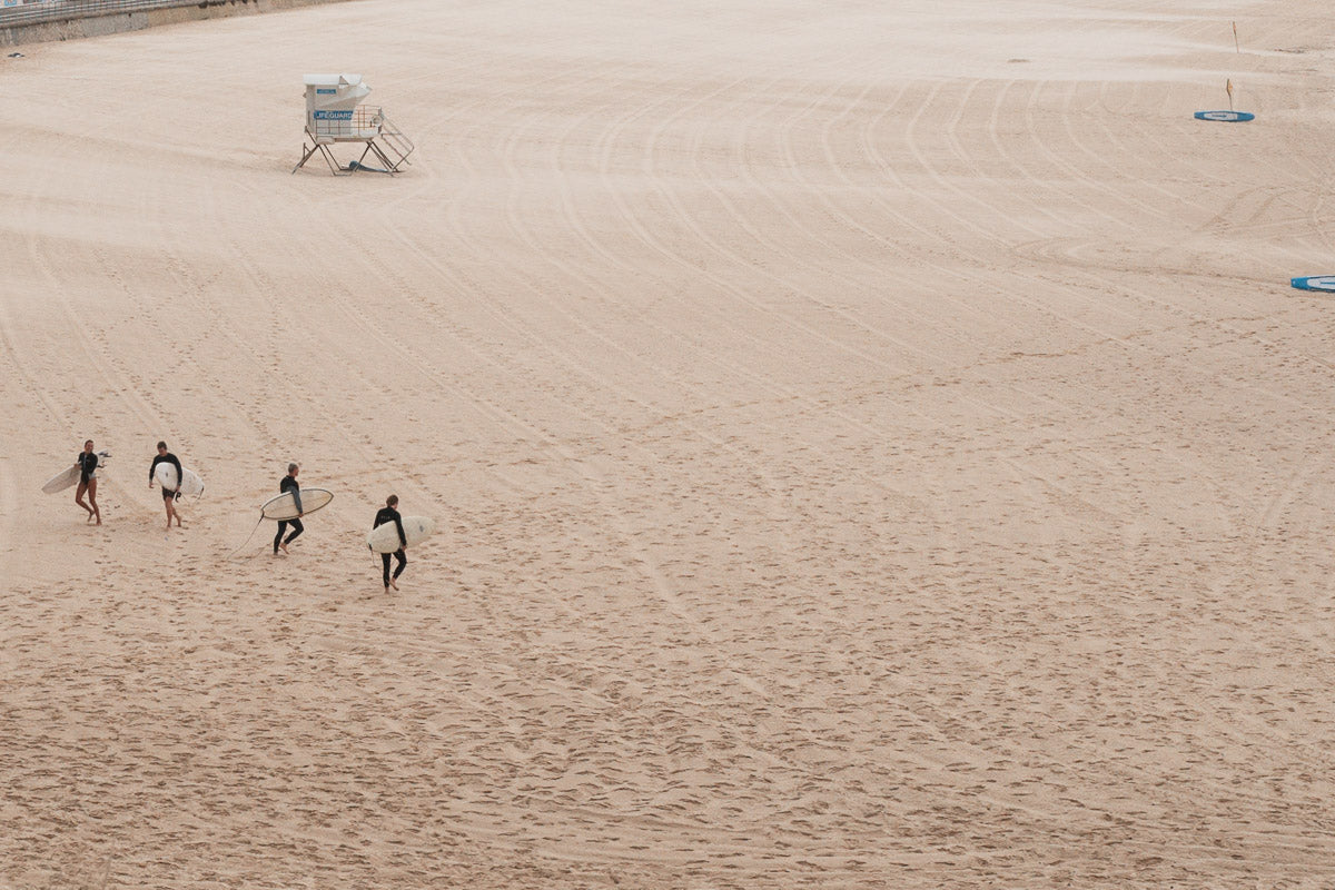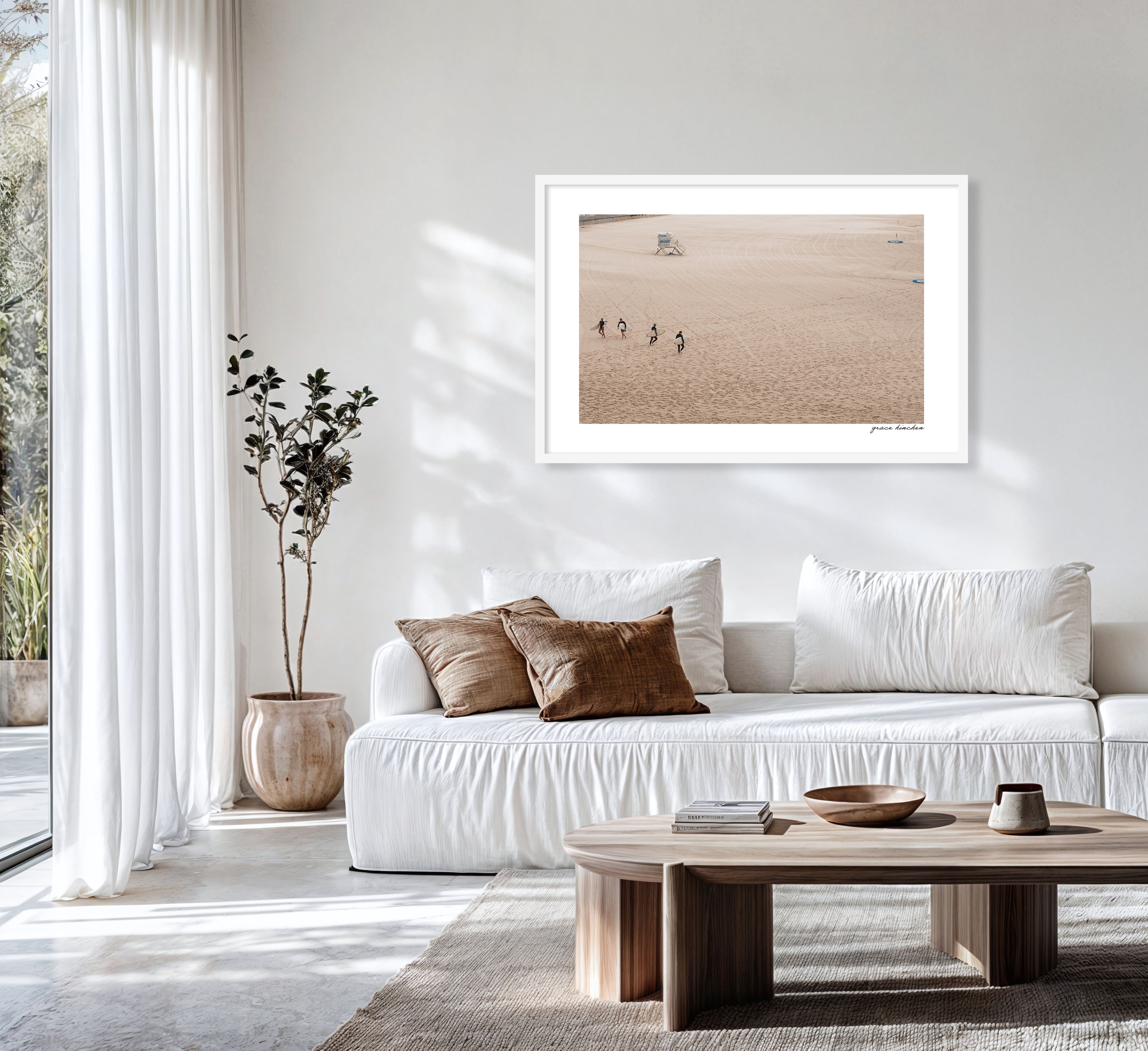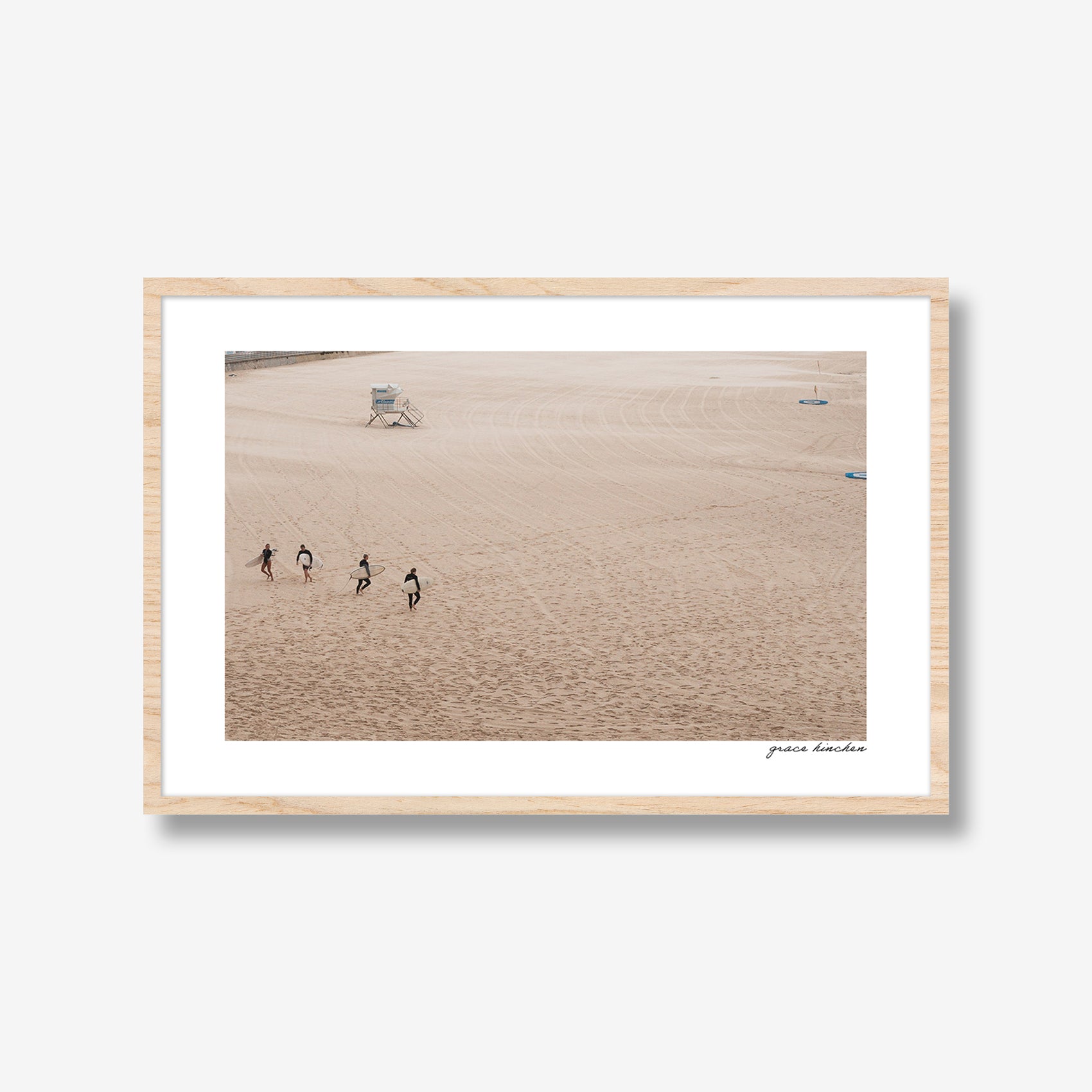 A quiet moment of changeover at Bondi Beach as surfers enter and exit the water, January 2025.