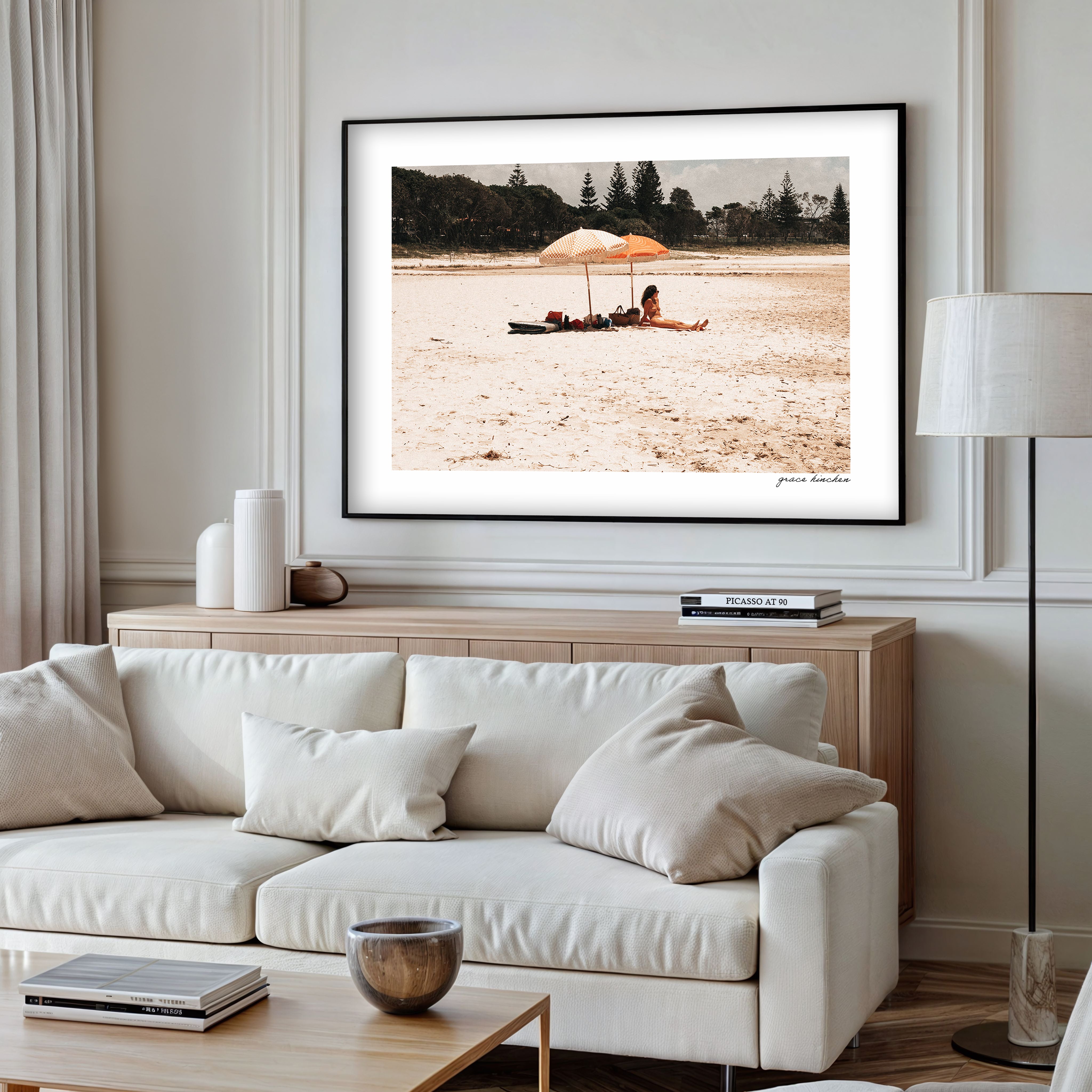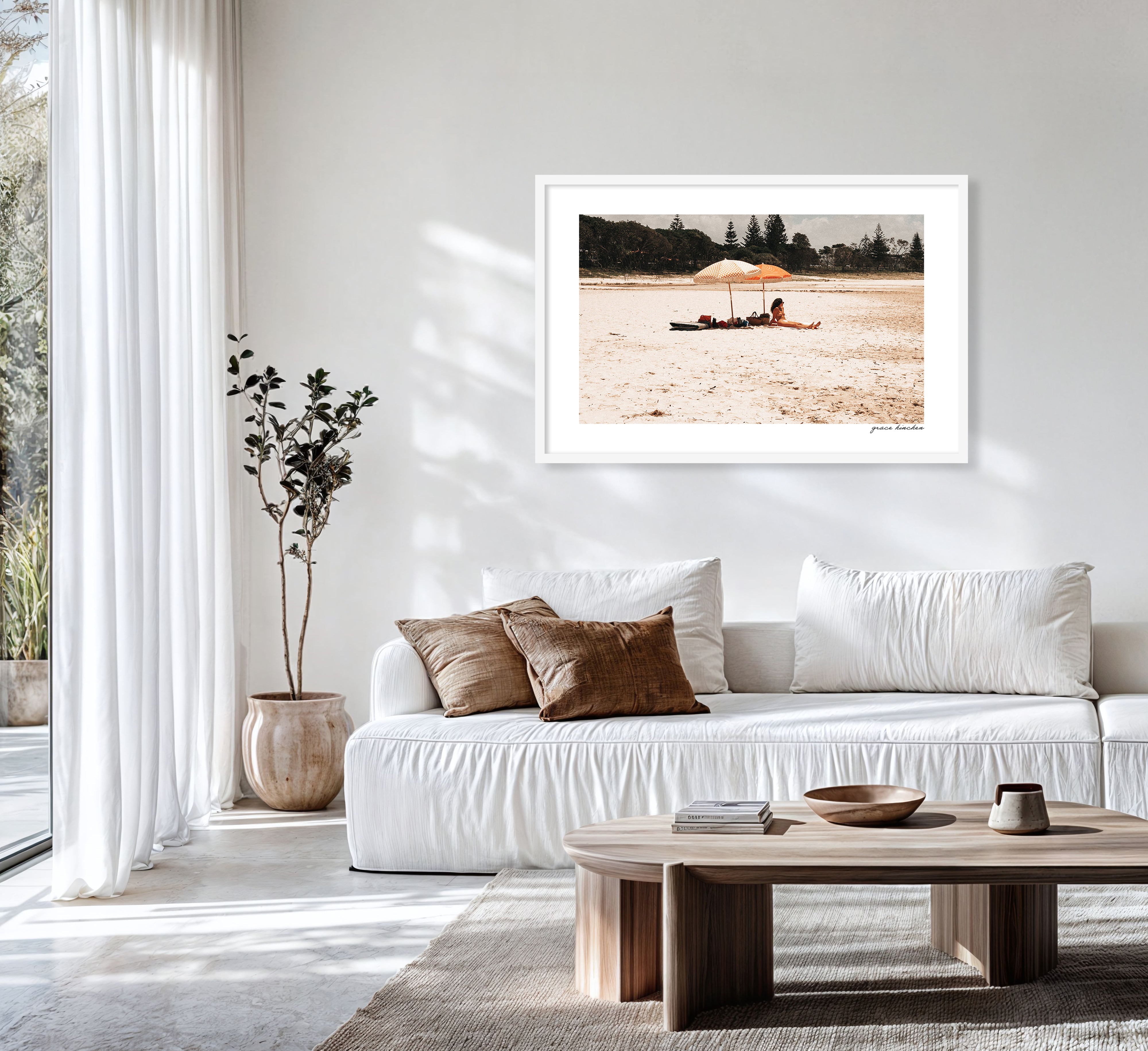 A woman sits topless on the quiet sands of Clarkes Beach, enjoying the solitude of a summer day in Byron Bay, January 2025.