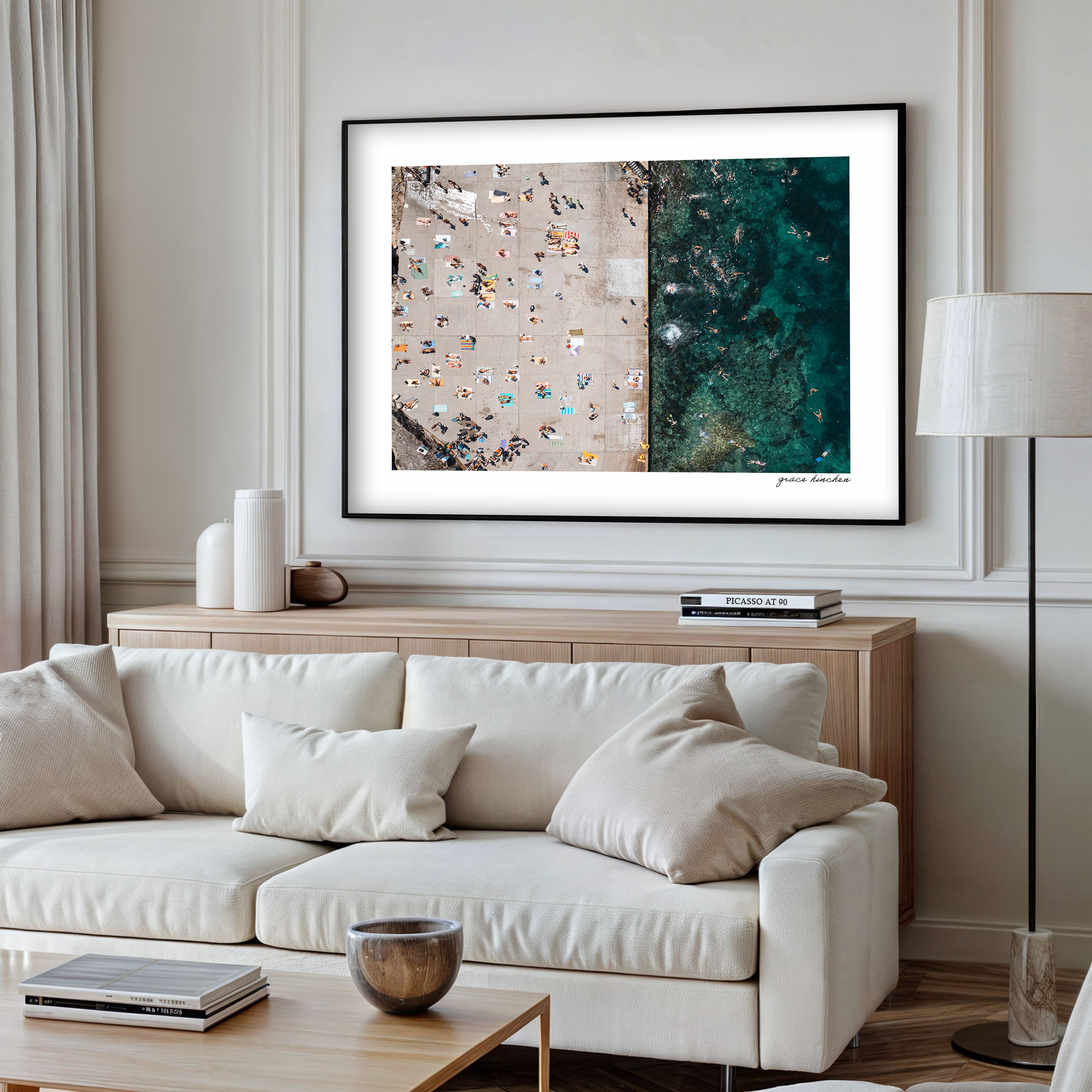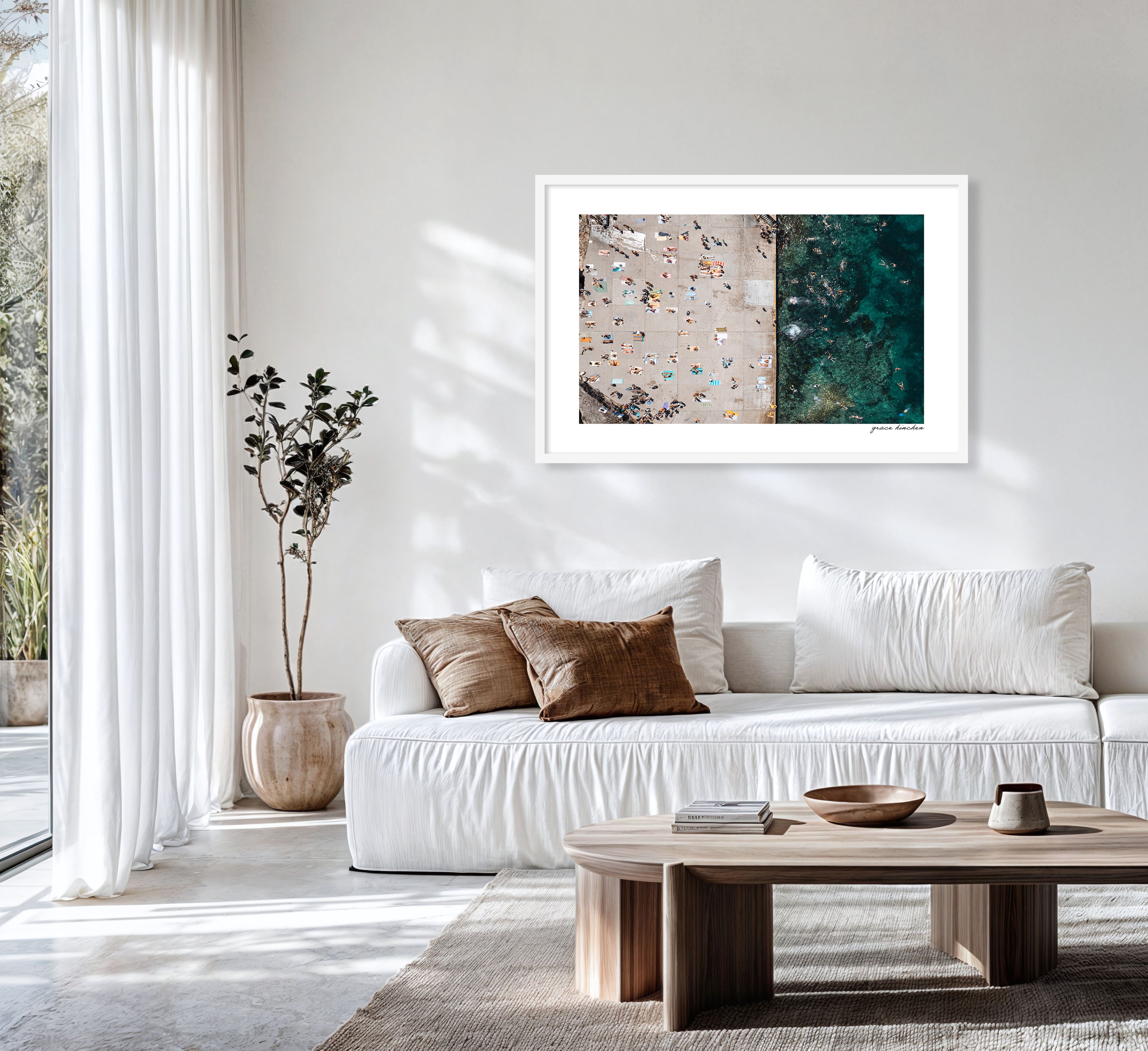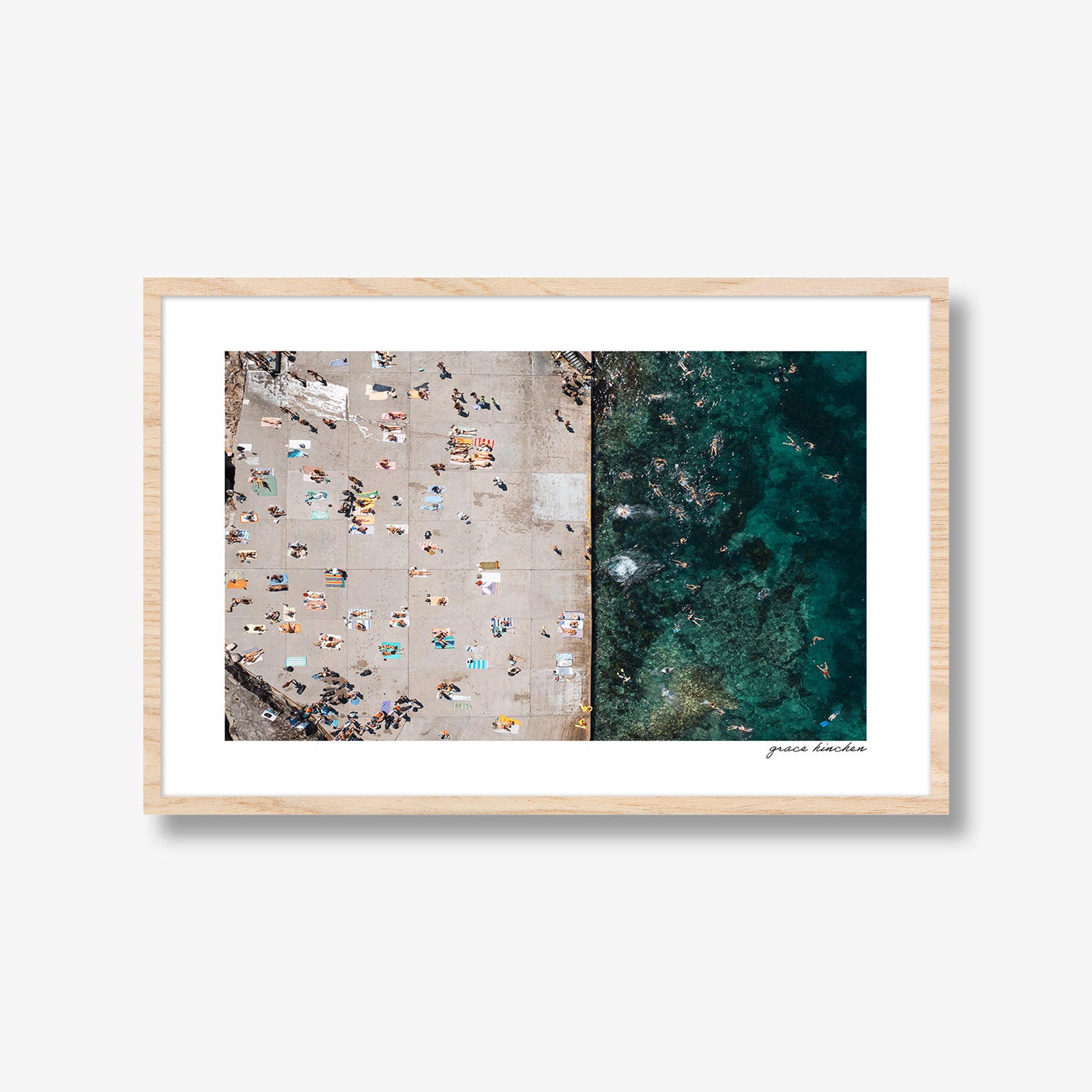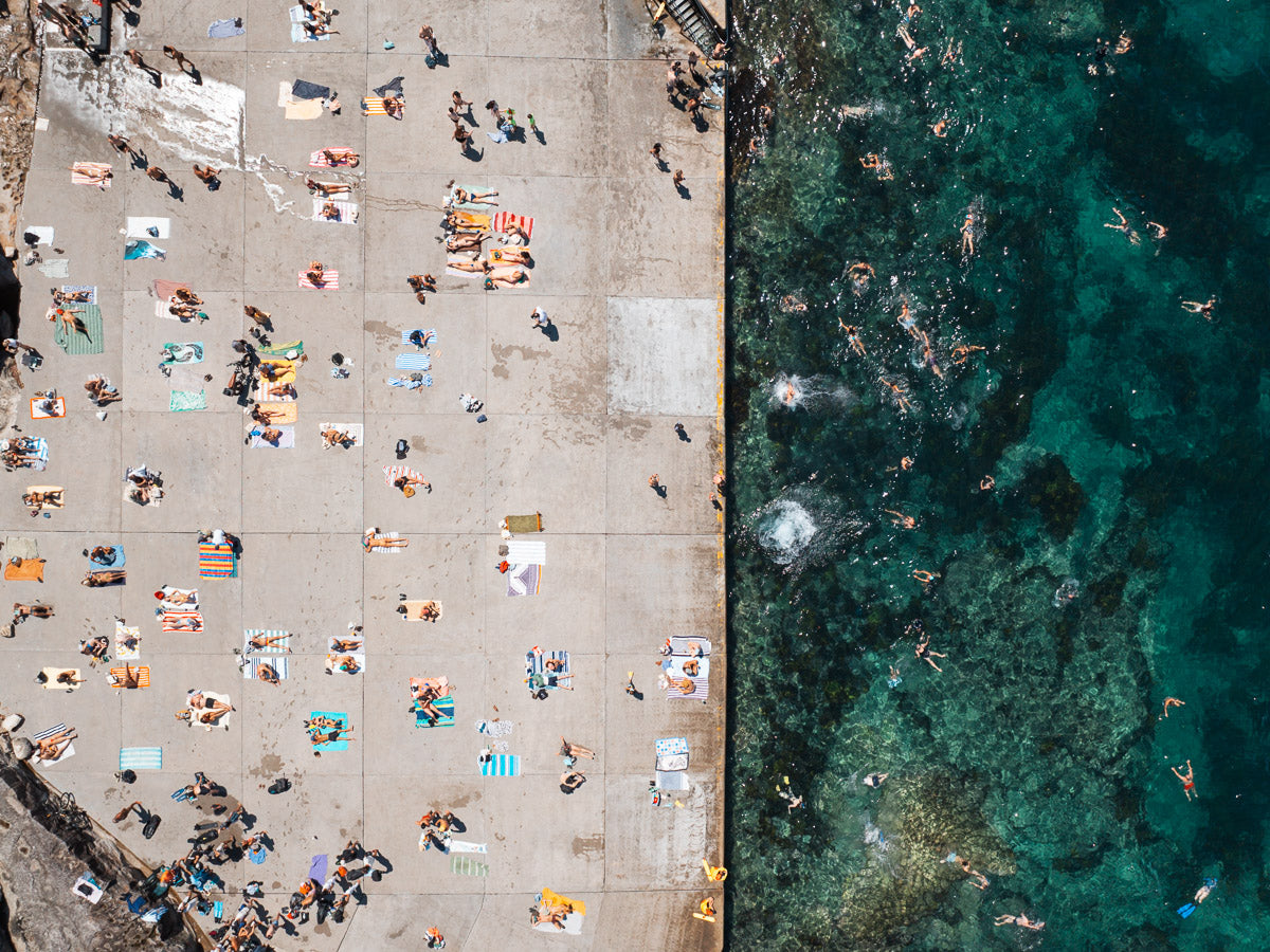 A view of swimmers mid-stroke and sunbathers at rest captures the gentle rhythm of Clovelly Beach on a summer day, January 2025. Shot by drone.