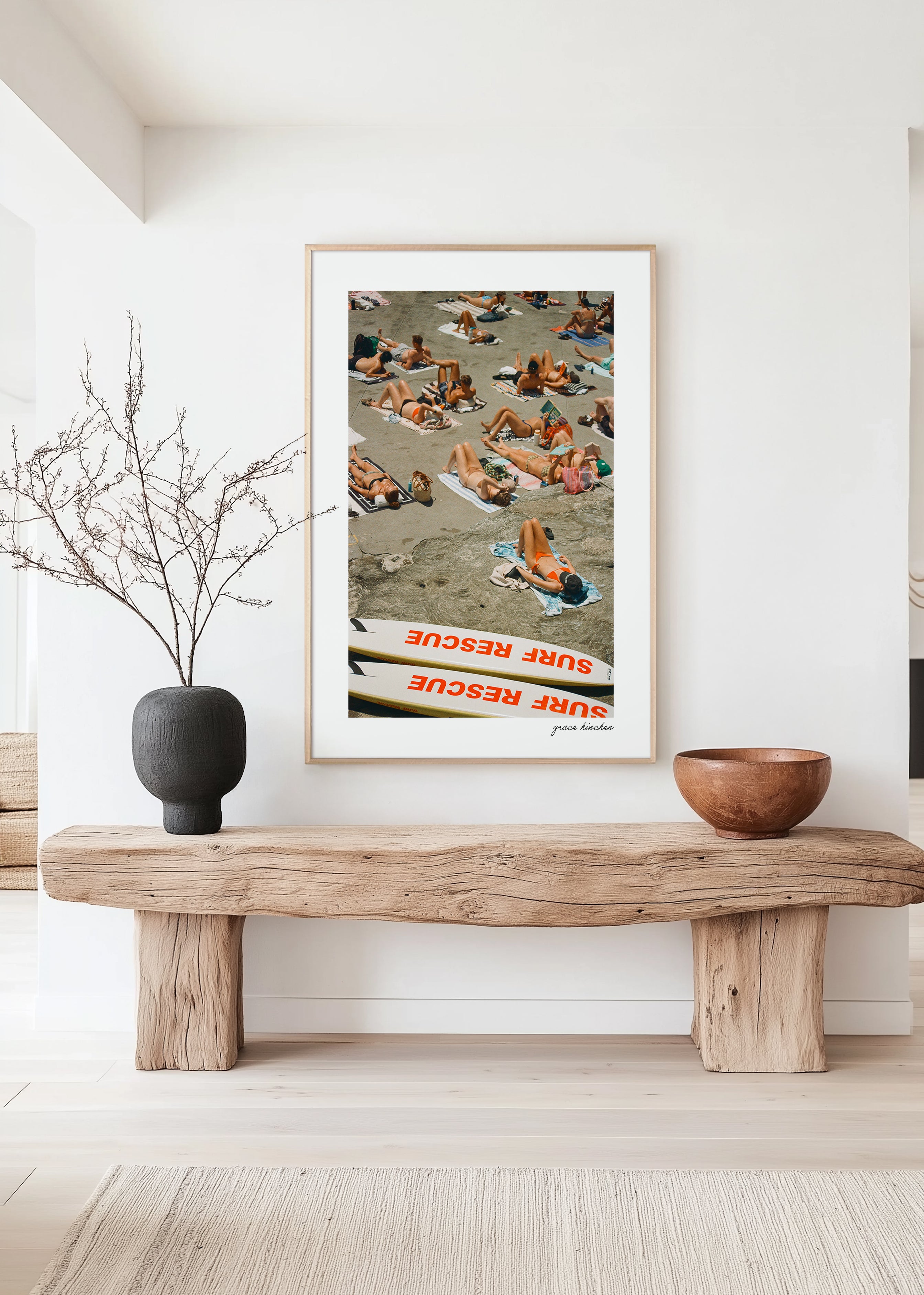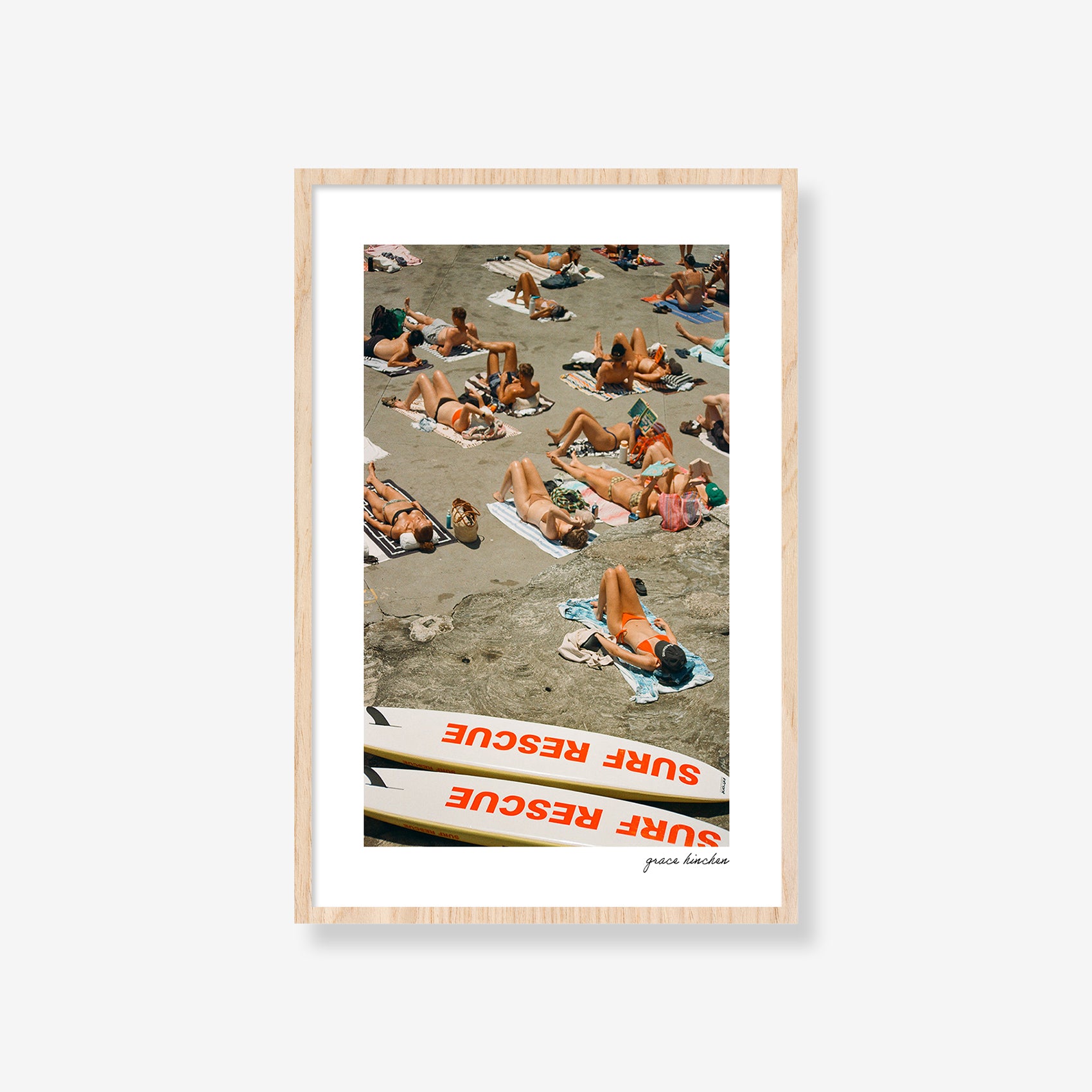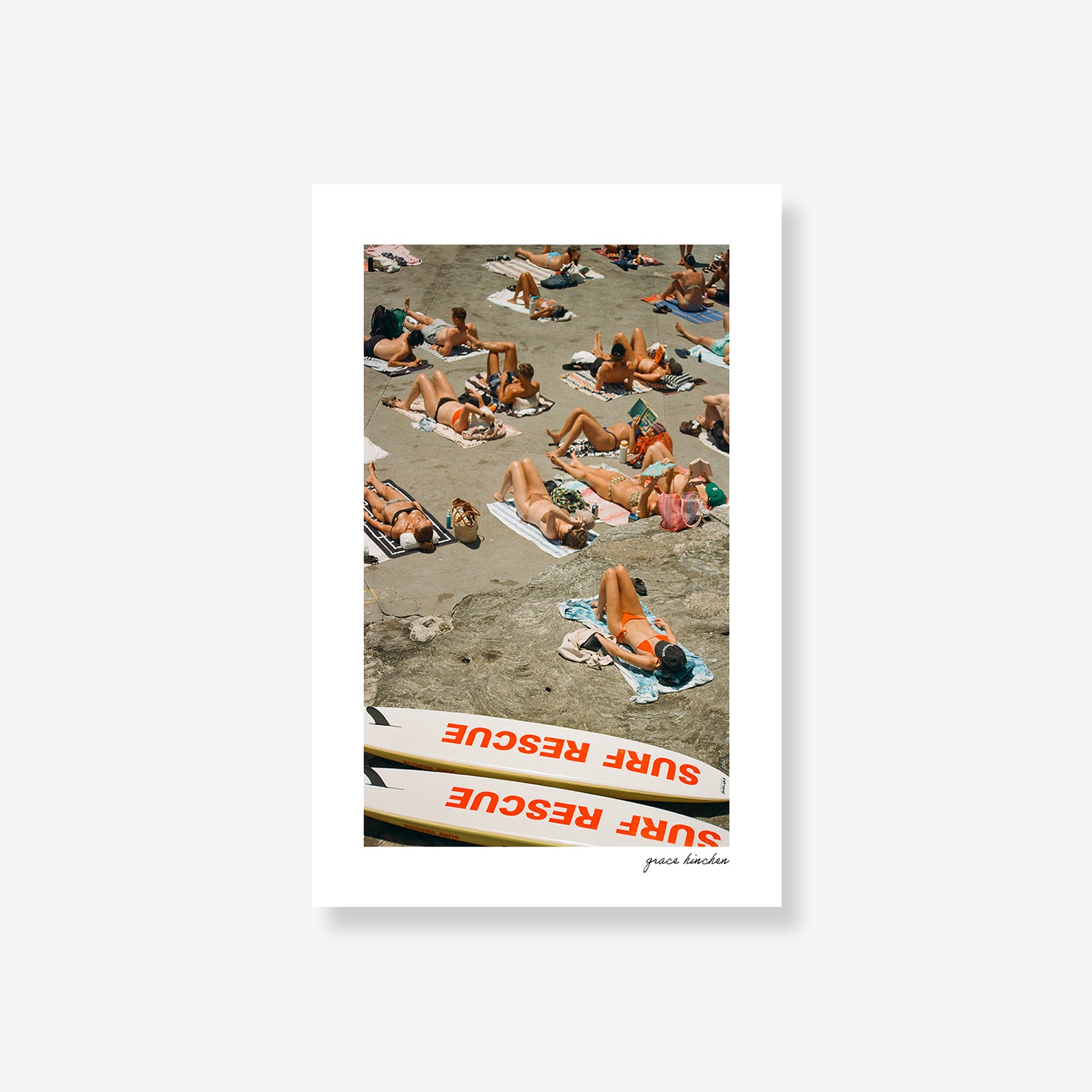 Surf rescue skis appear to sunbathe alongside beachgoers on the platform at Clovelly Beach, January 2025. Shot on film.