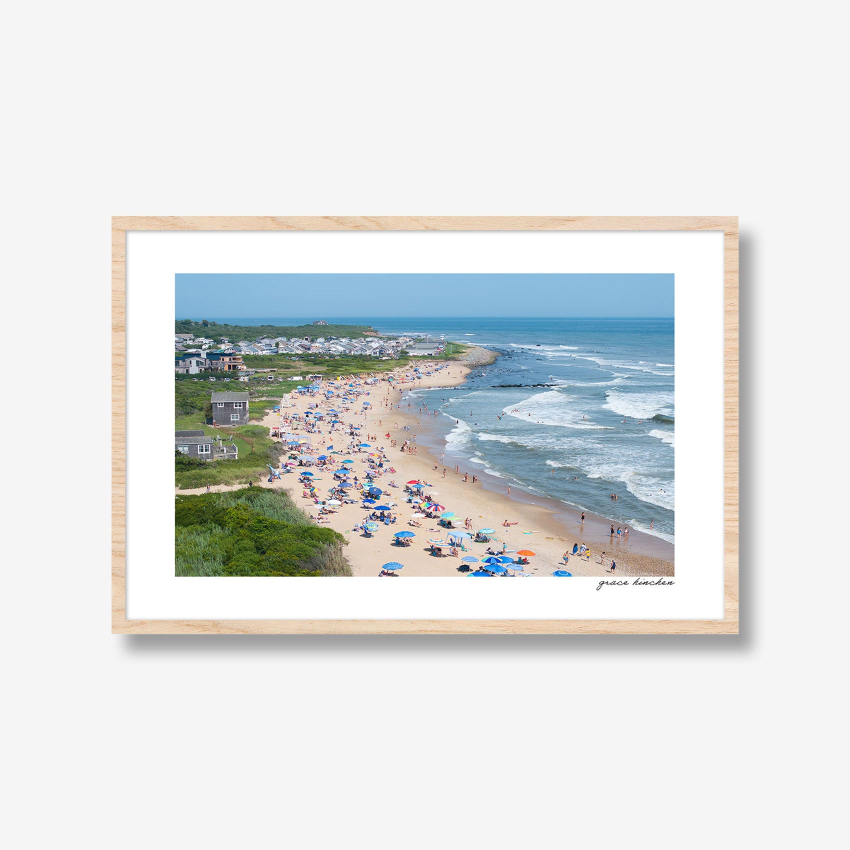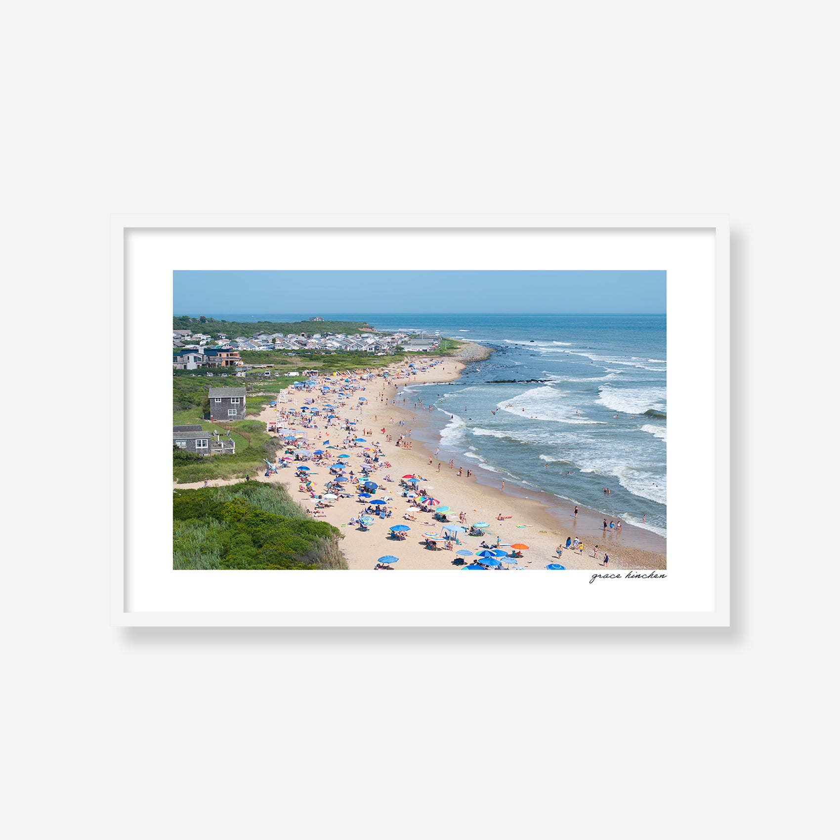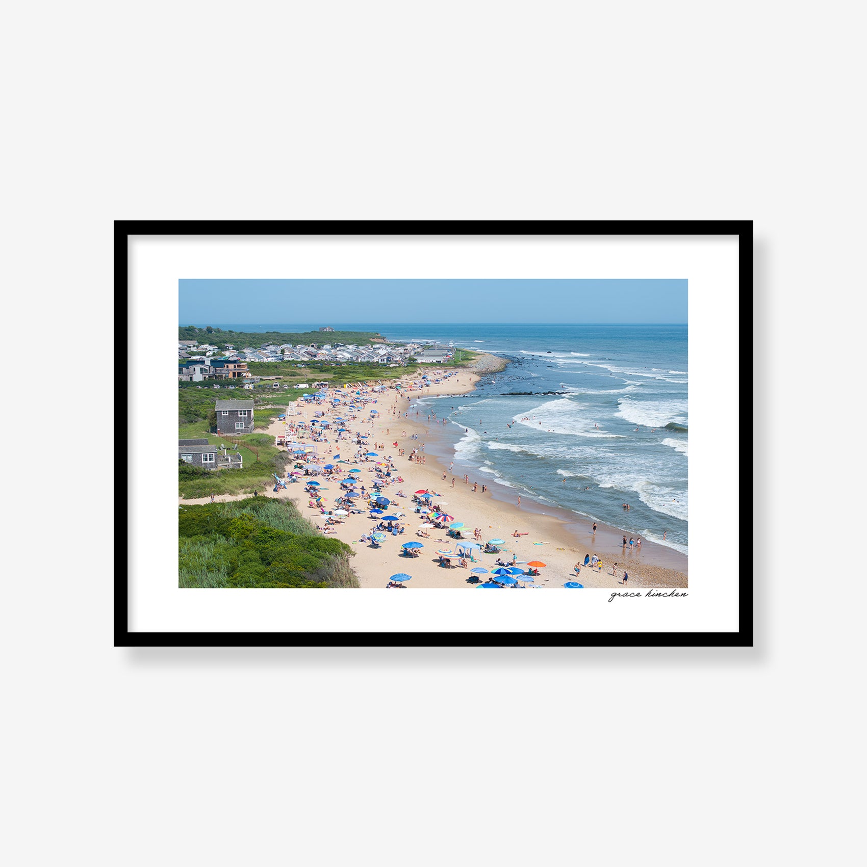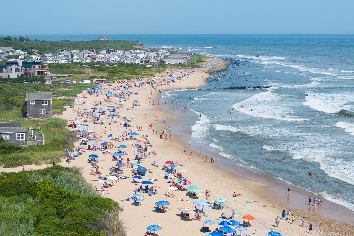 Aerial view of beachgoers on a crowded summer day at Ditch Plains Beach in Montauk, August 2024. Shot by drone.