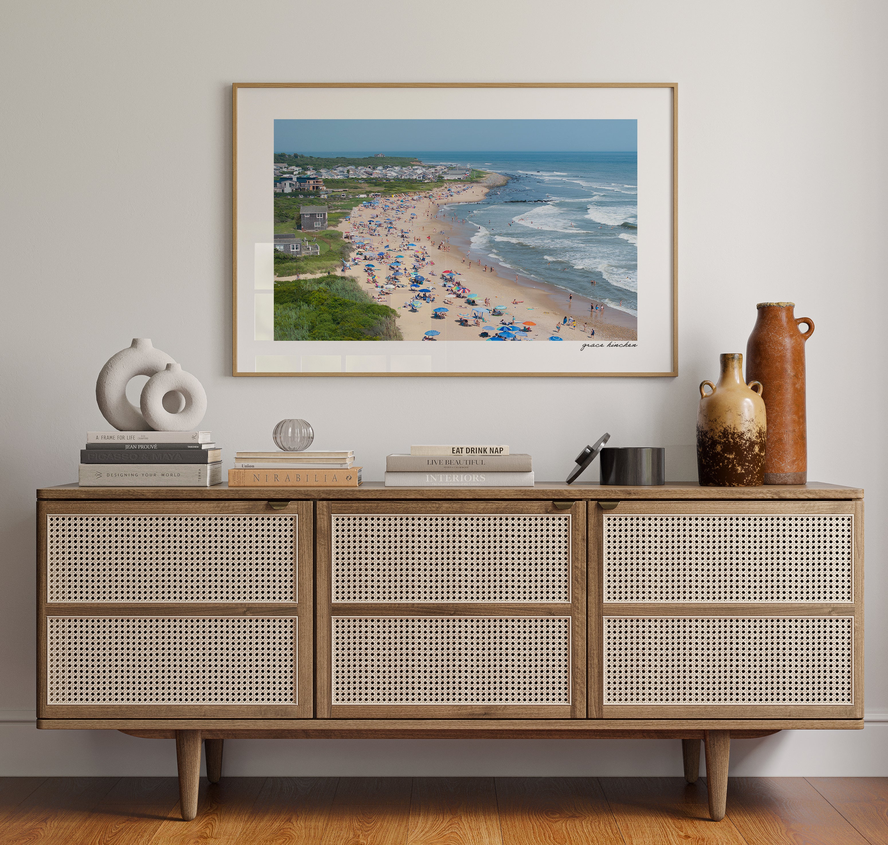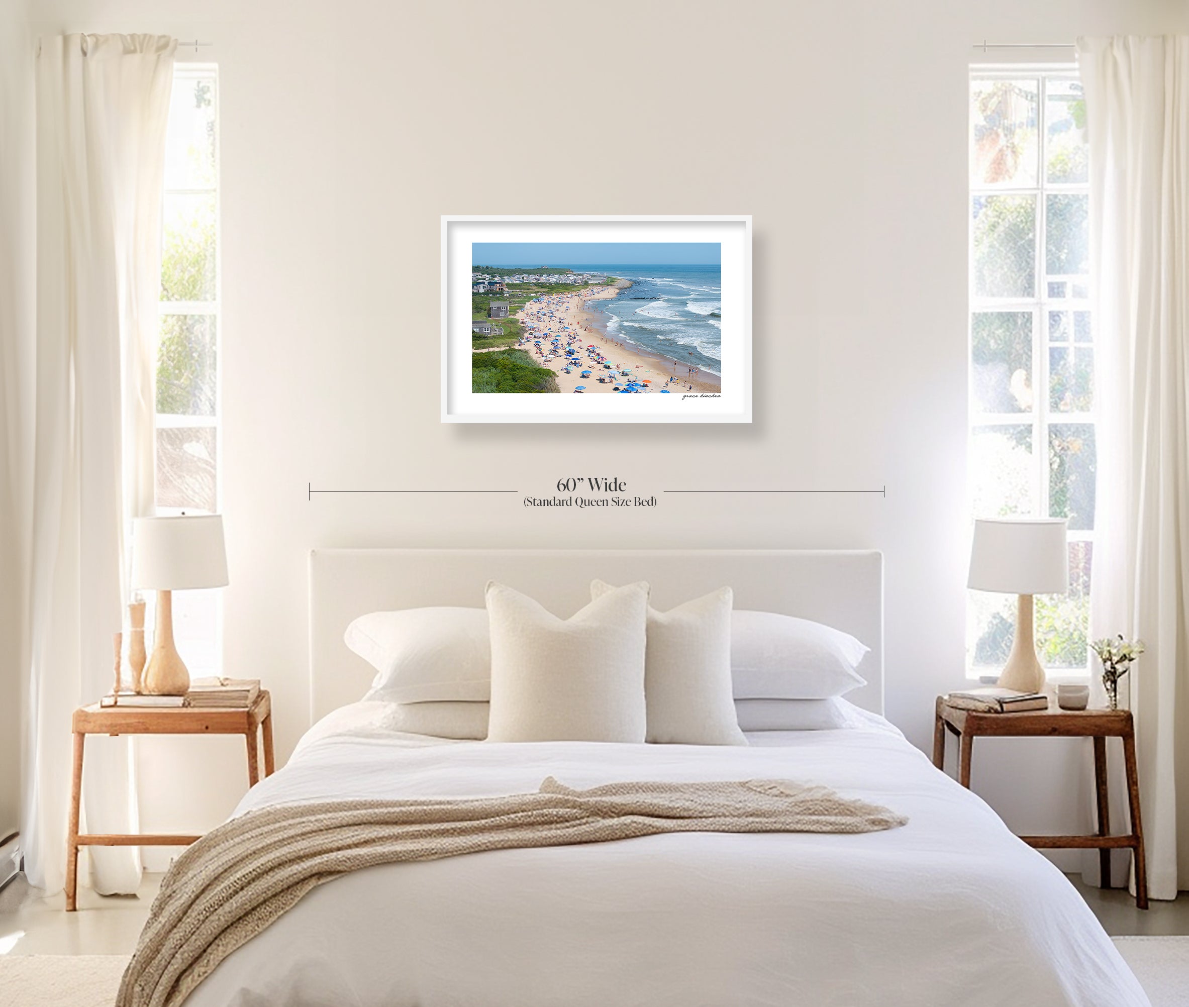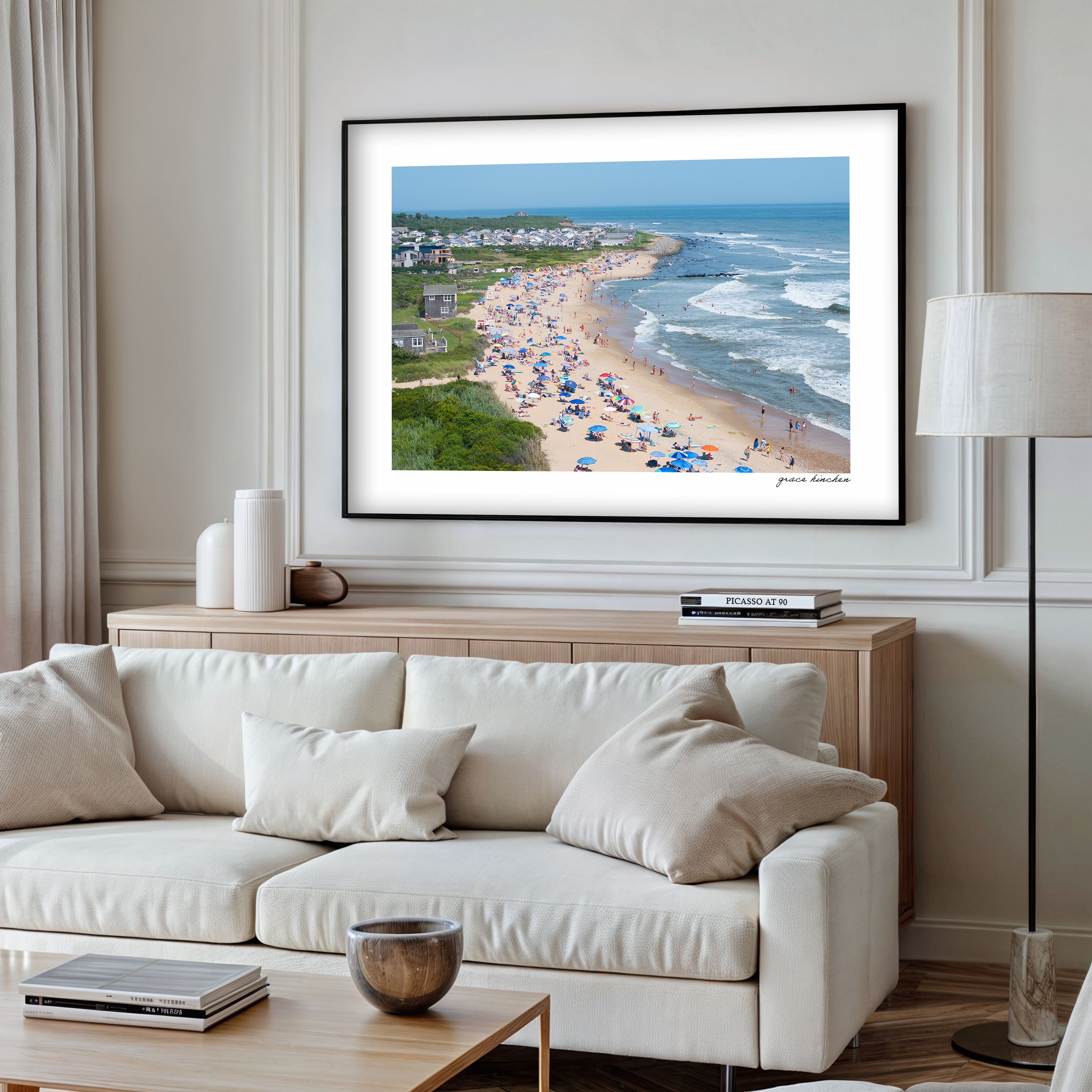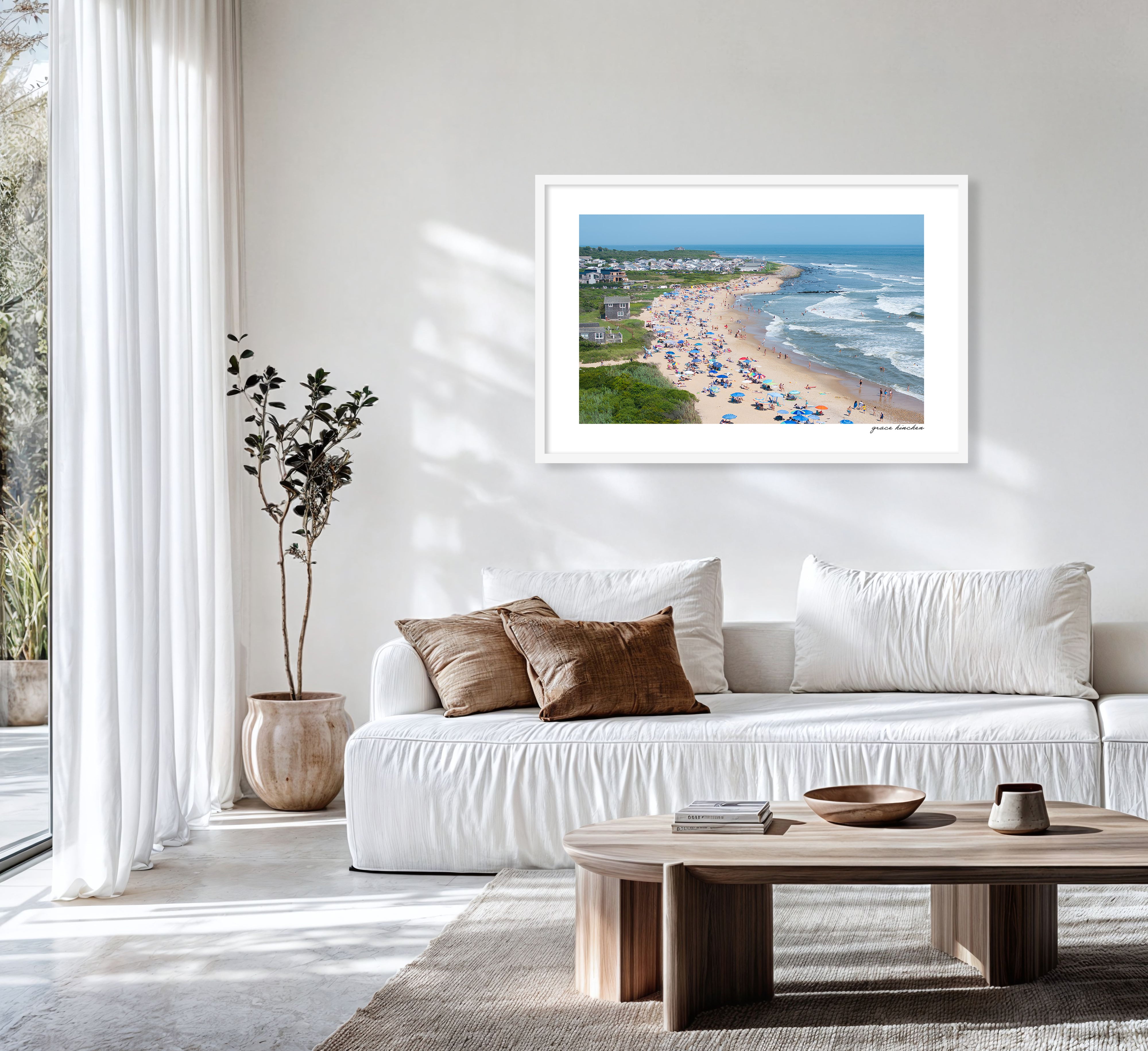Aerial view of beachgoers on a crowded summer day at Ditch Plains Beach in Montauk, August 2024. Shot by drone.