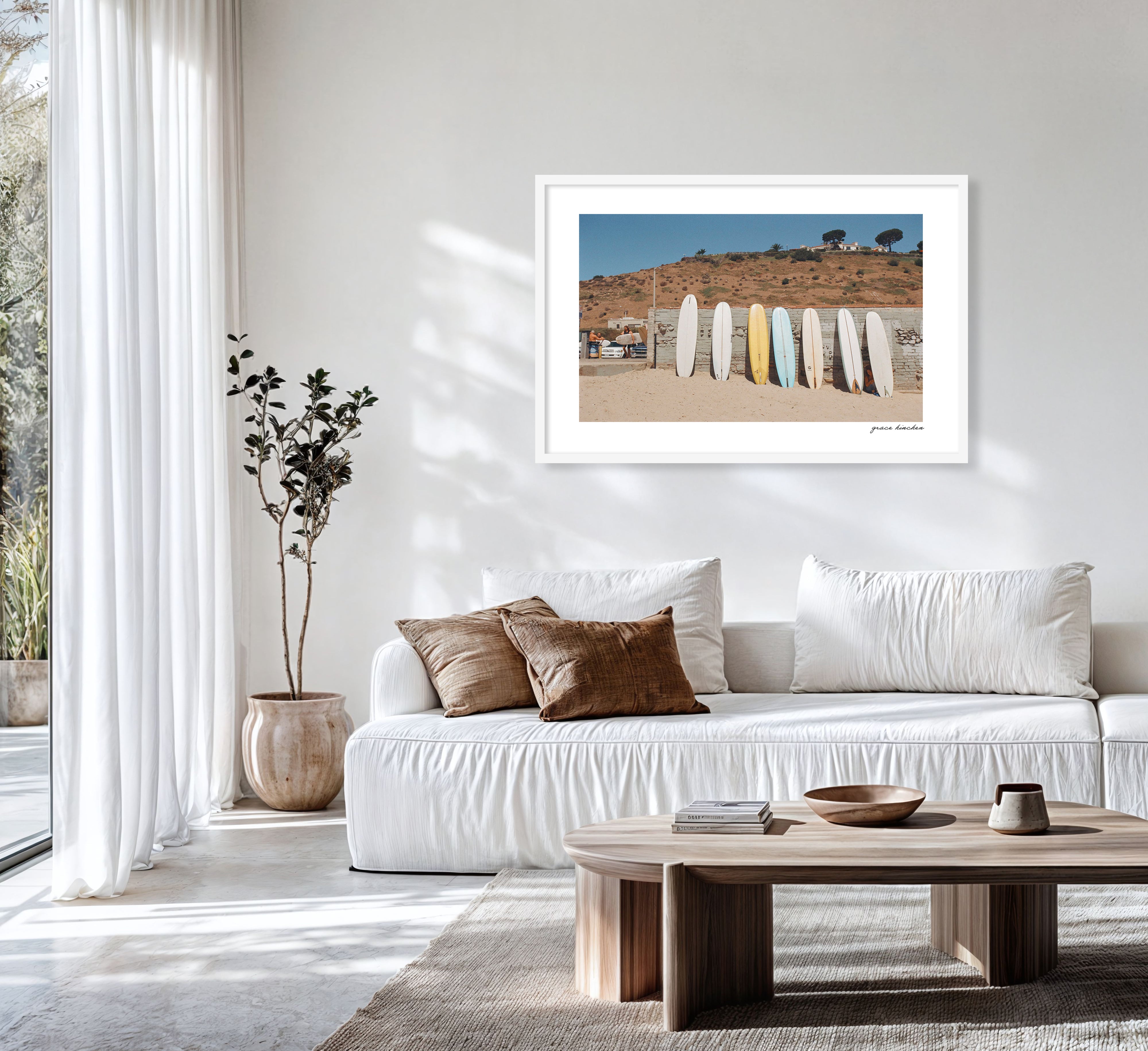 A woman finds shade behind surfboard's at Malibu's Surfrider Beach. Shot on film, August 2025.