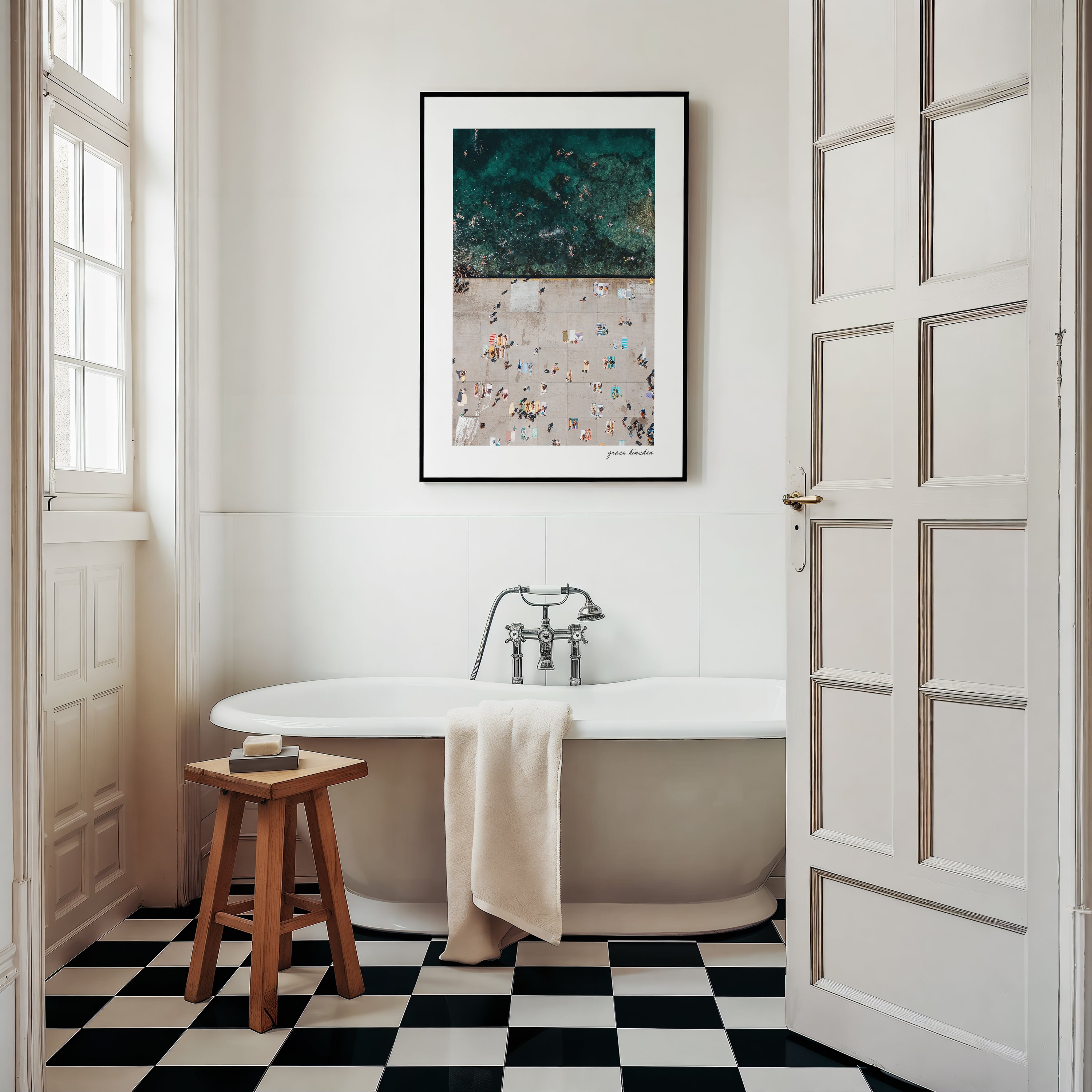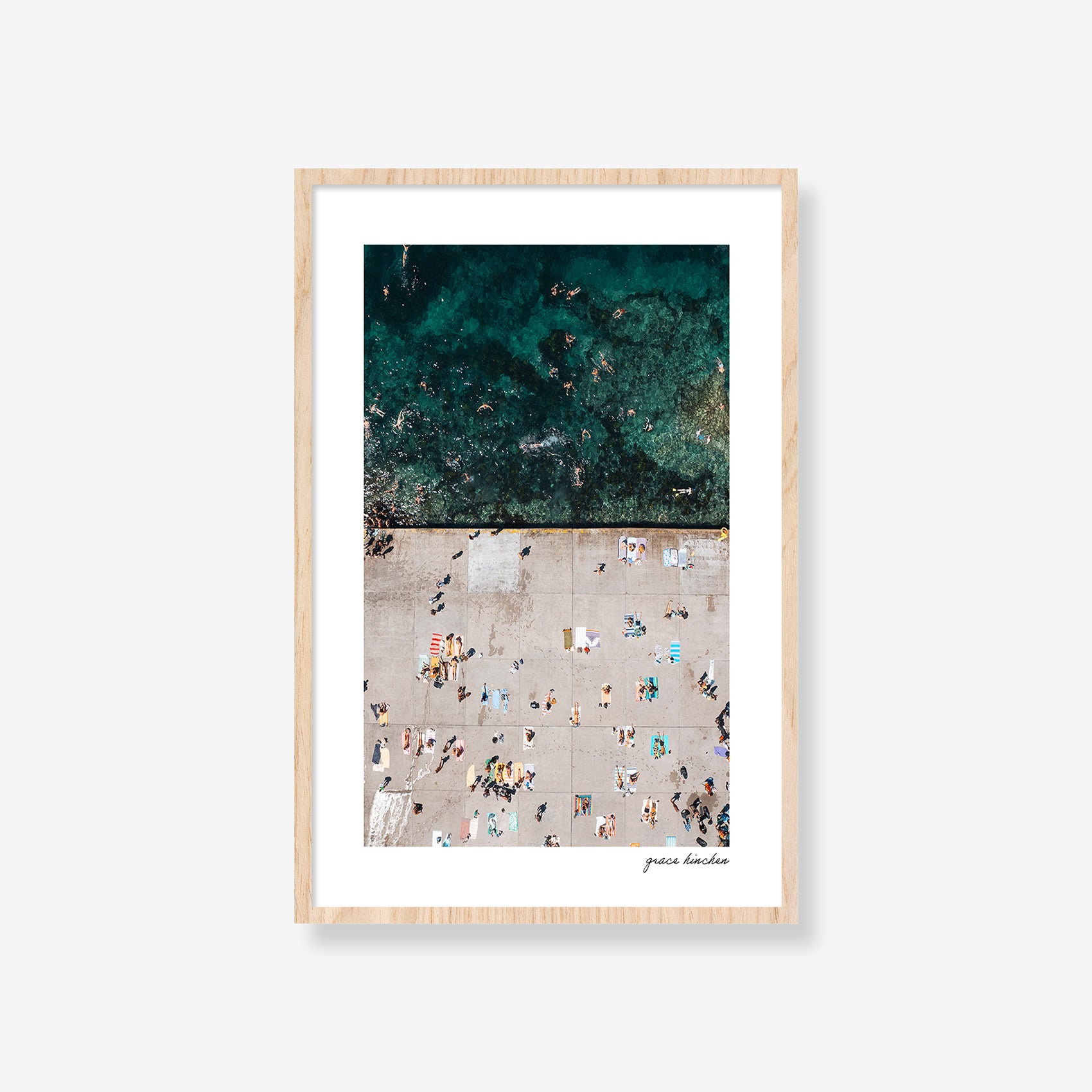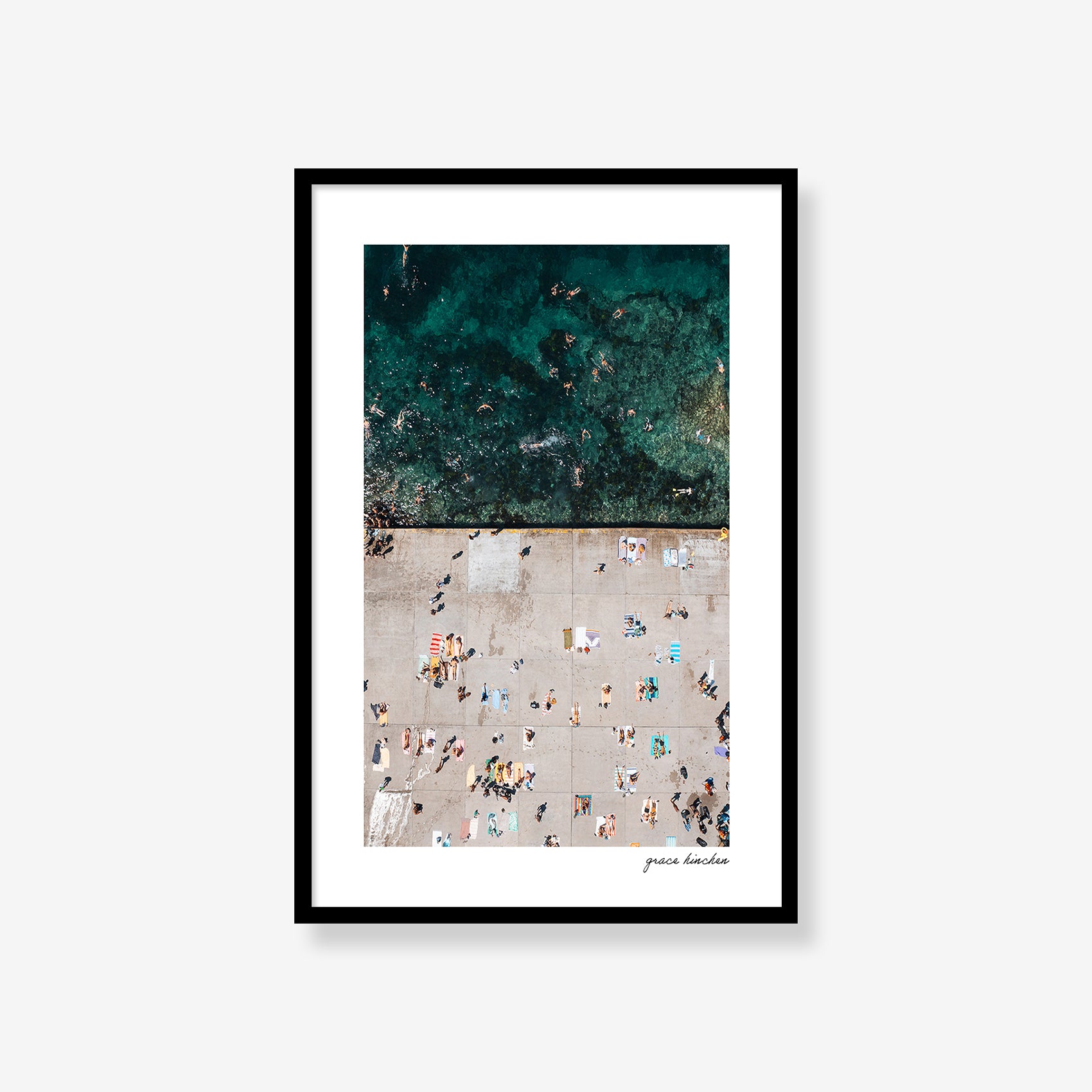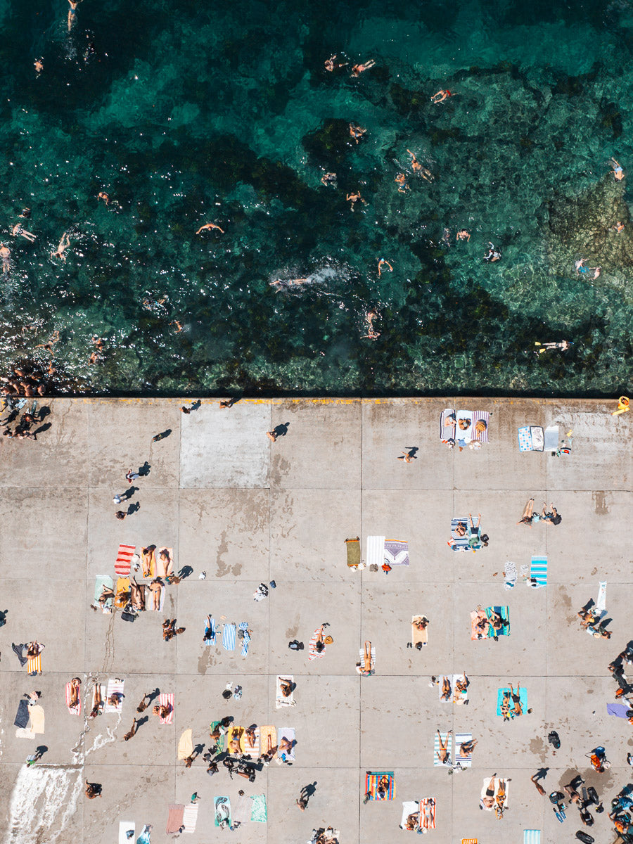 A top-down perspective reveals the joyful symmetry of Clovelly Beach: human shapes, sharp lines, and flowing water in constant dialogue. Shot by drone.