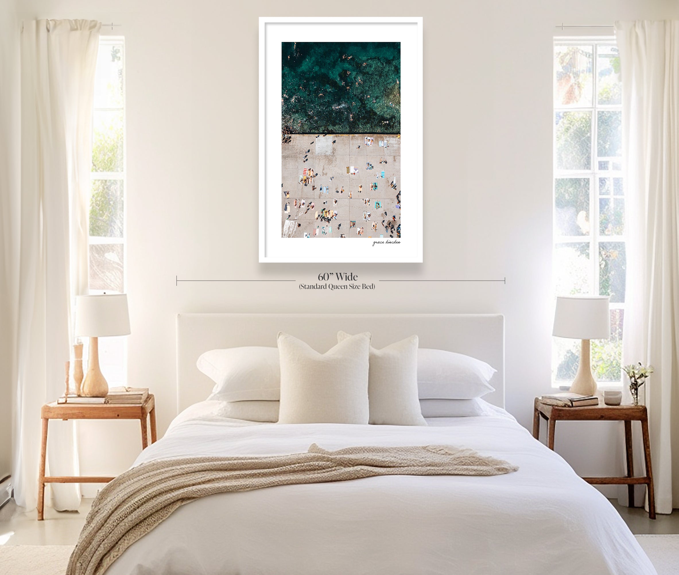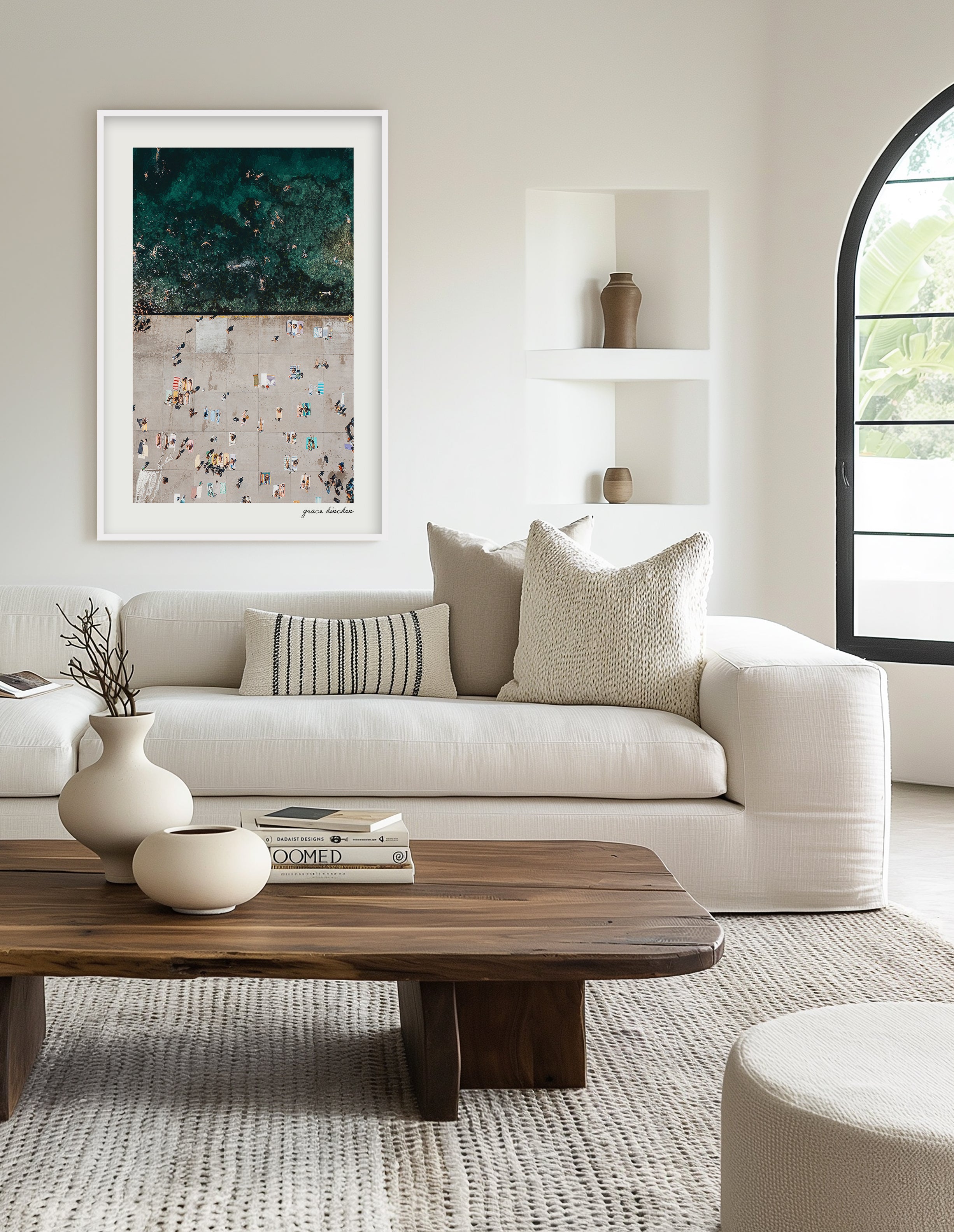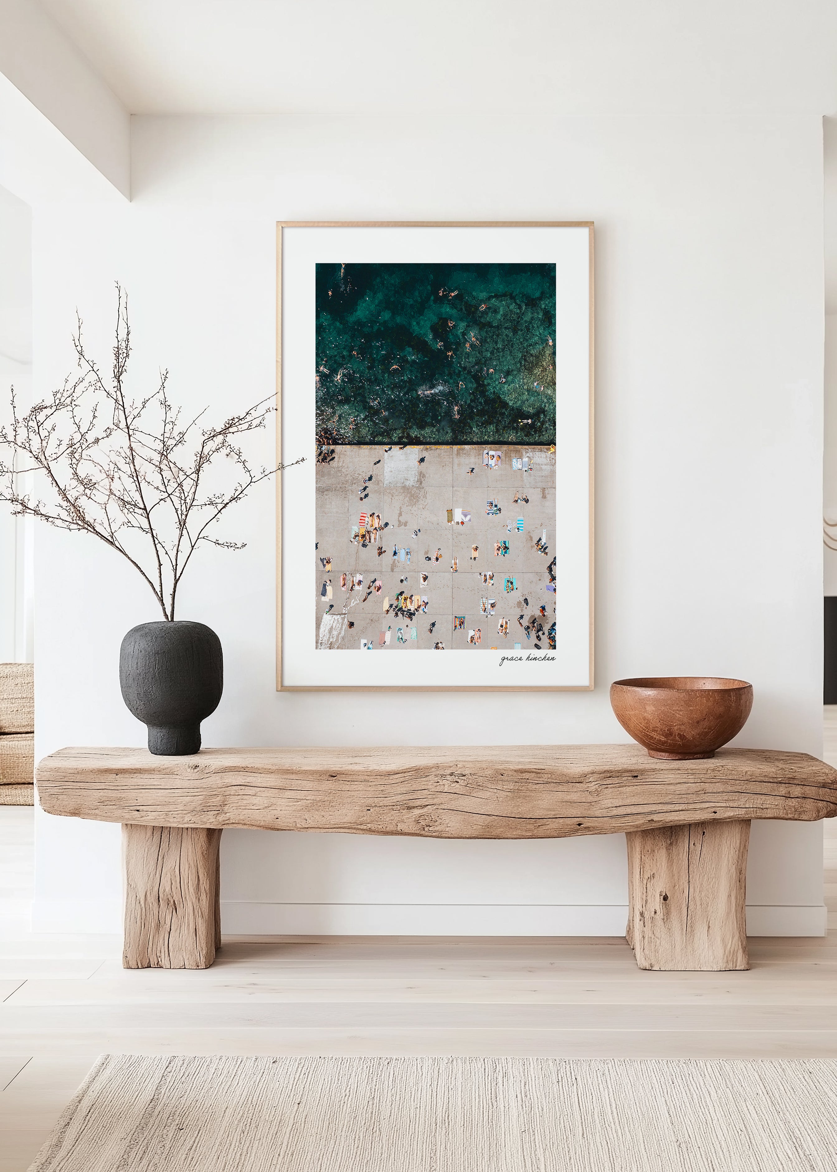 A top-down perspective reveals the joyful symmetry of Clovelly Beach: human shapes, sharp lines, and flowing water in constant dialogue. Shot by drone.