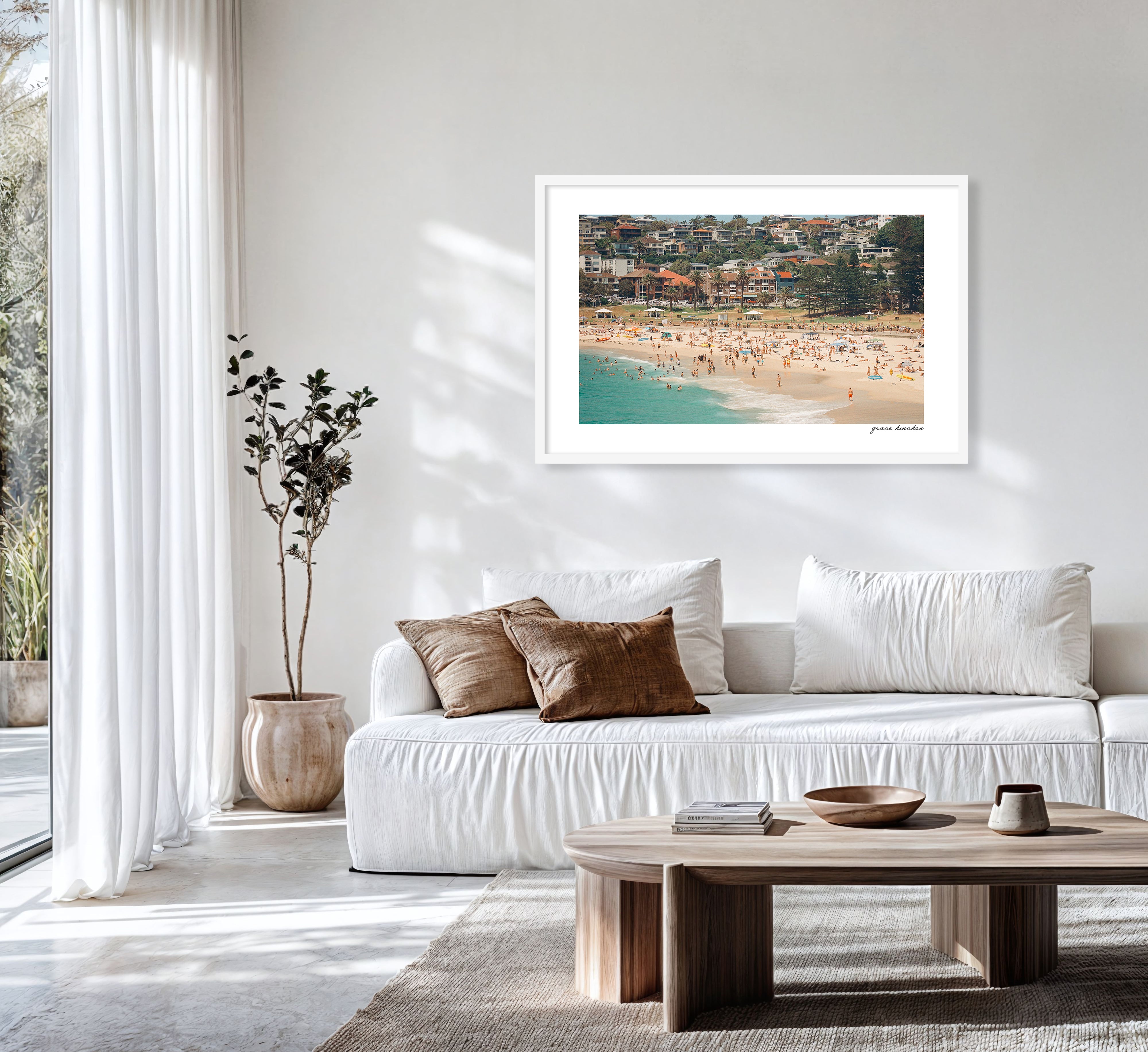 The hillside homes of Bronte overlooking the beach below, set against the calm rhythm of a summer's day, January 2025. Shot on film.