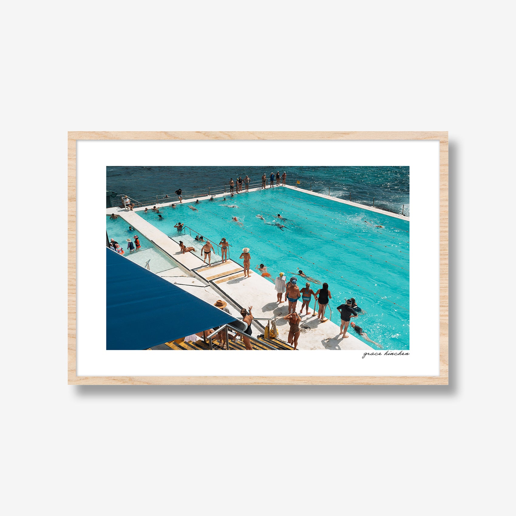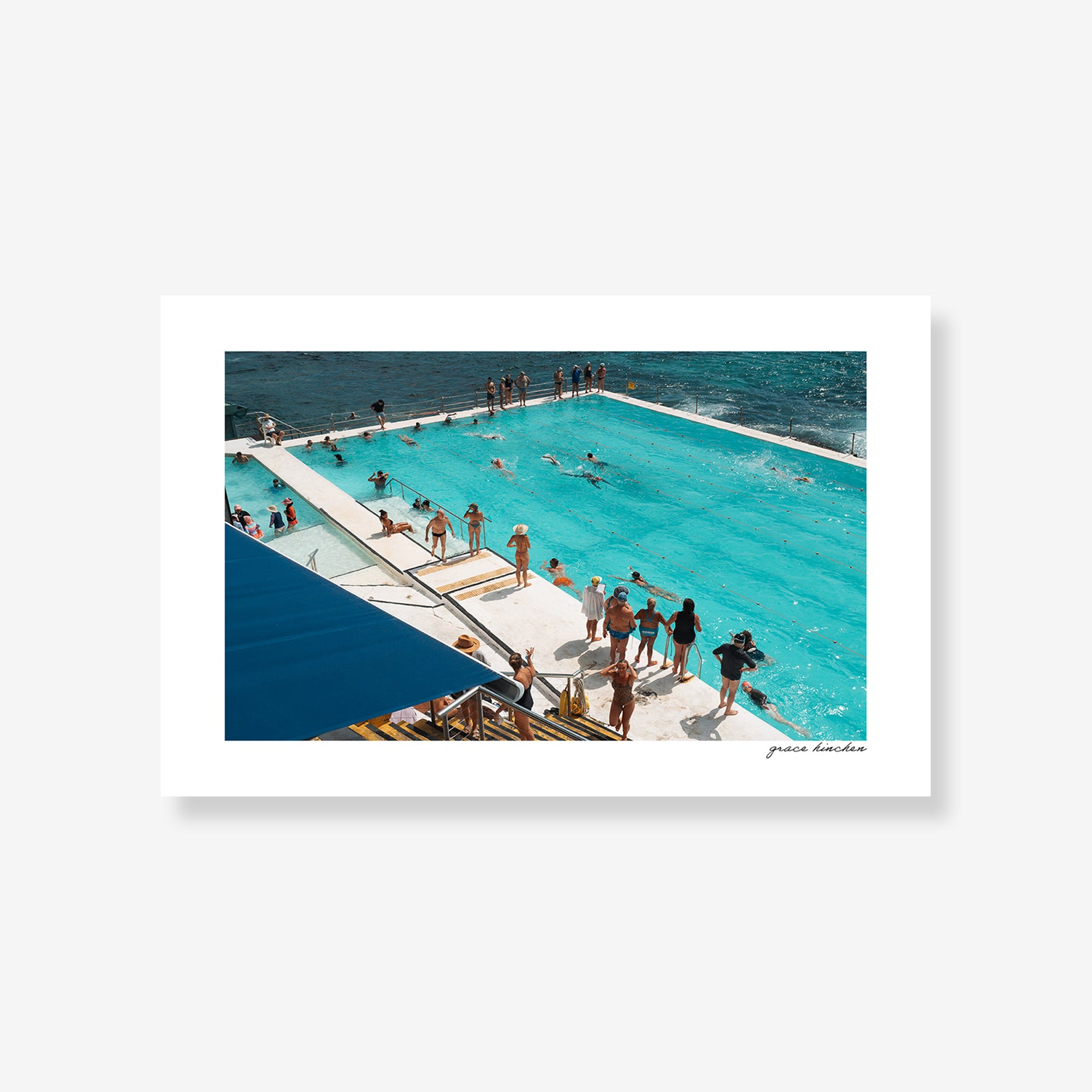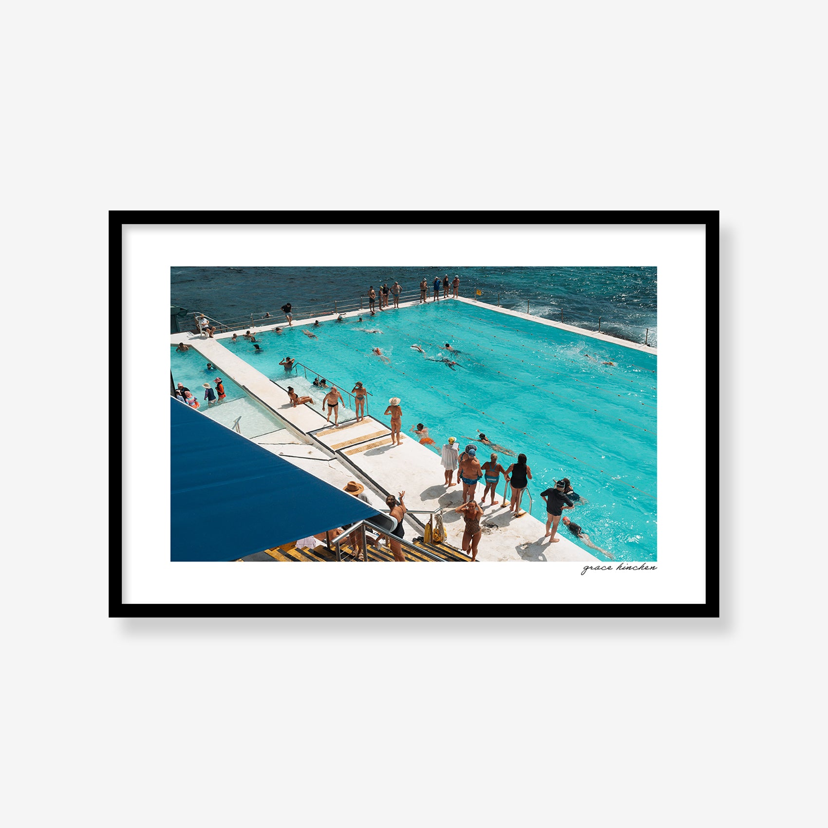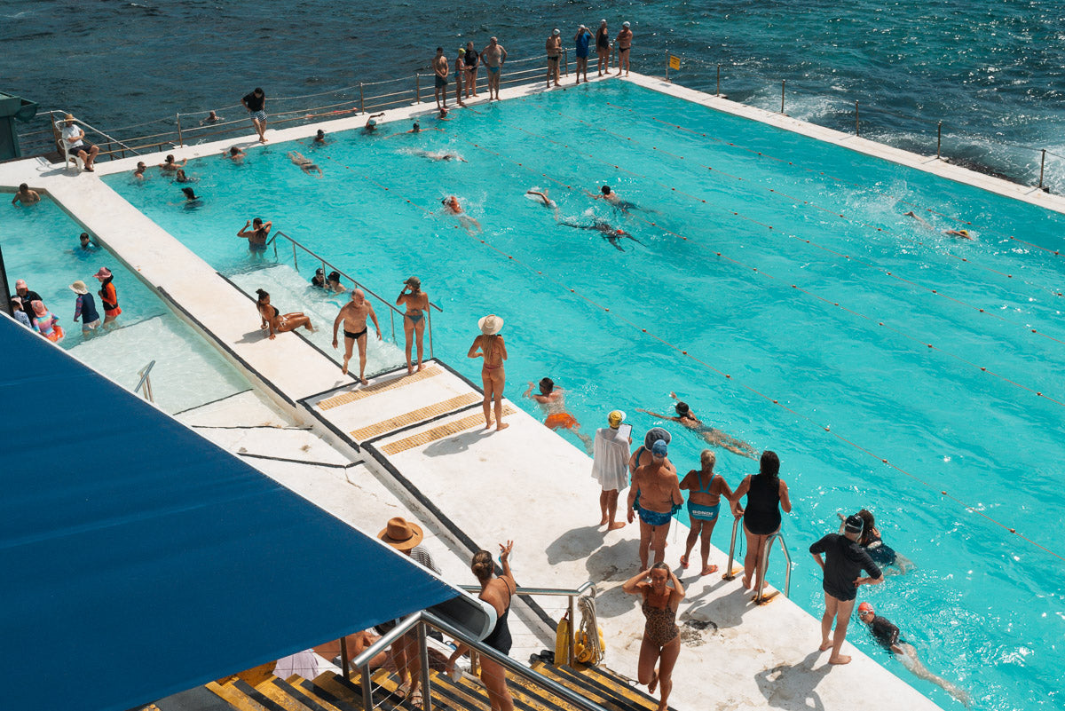 Men and women emerge from Bondi Icebergs pool, showcasing a range of beachwear, January 2025.