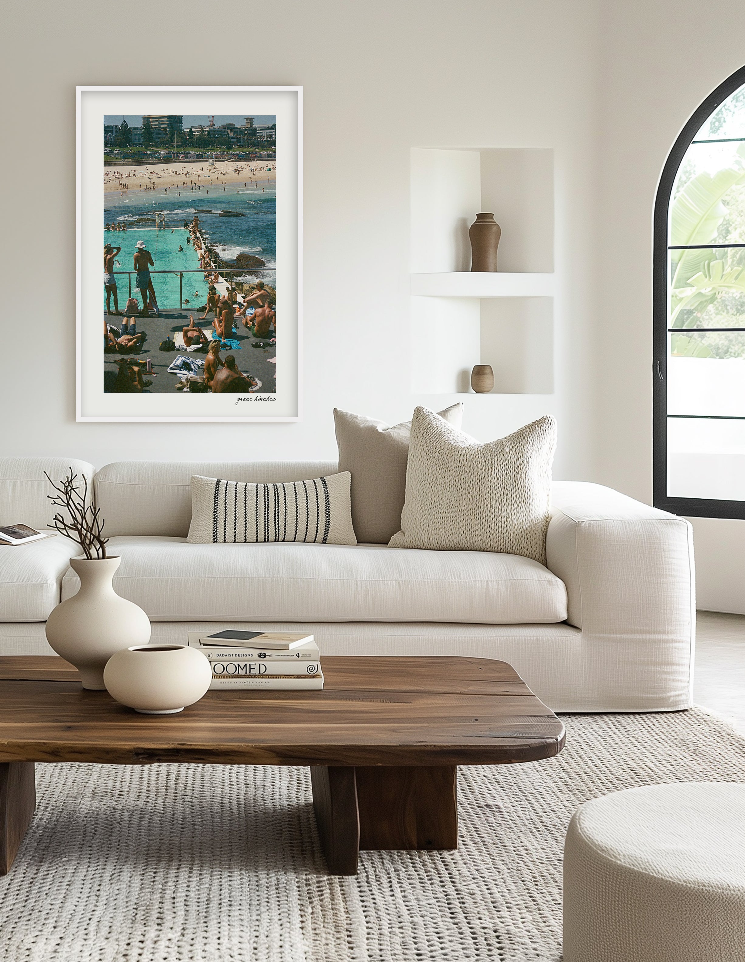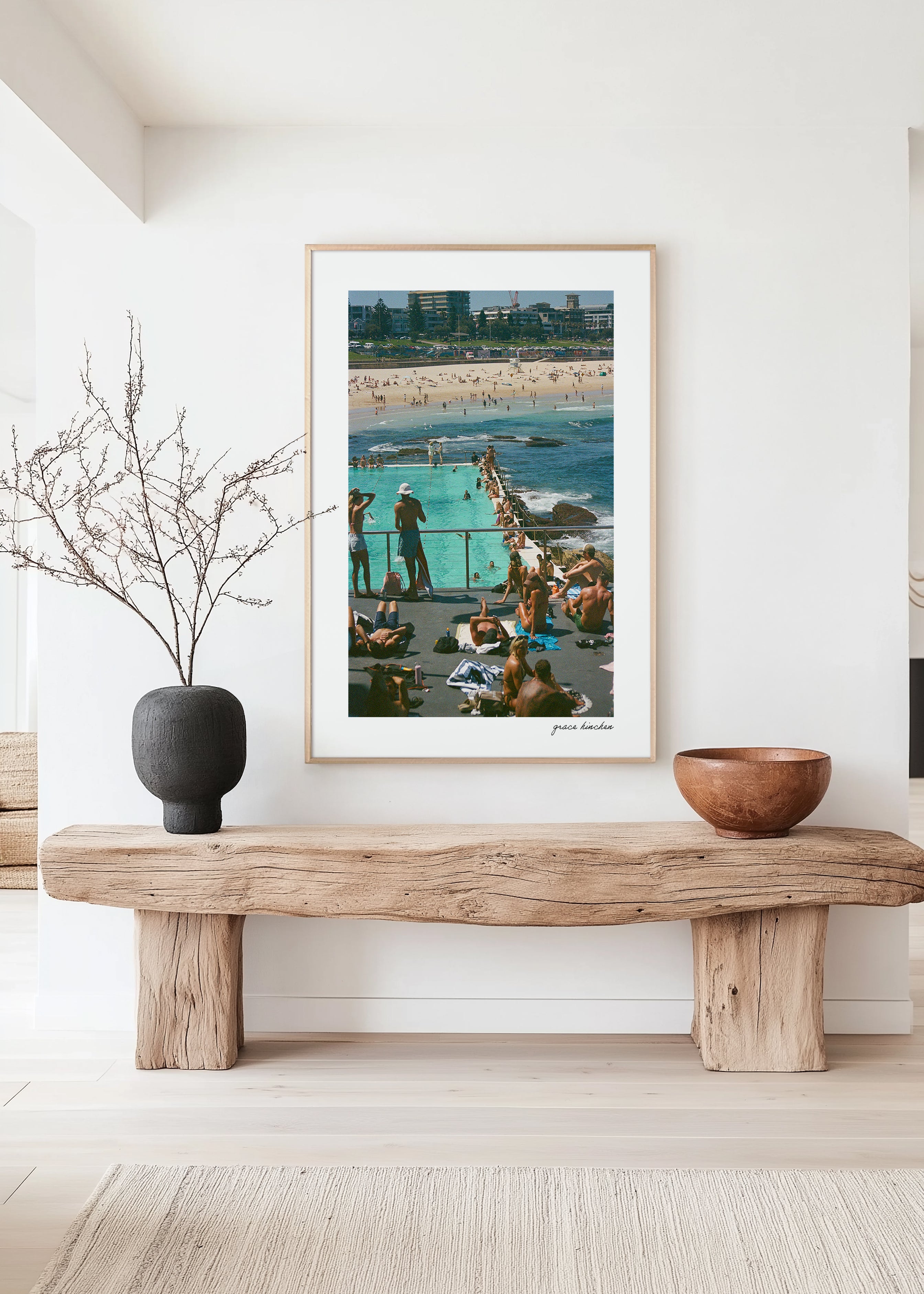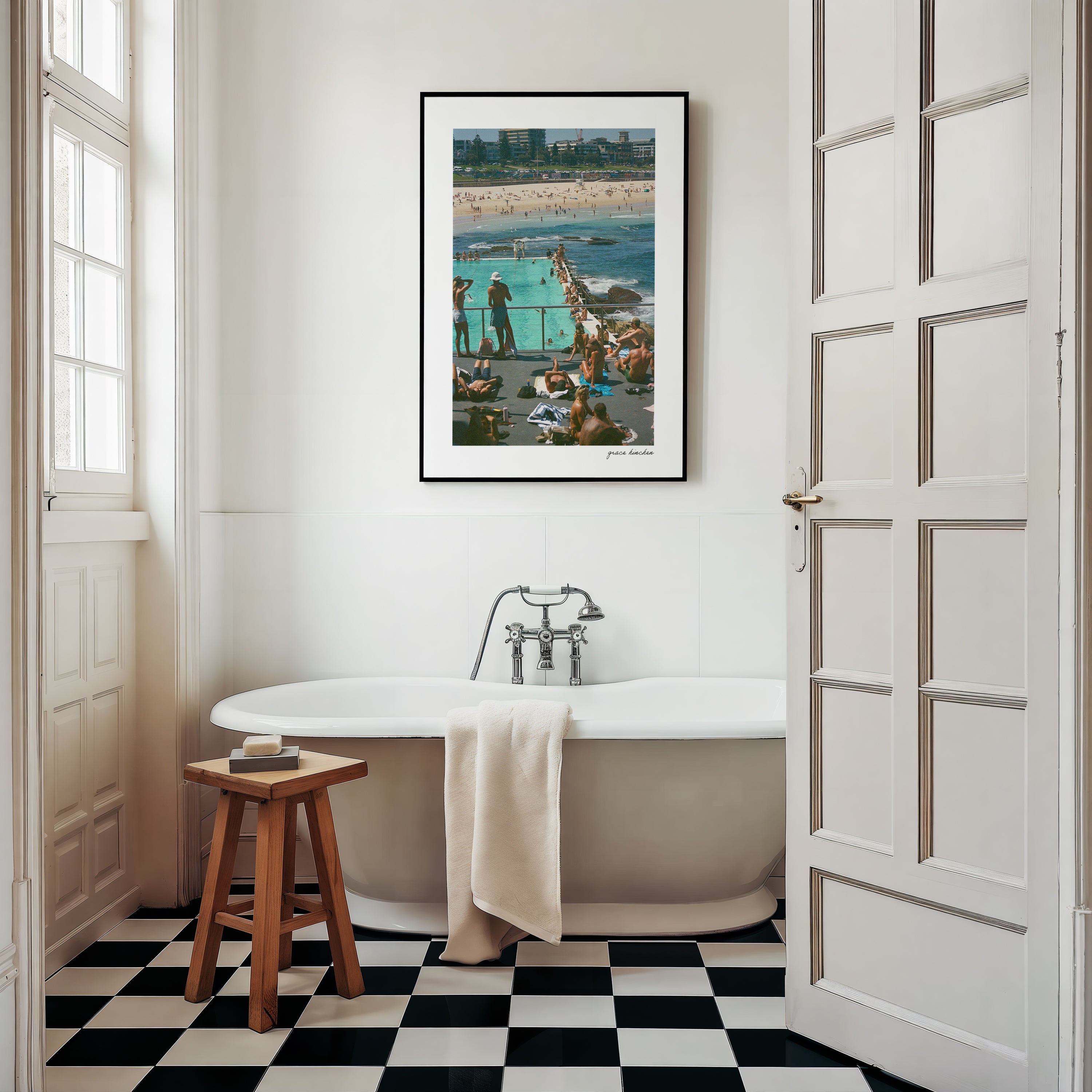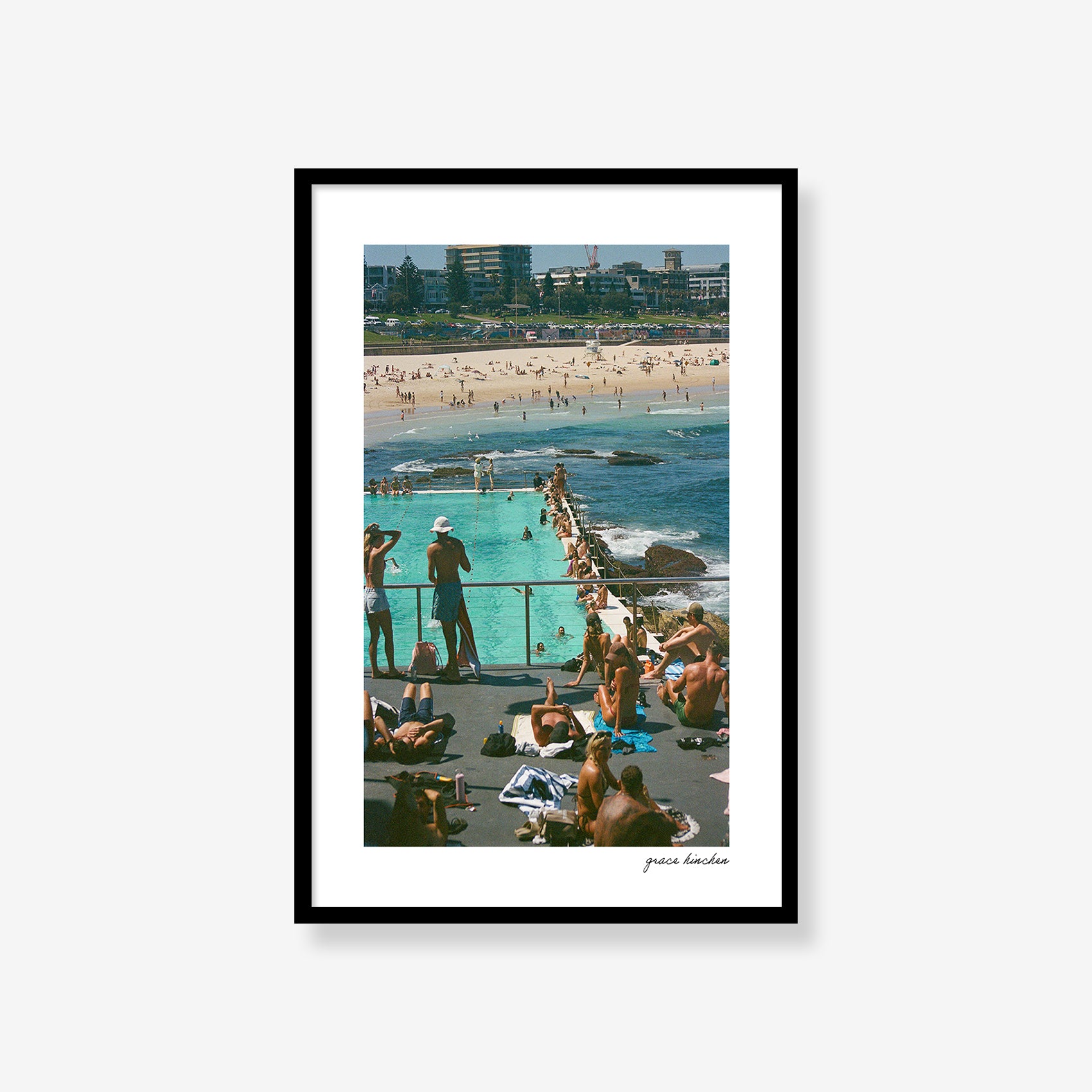 The Bondi Icebergs sundeck overlooks the beach and pool, captured on film with bathers enjoying the sun, January 2025.