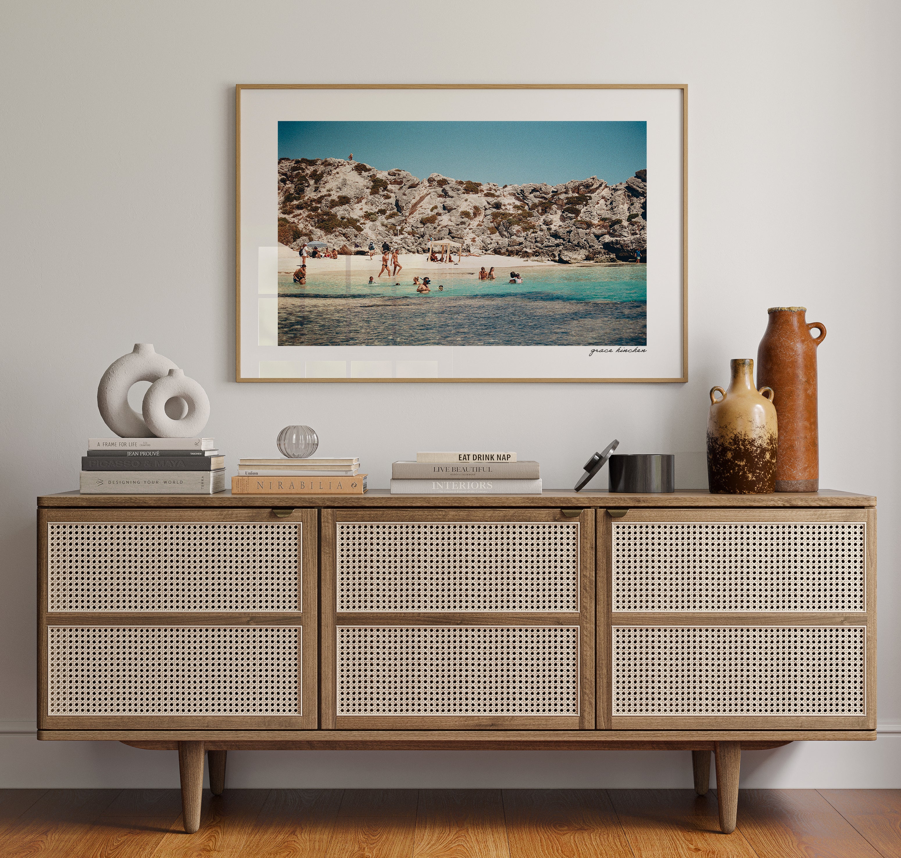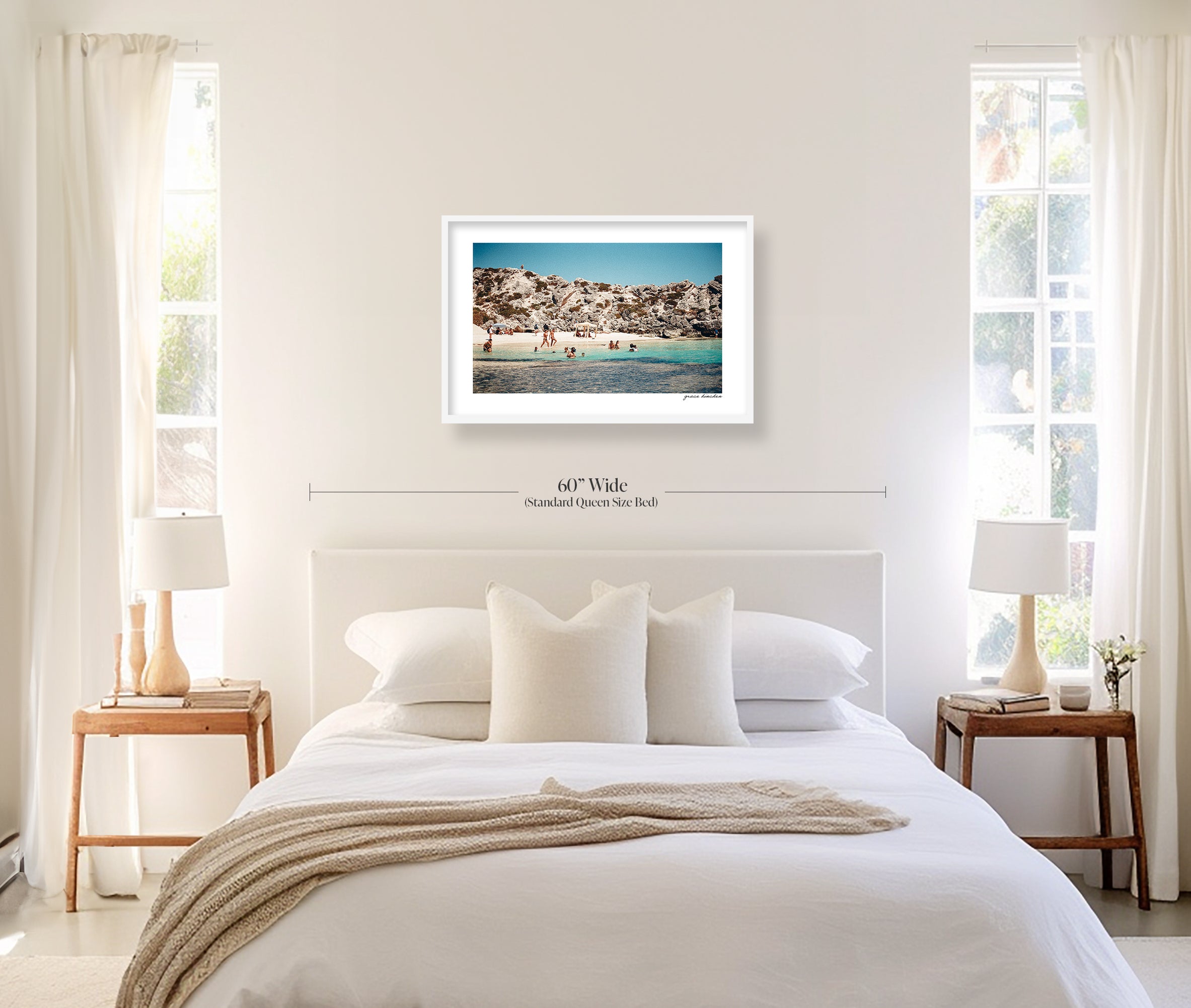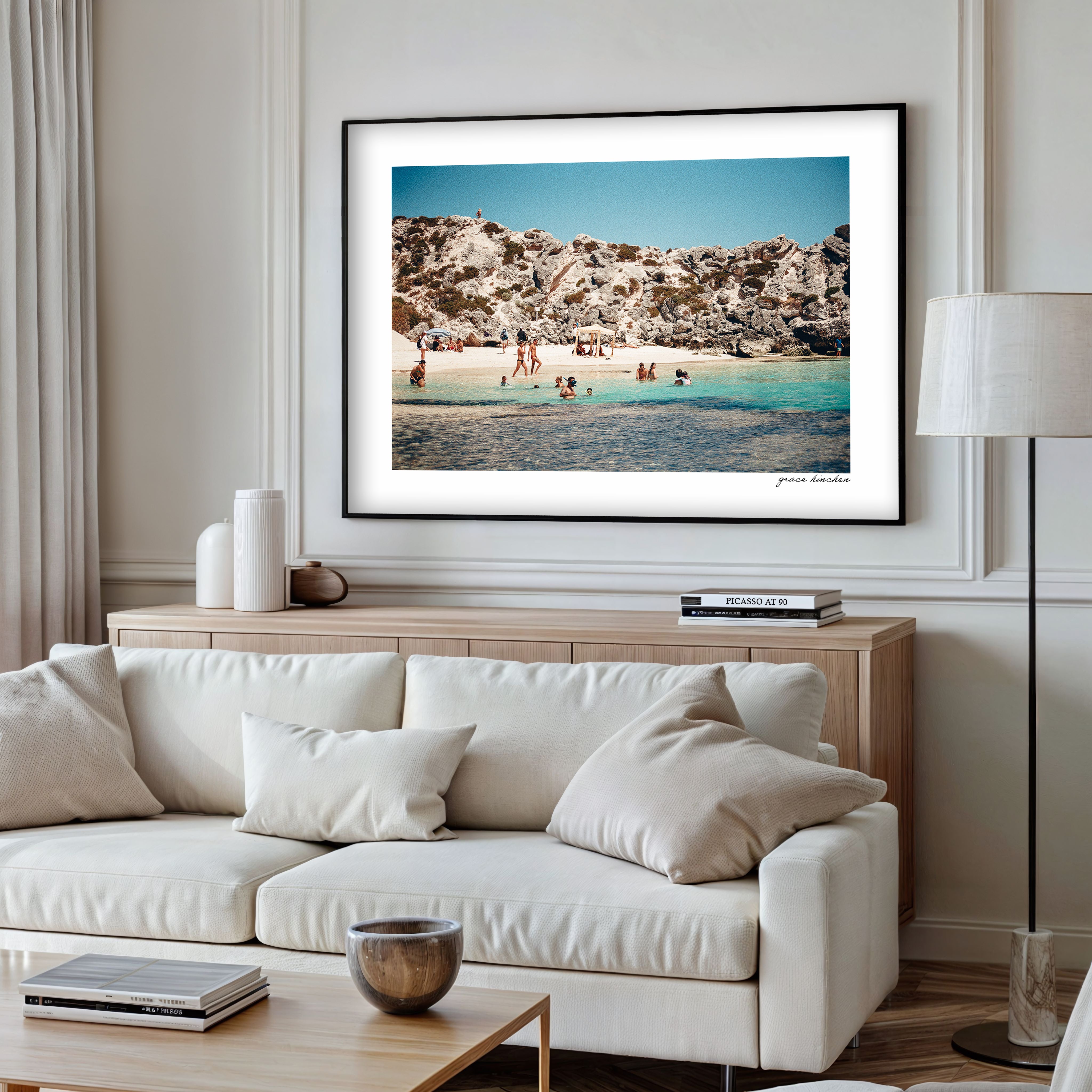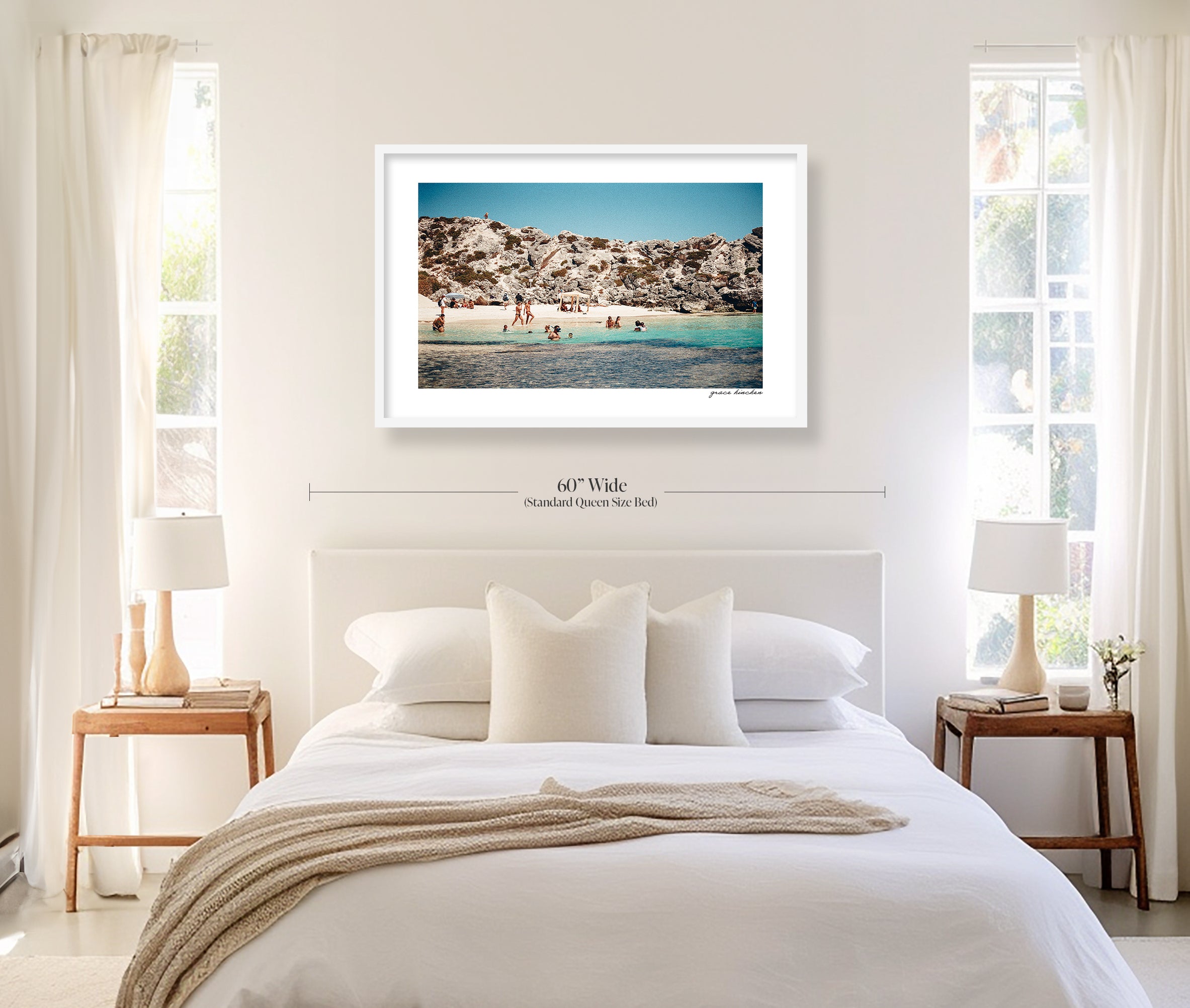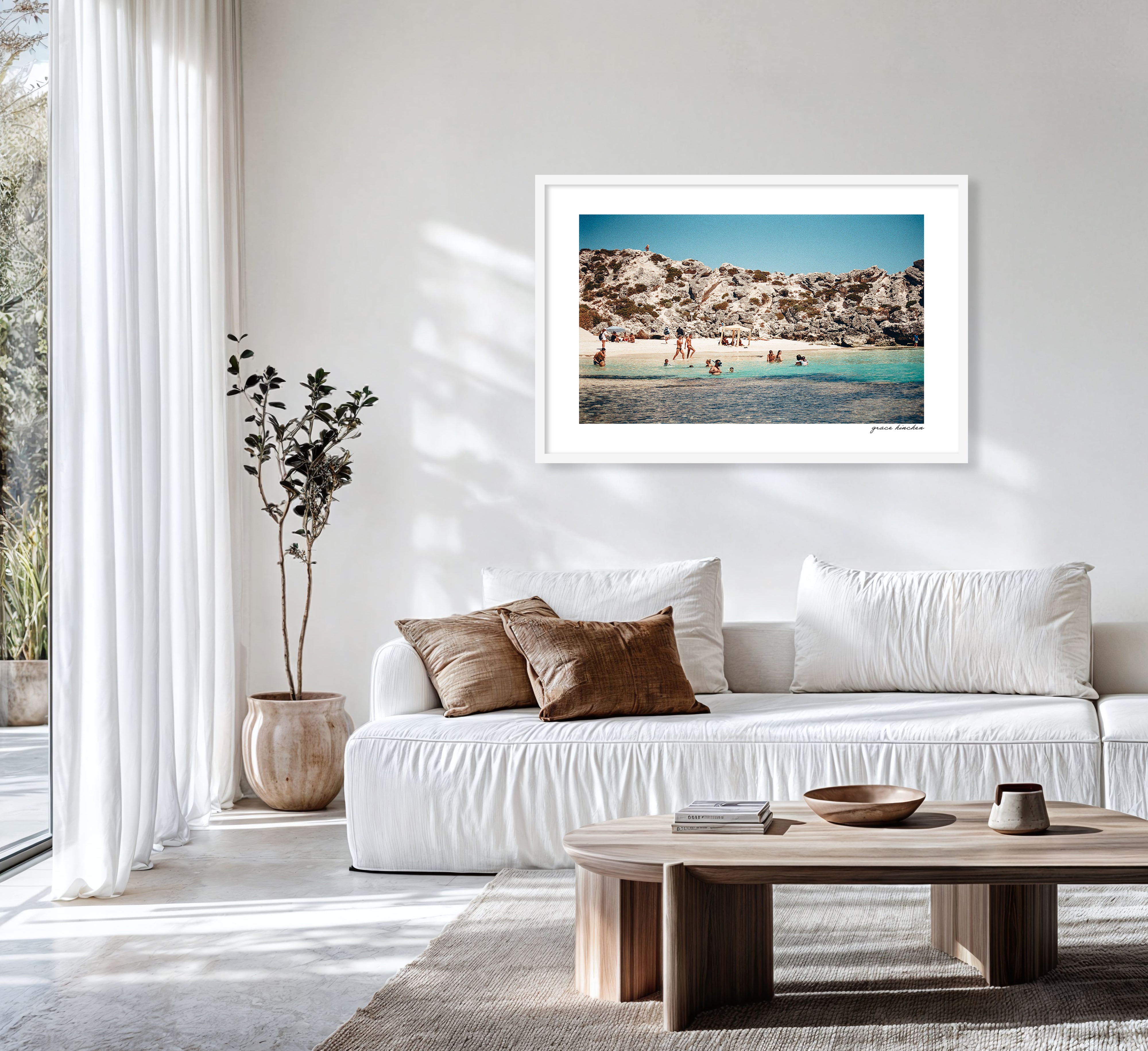 Swimmers and sunbathers at Little Parakeet Bay, a secluded cove off the coast of Western Australia, January 2024. Shot on film.
