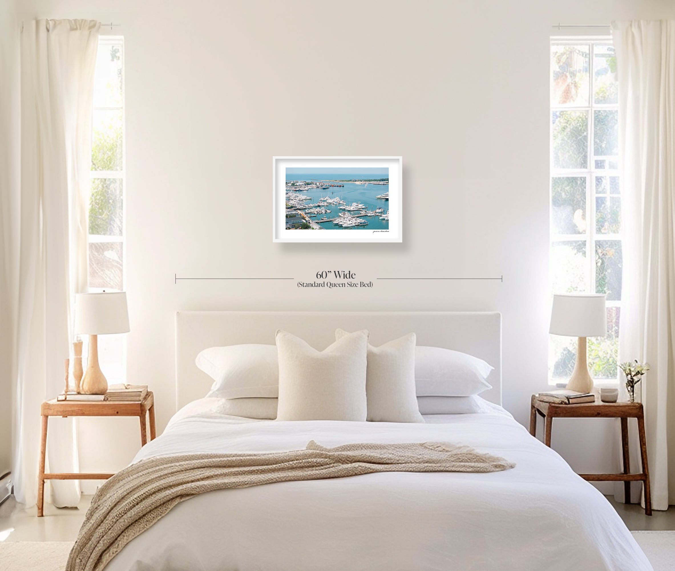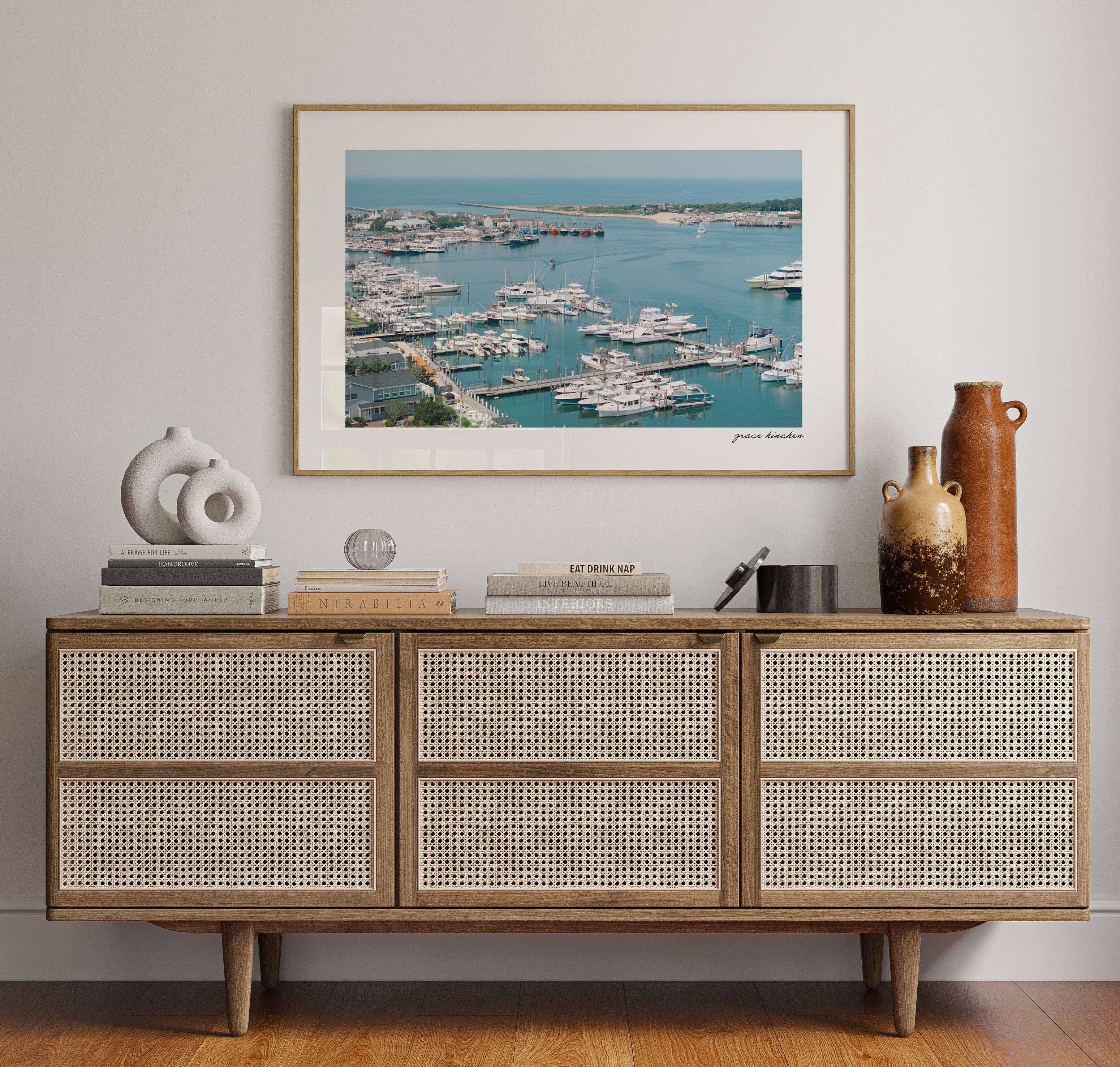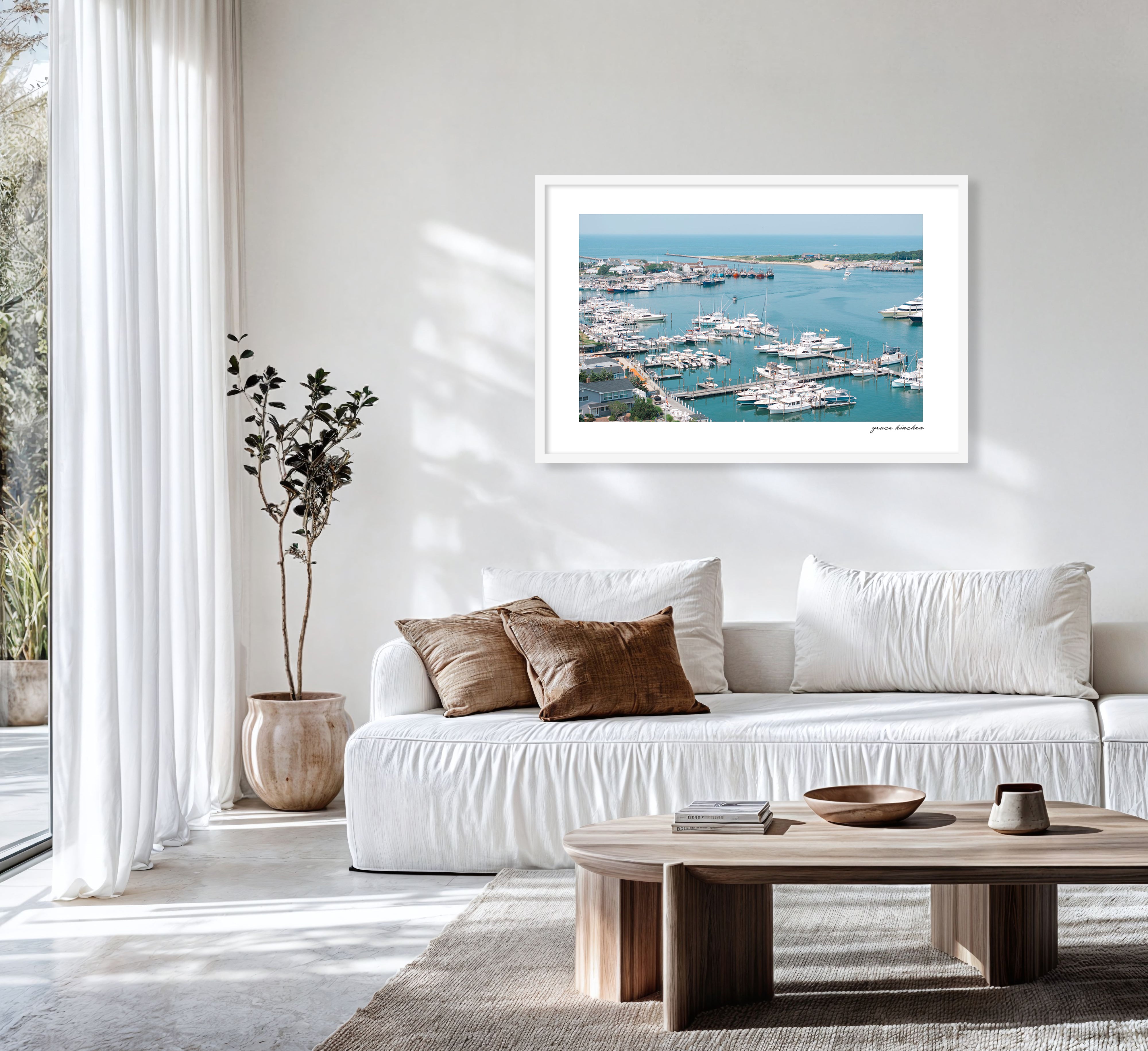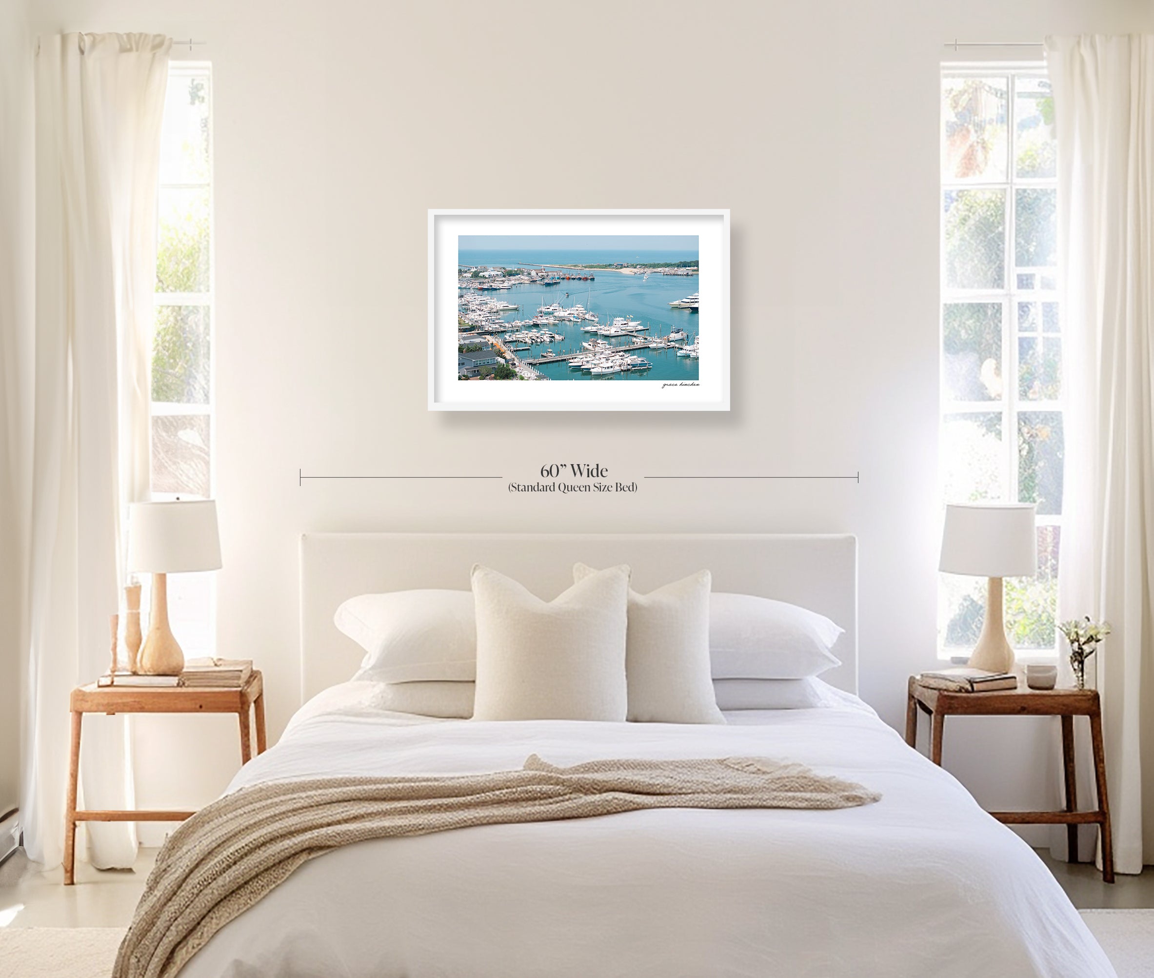 Aerial of Montauk Harbor. Shot by drone, July 2025.