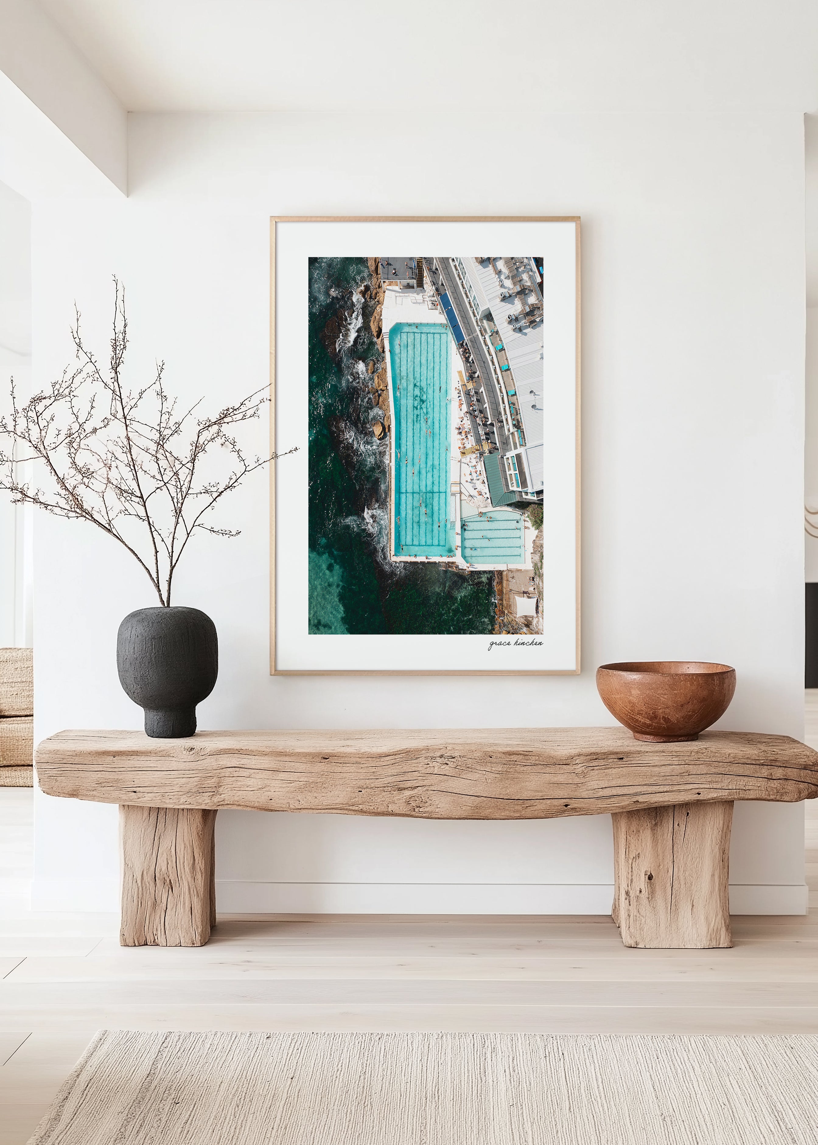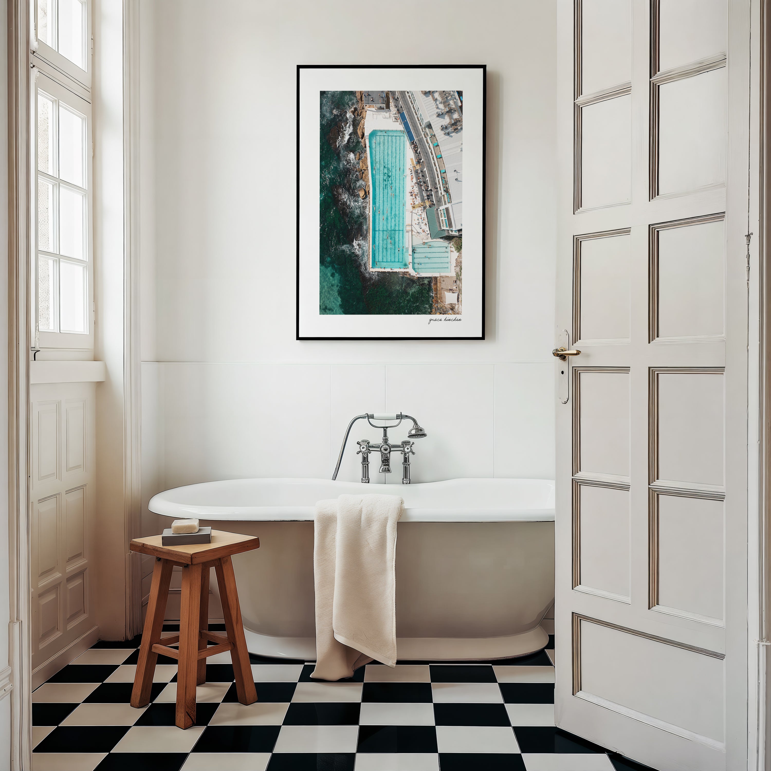 Early swimmers take to the Bondi Icebergs lap pool as part of their morning ritual, December 2023. Shot by drone.
