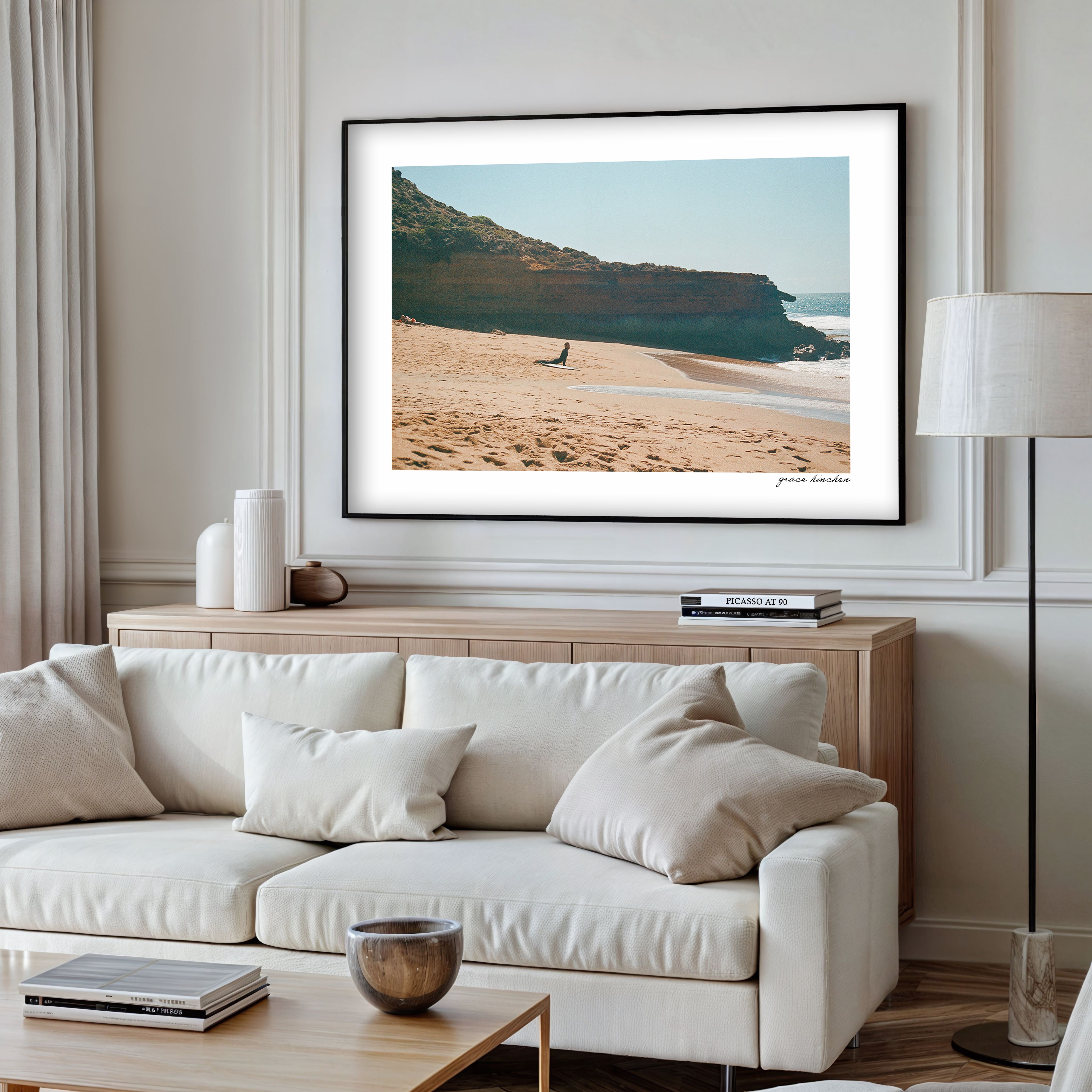 A surfer stretches on the cliffs before paddling out at Bells Beach, Victoria, December 2024. Shot on film.
