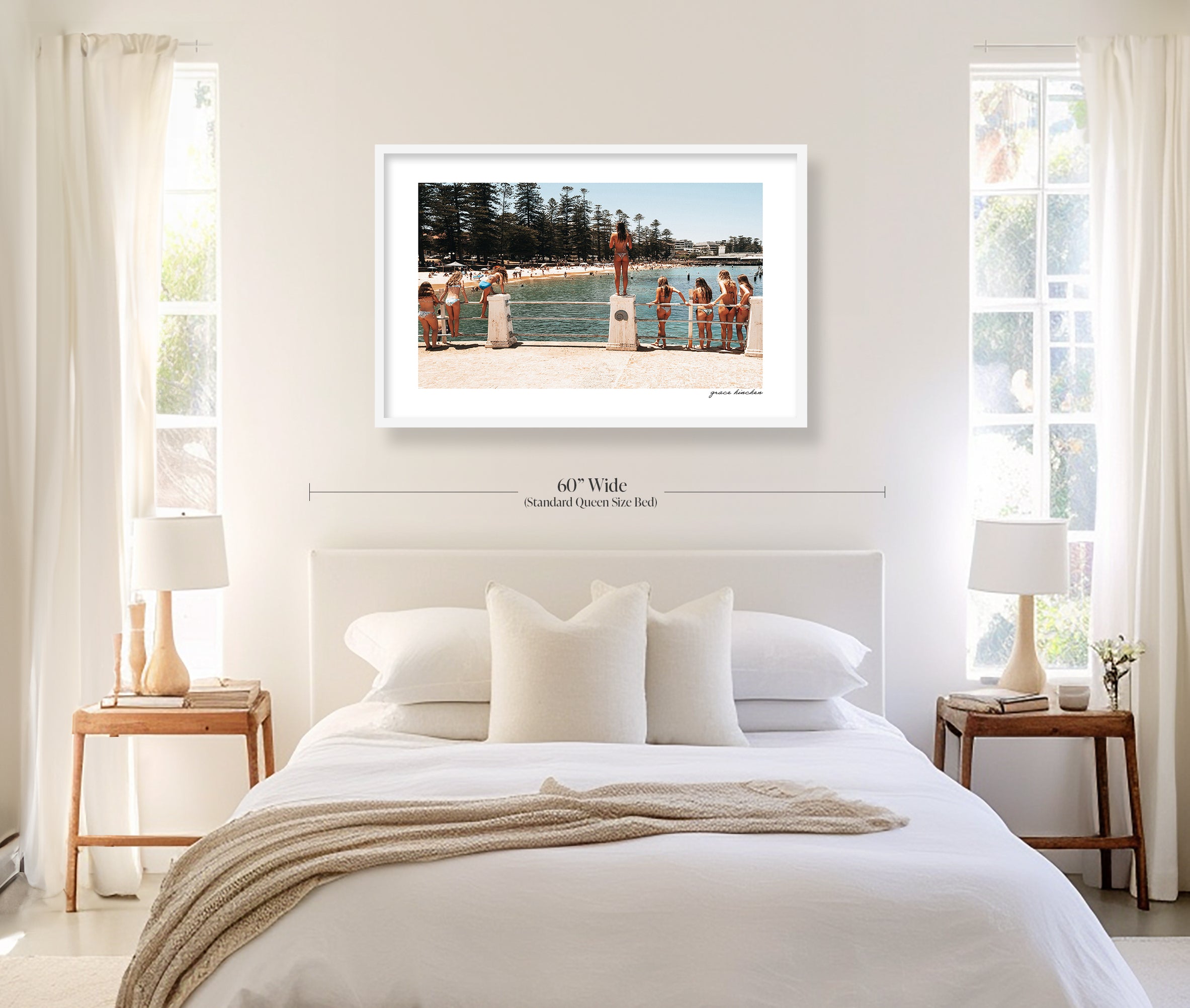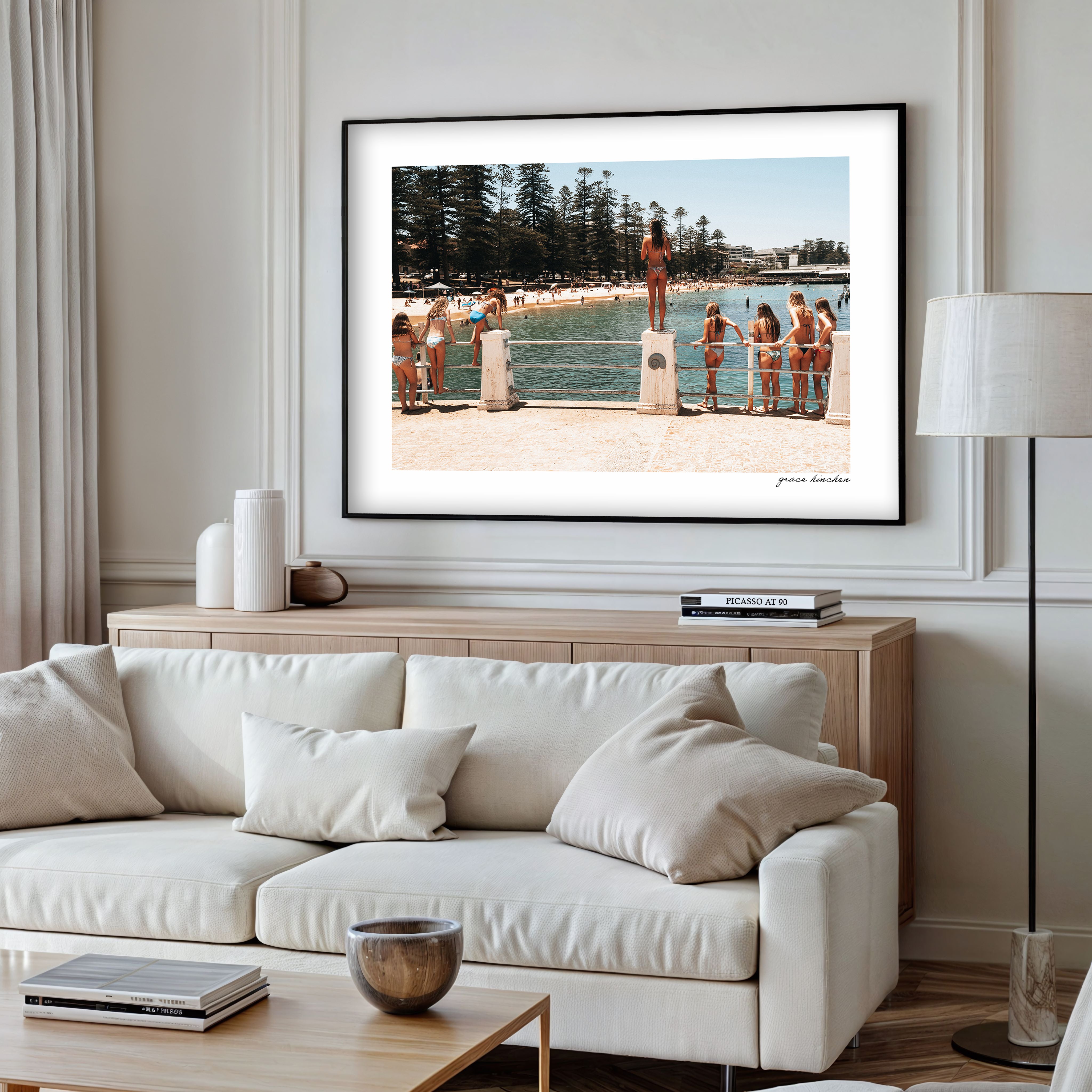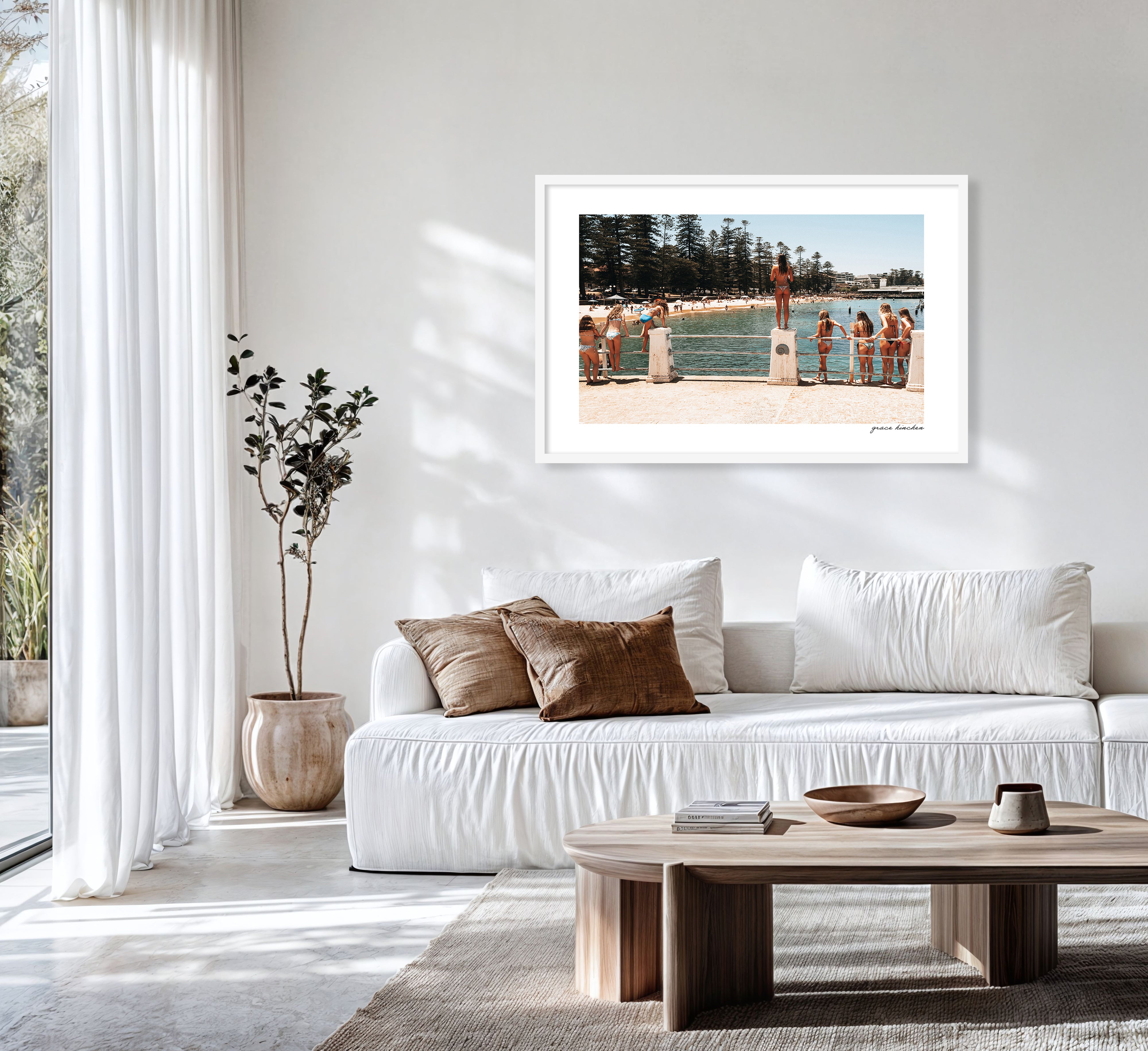 A group of girls stand on the edge of Manly promenade near the Esplanade, preparing to jump into the harbor, January 2025.