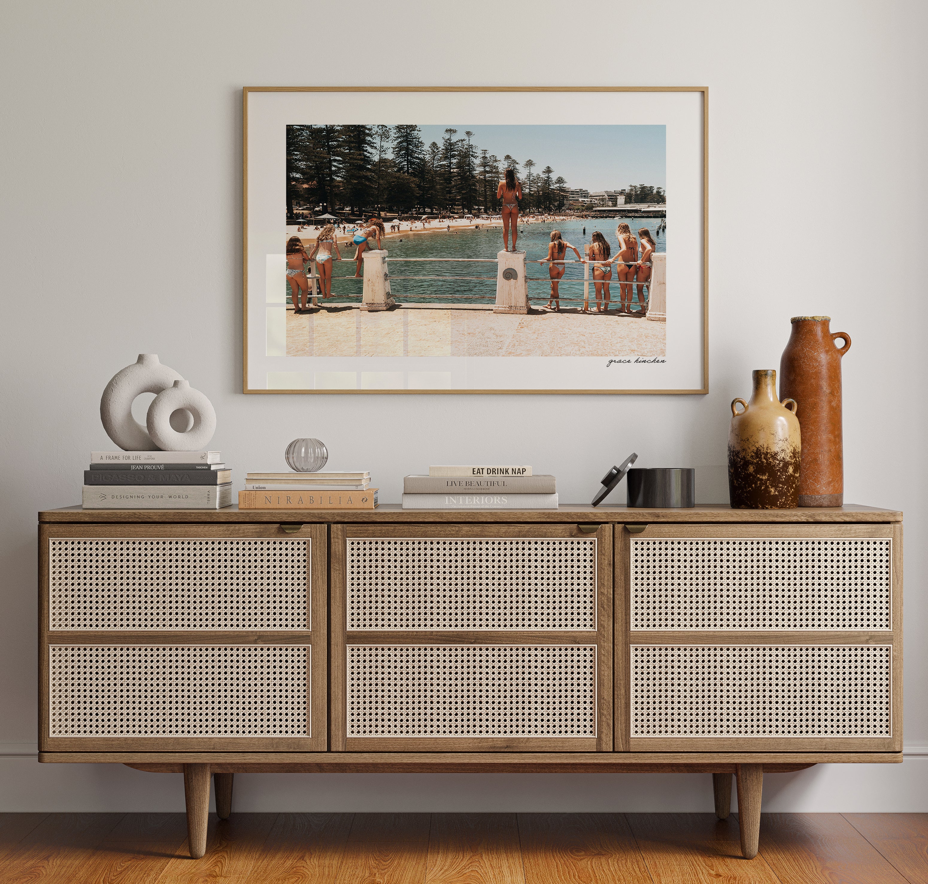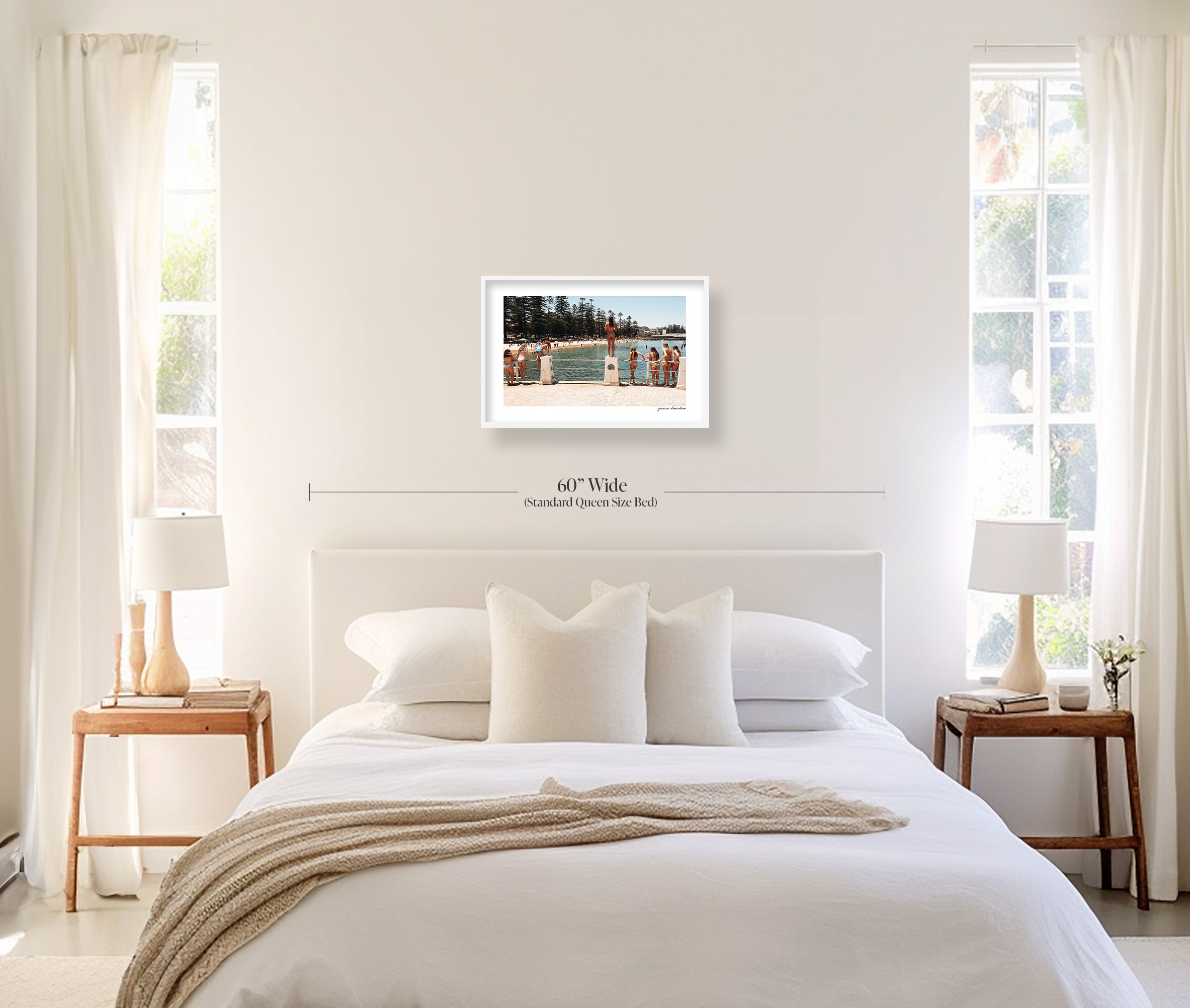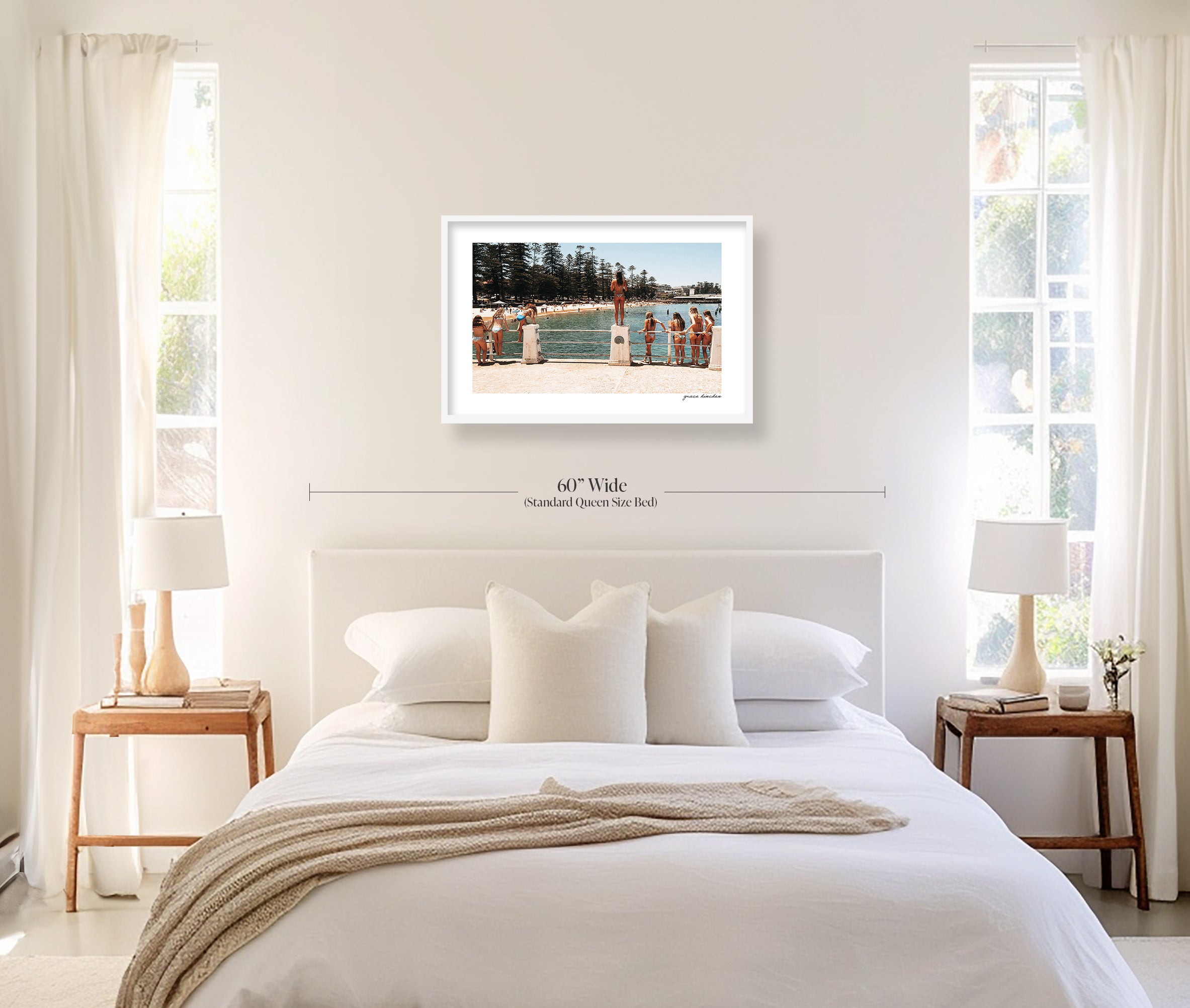 A group of girls stand on the edge of Manly promenade near the Esplanade, preparing to jump into the harbor, January 2025.