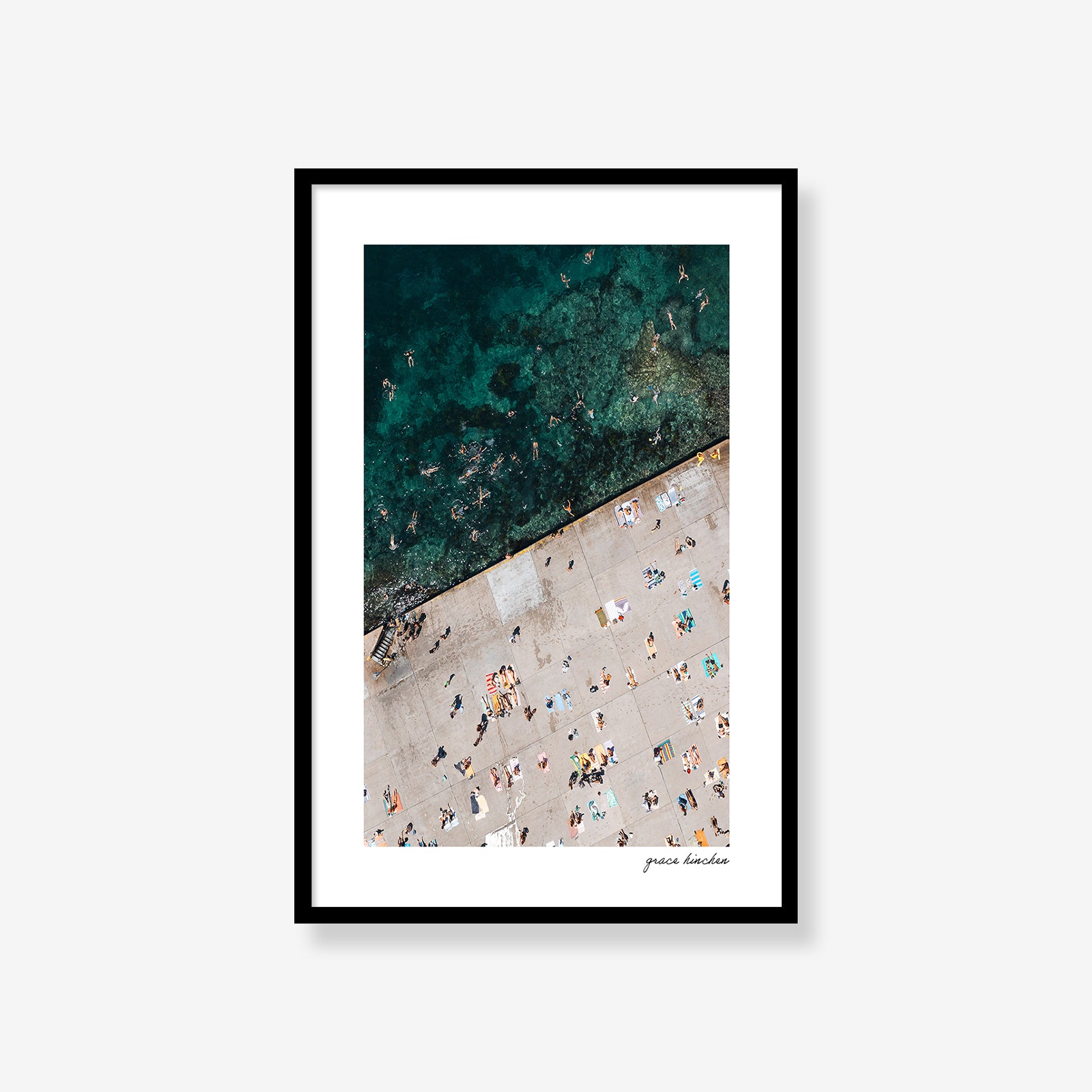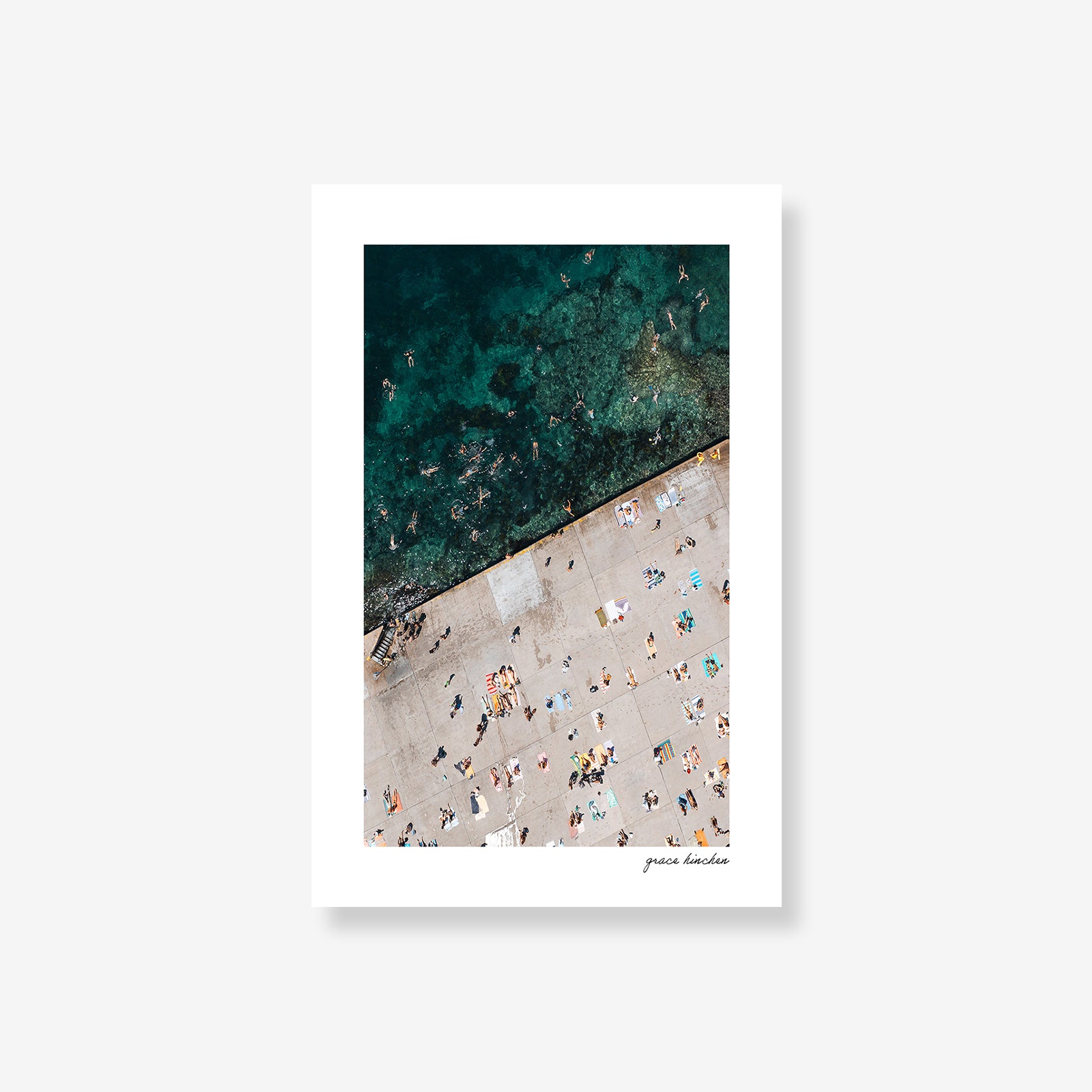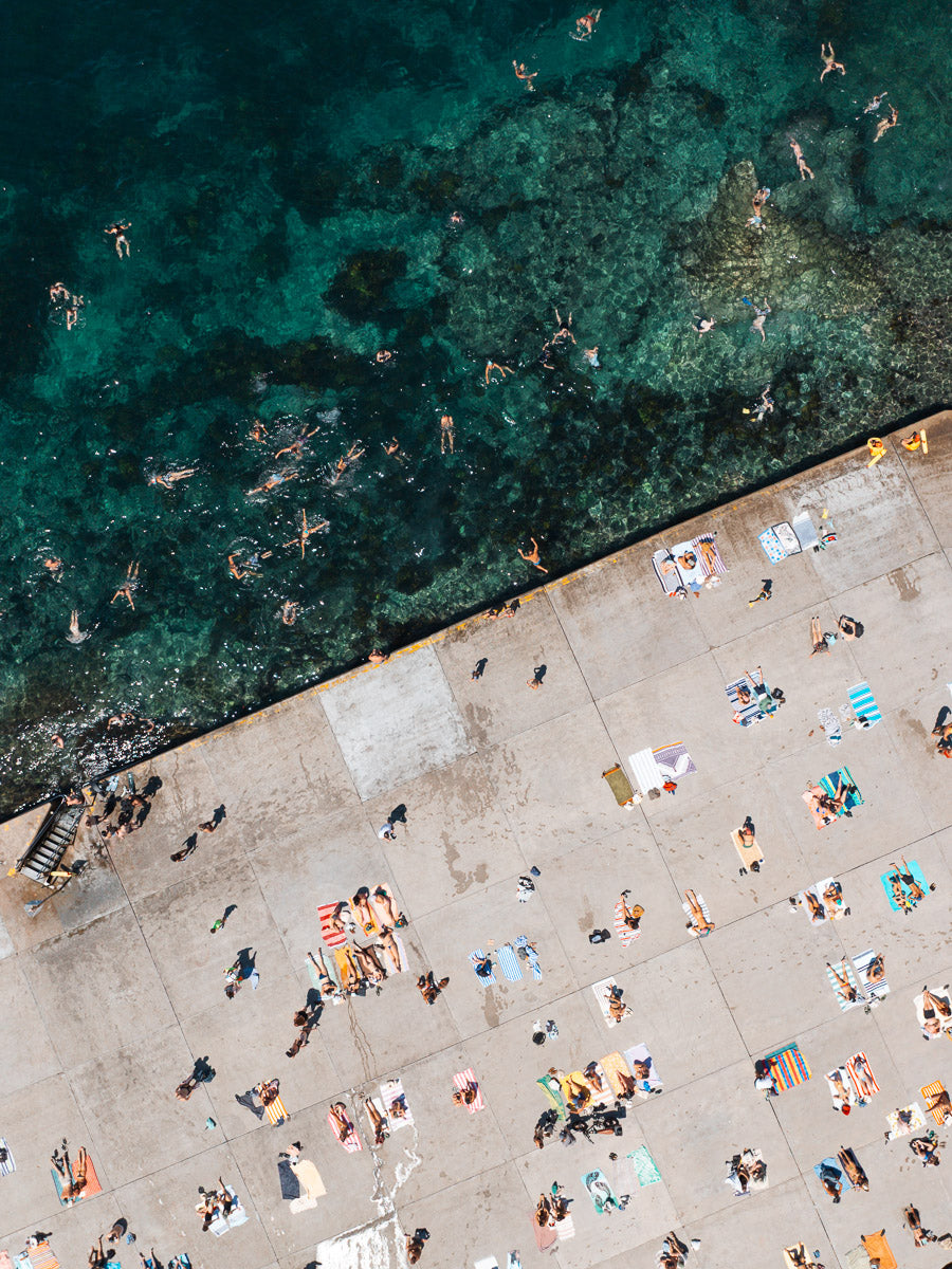 A joyful moment as a local leaps from the concrete edge into the turquoise shallows of Clovelly, a place where tradition and thrill meet, January 2025. Shot by drone.