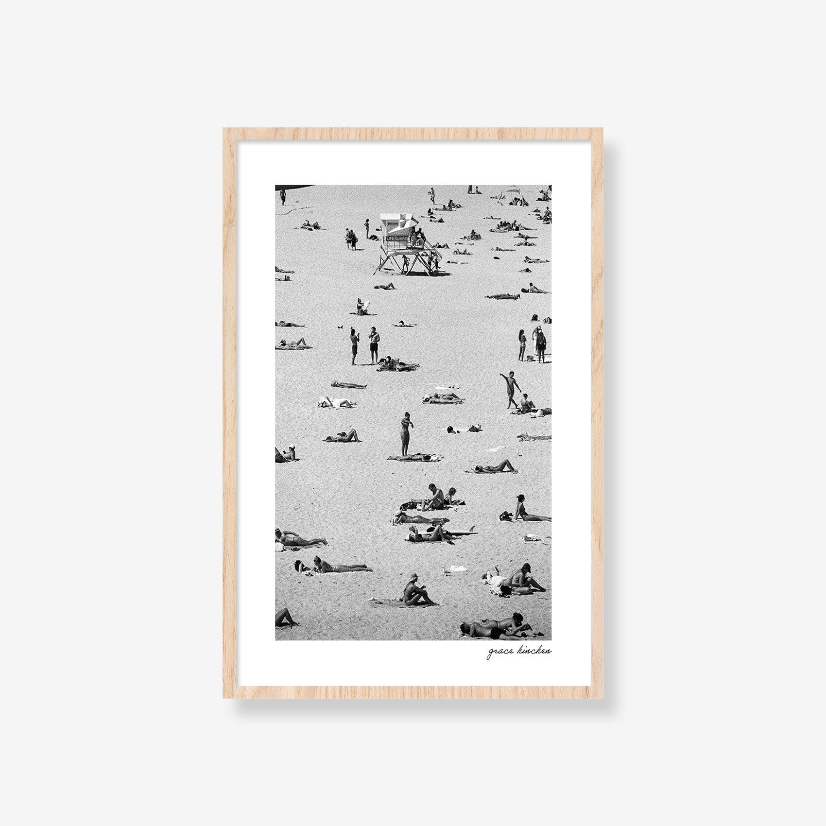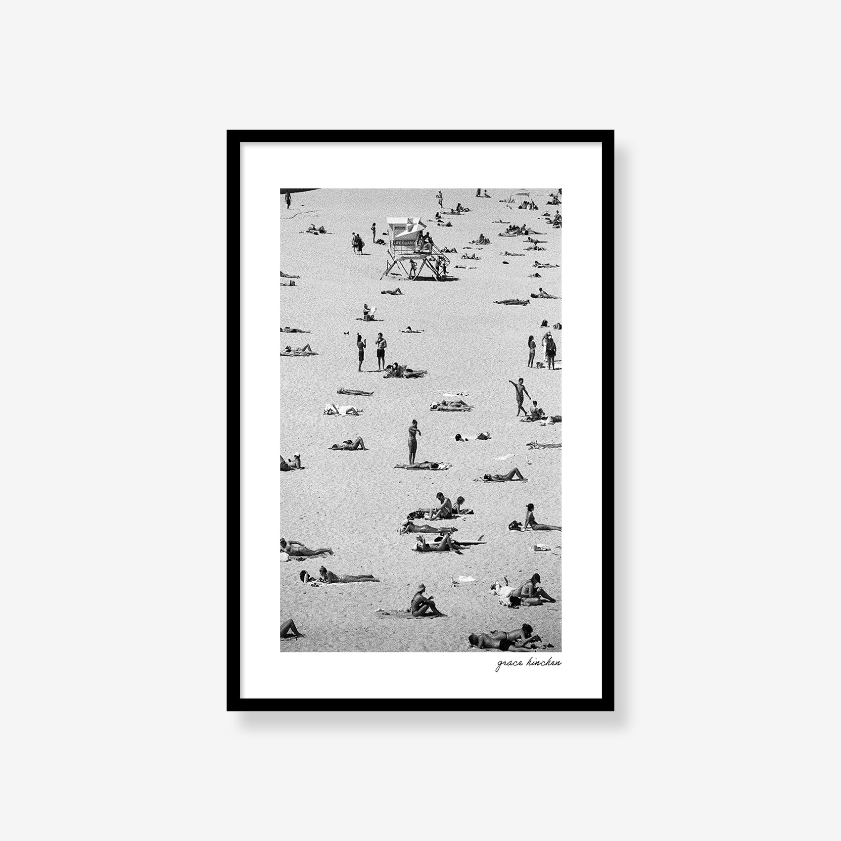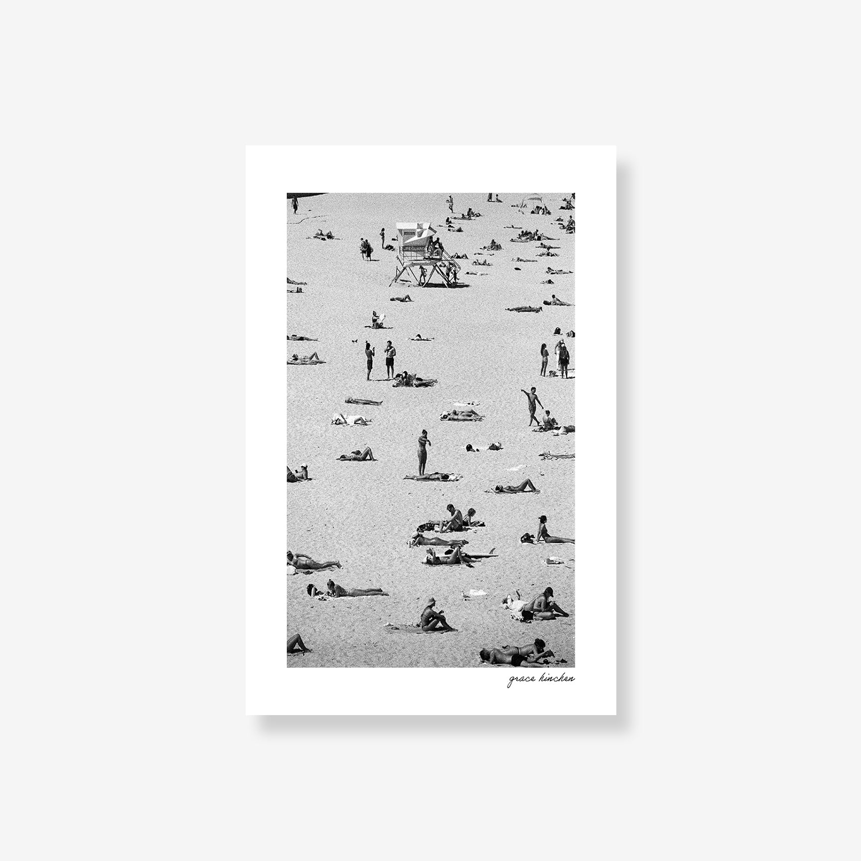 A vertical black and white film image of Bondi Beach with beachgoers appearing as simplified forms under direct sun, January 2025. Shot on film.