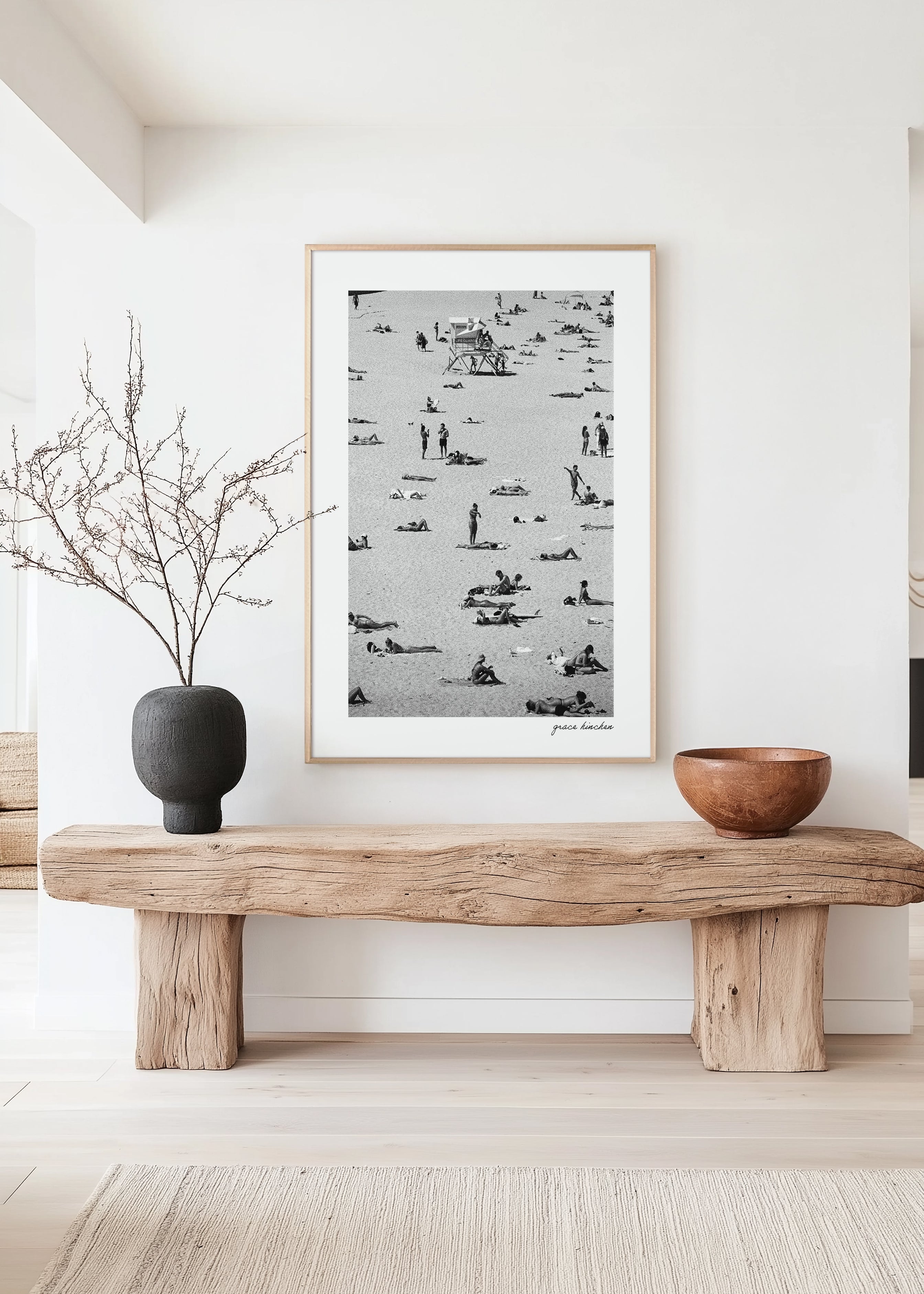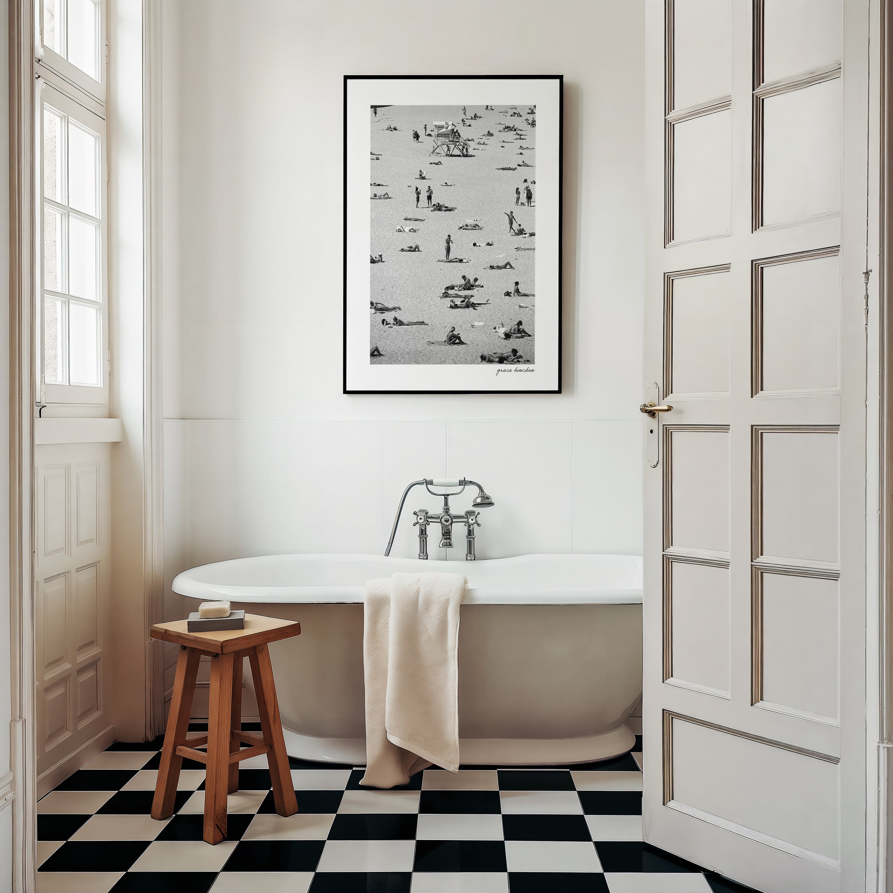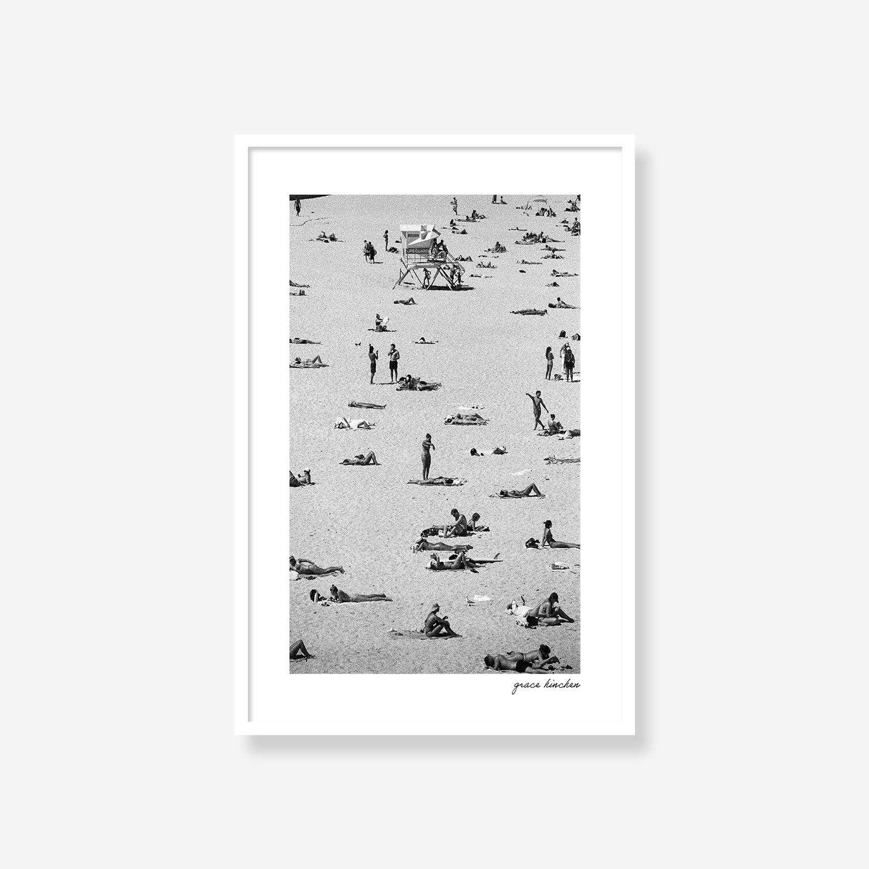 A vertical black and white film image of Bondi Beach with beachgoers appearing as simplified forms under direct sun, January 2025. Shot on film.