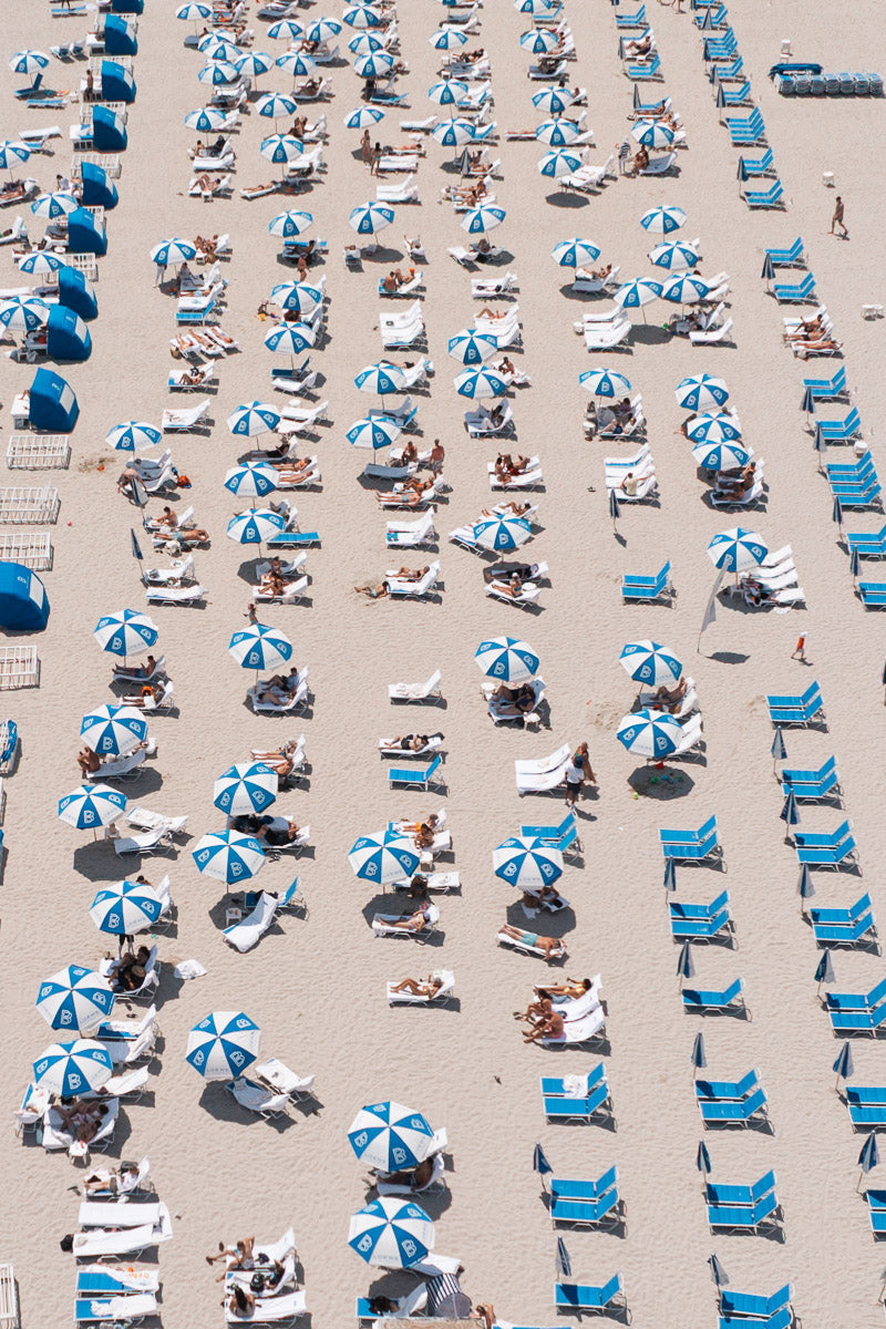 Sun-seekers and hotel guests soak up the Miami heat during spring break. The vibrant beach club umbrellas create a striking angle, adding to the scene's dynamic composition.