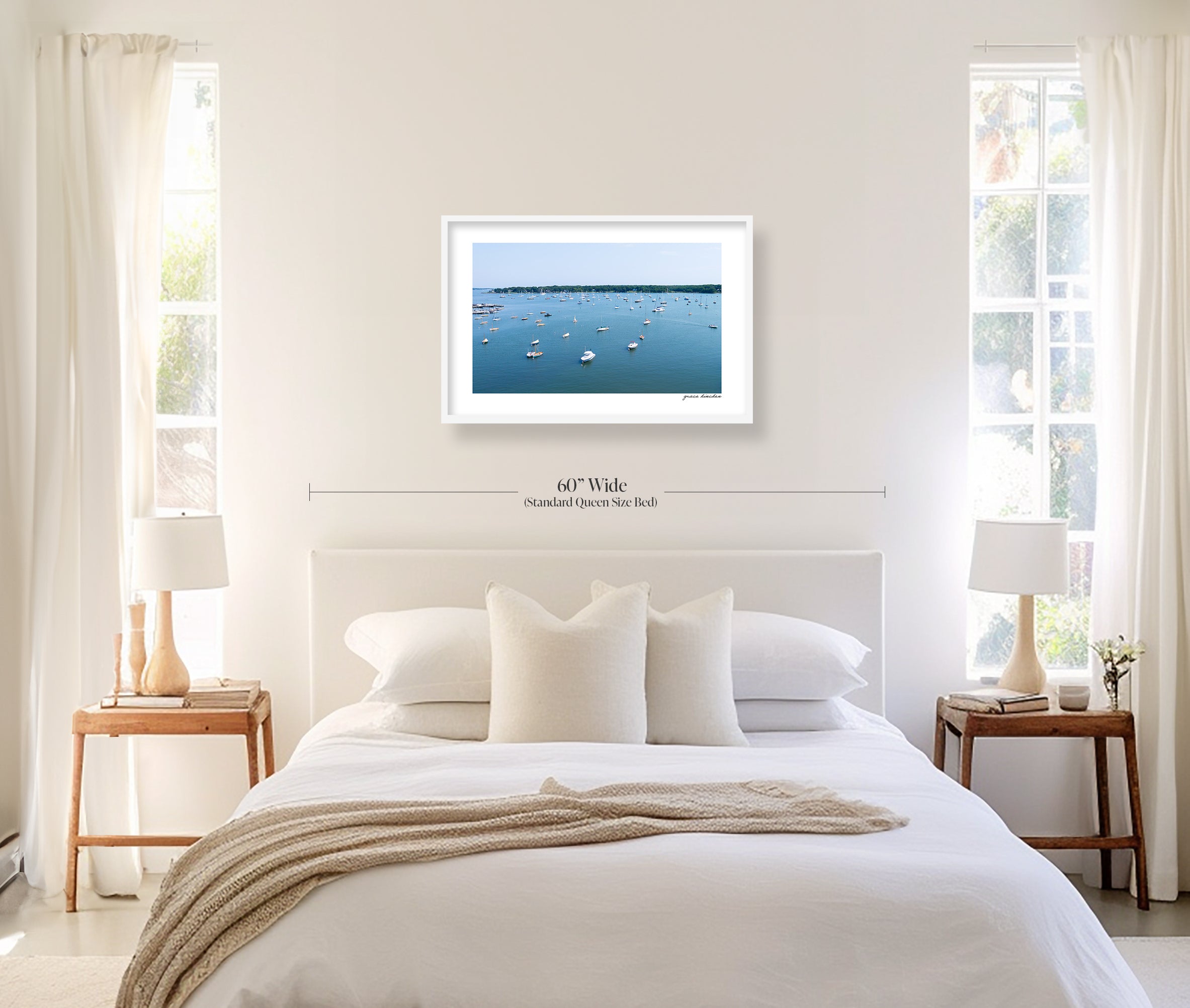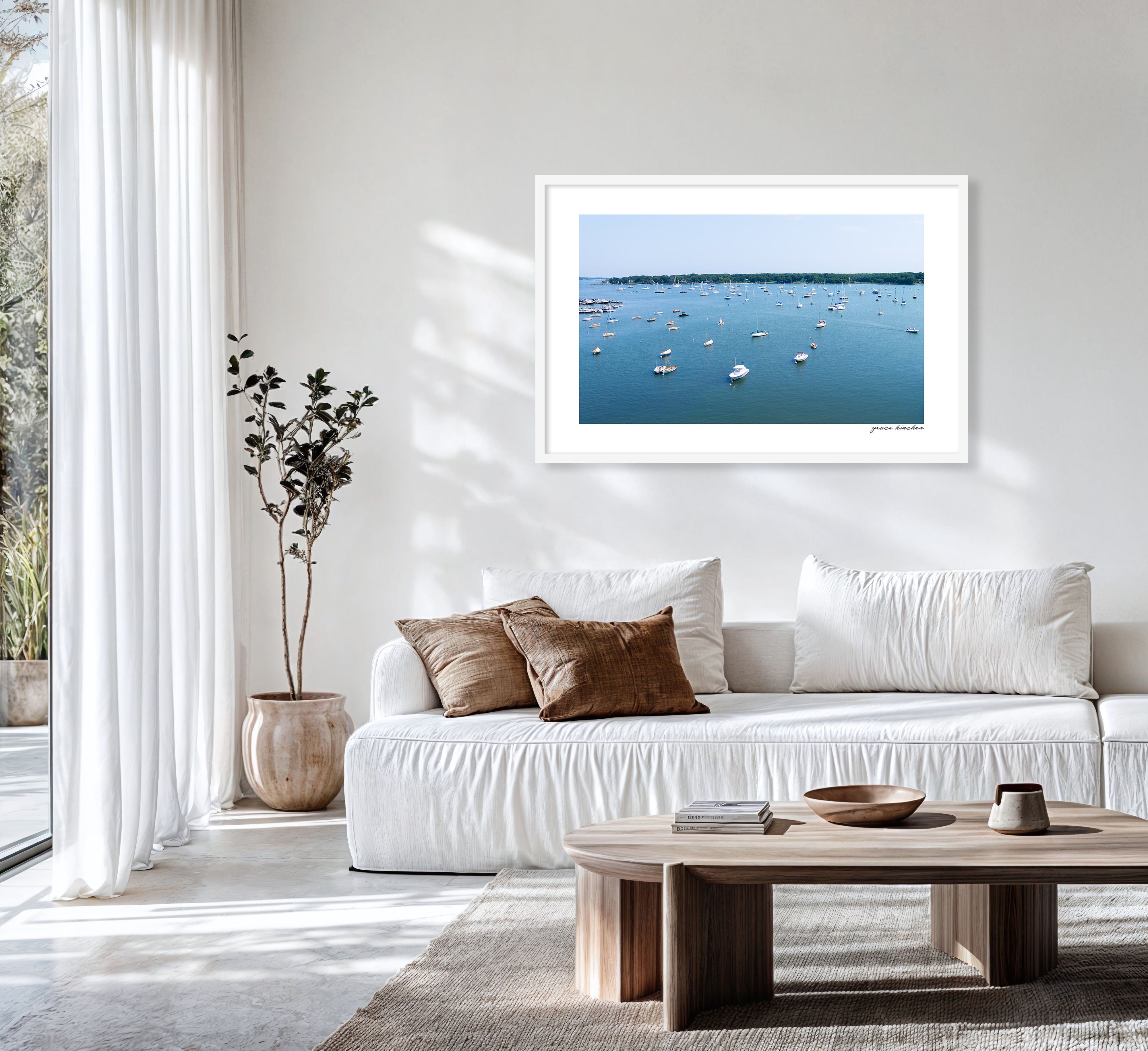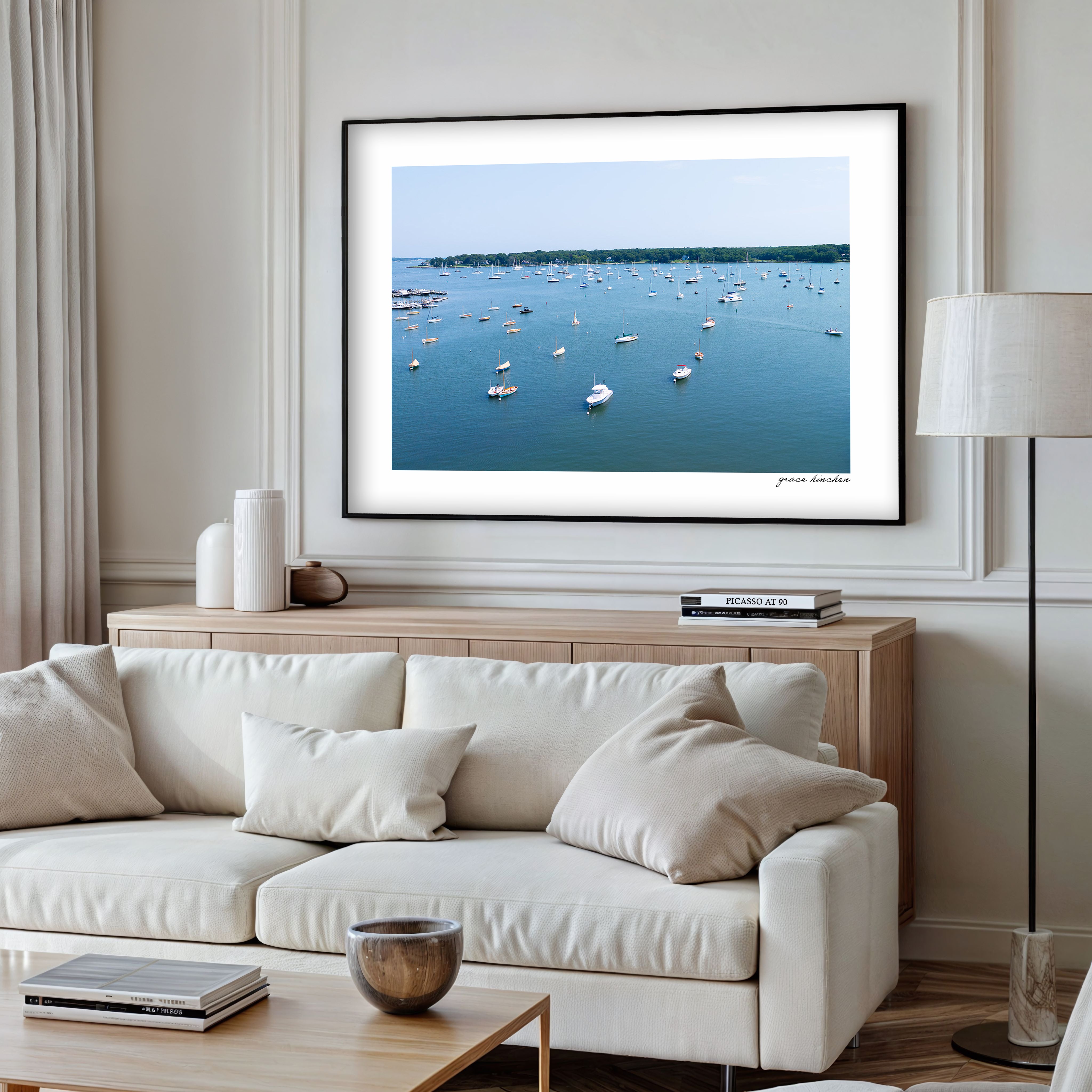 Aerial view of the mooring field in Dering Harbor on Shelter Island, July 2024. Shot by drone.