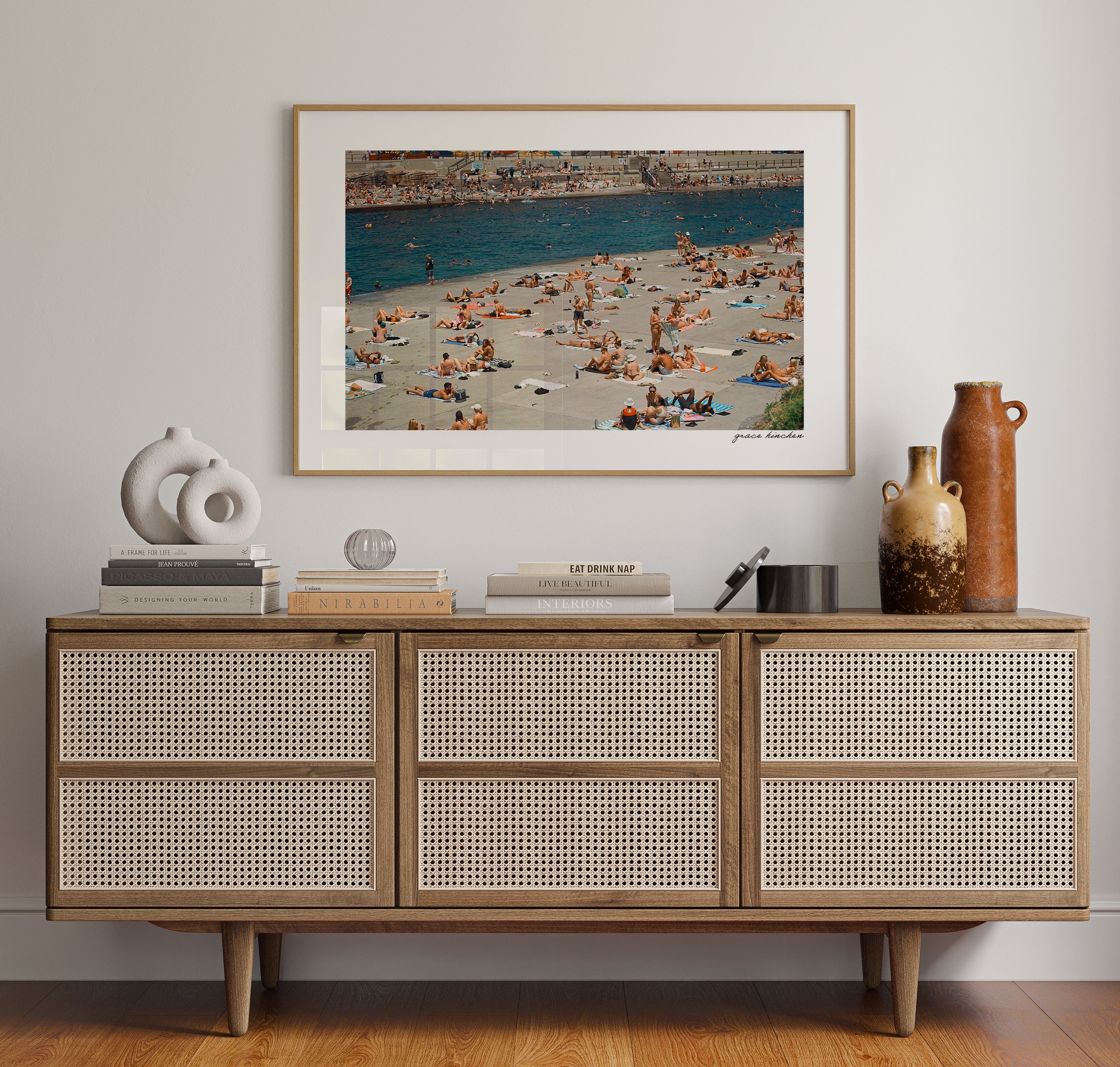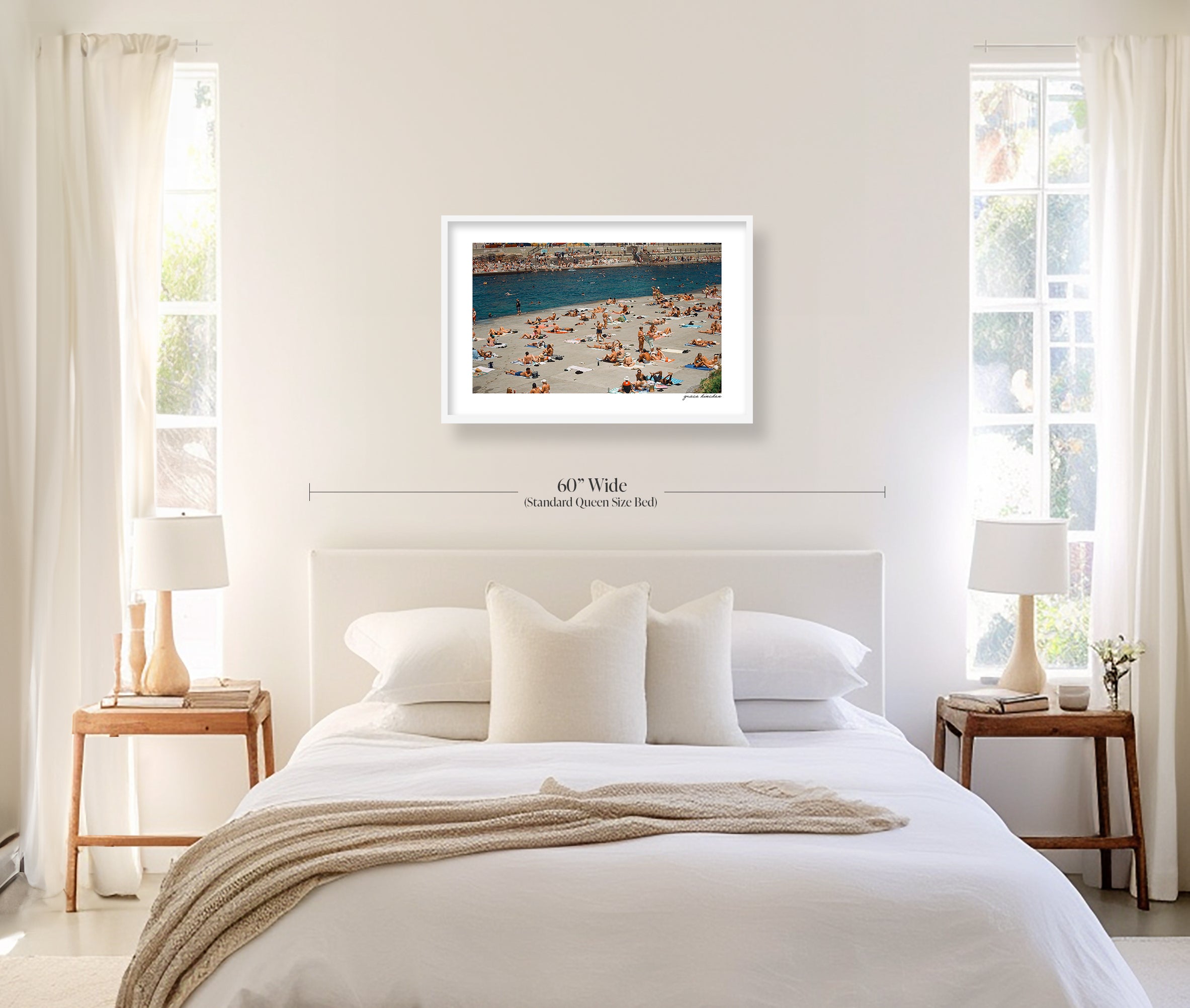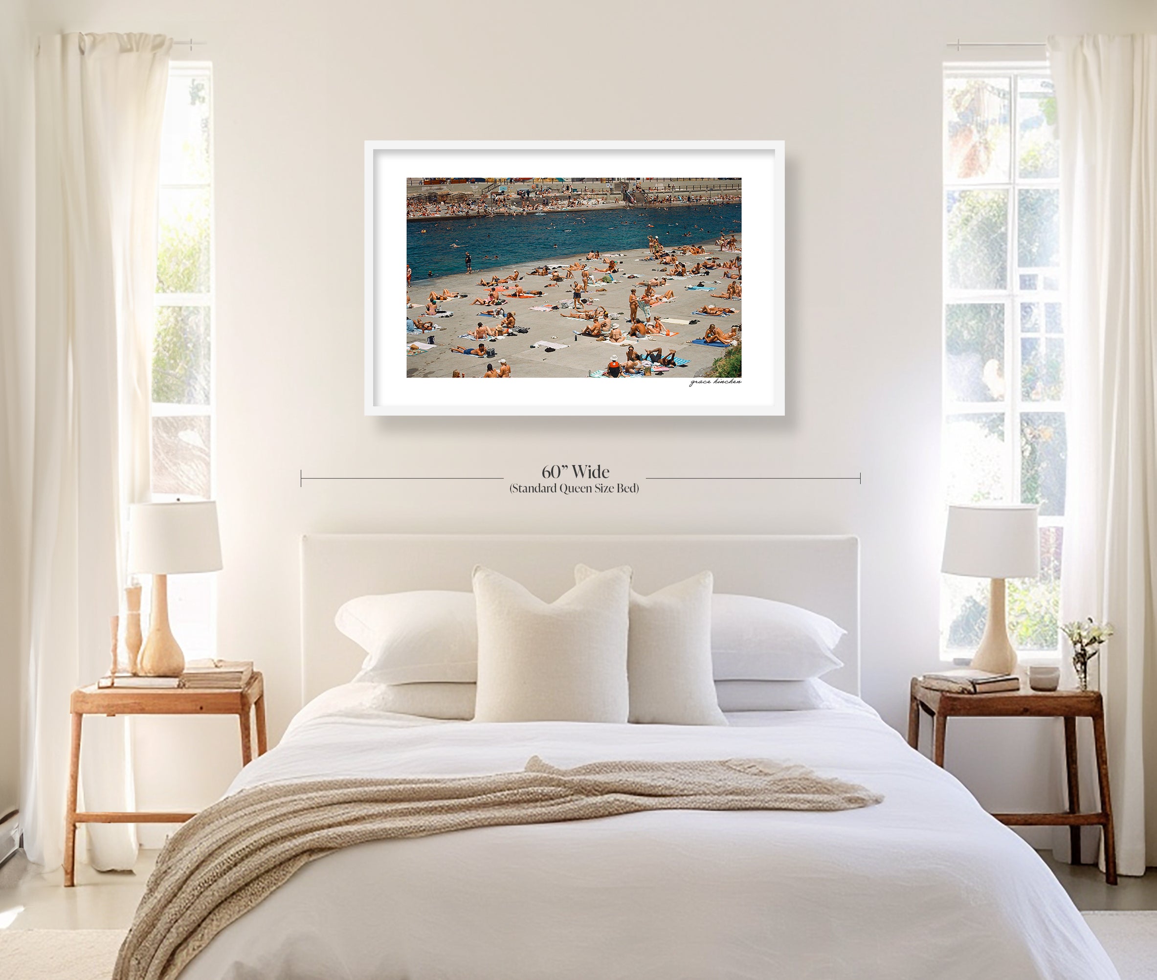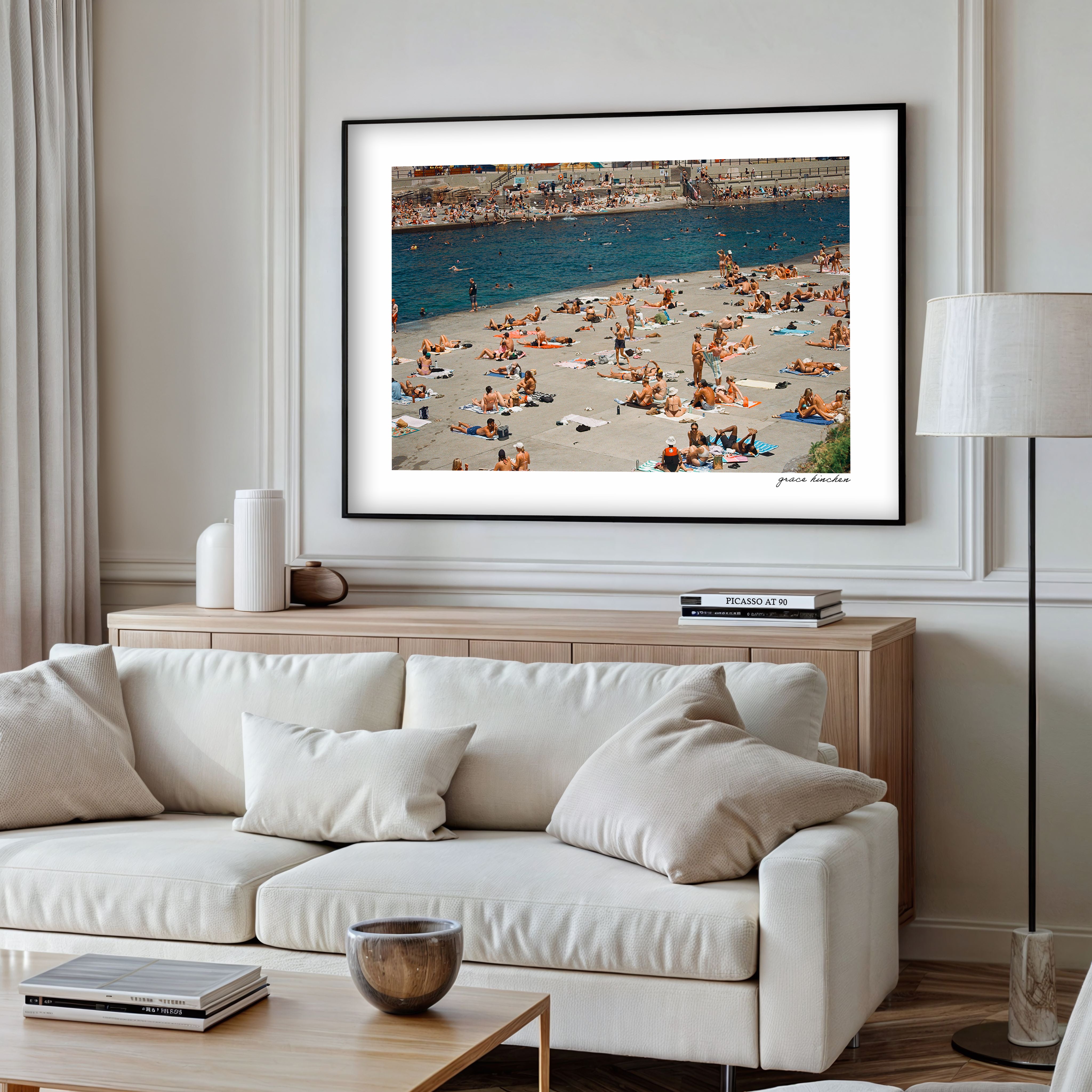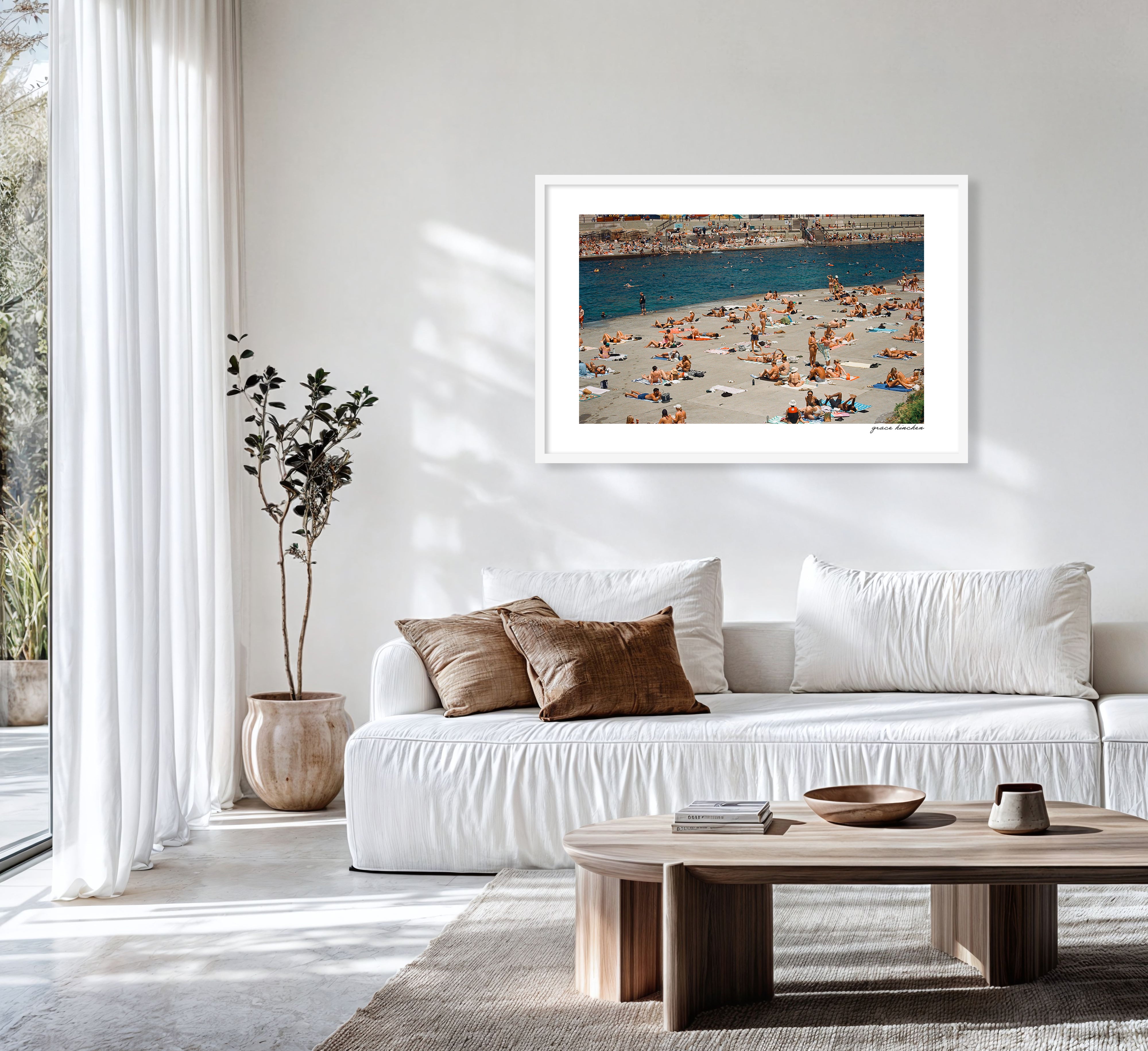 Swimmers and sunbathers enjoy the unique charm of Clovelly Beach, a narrow inlet carved into the coast, January 2025. Shot on film.
