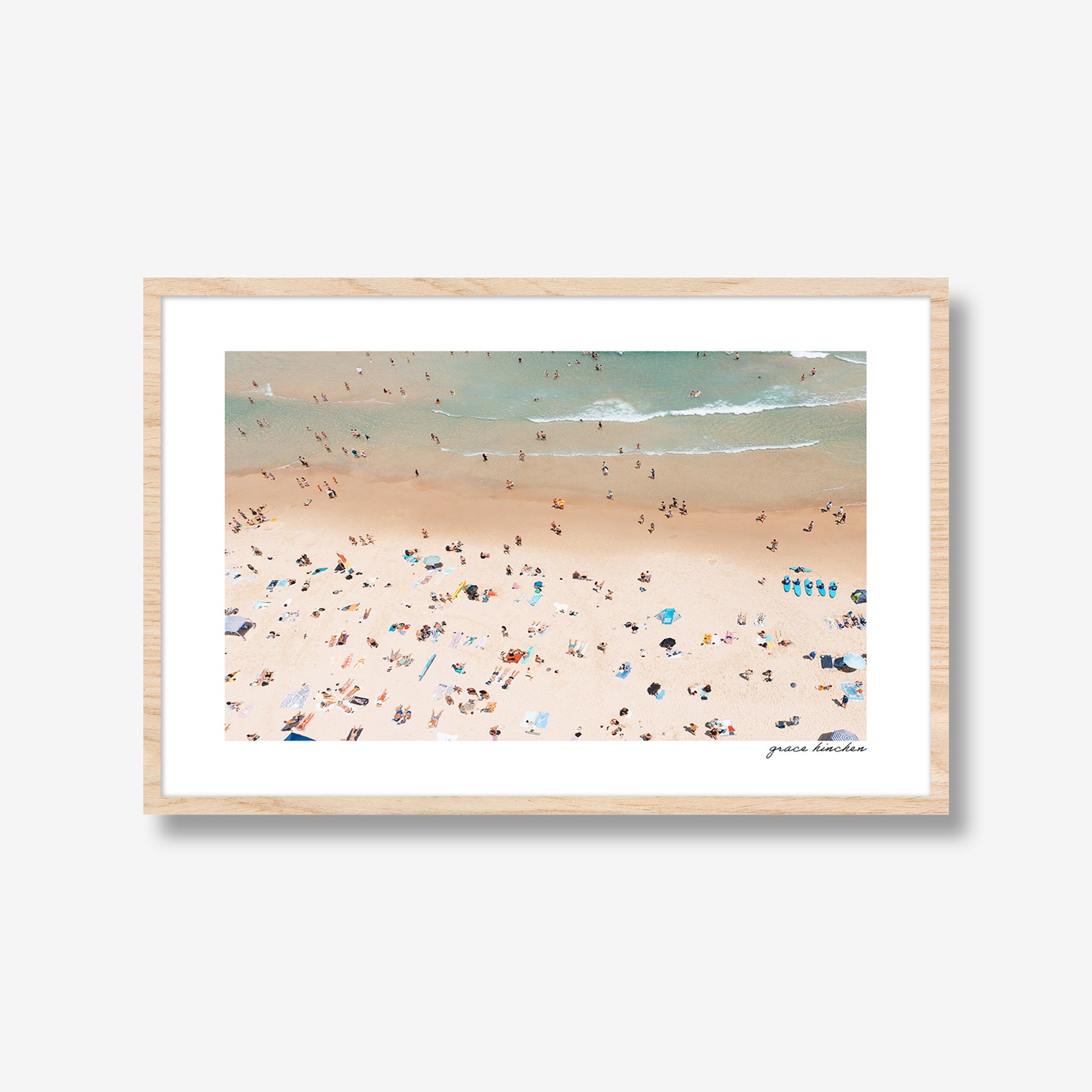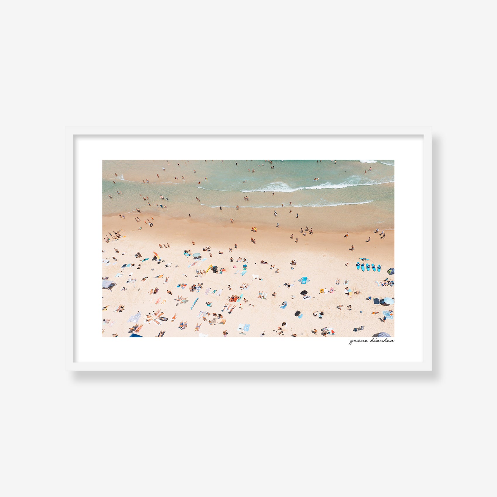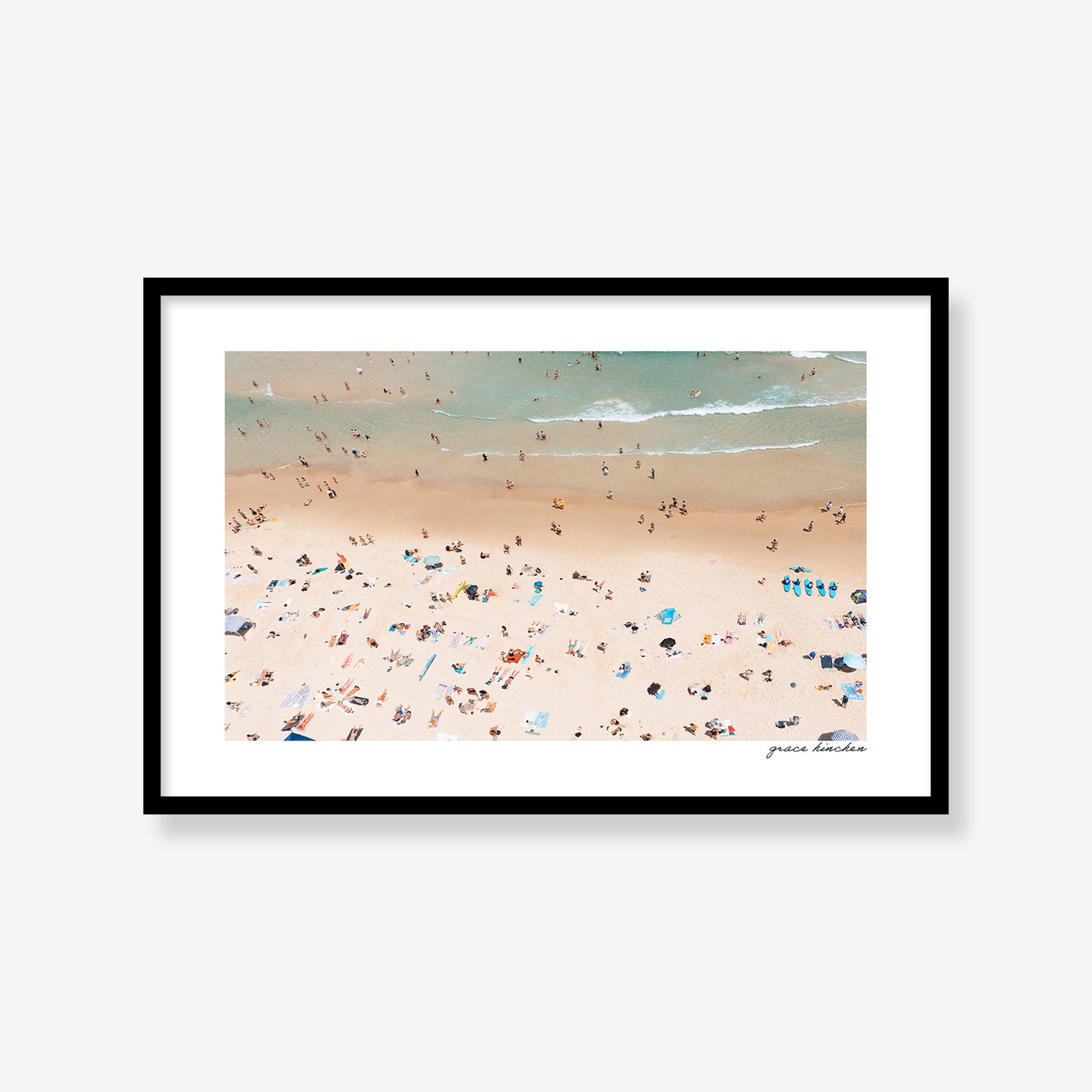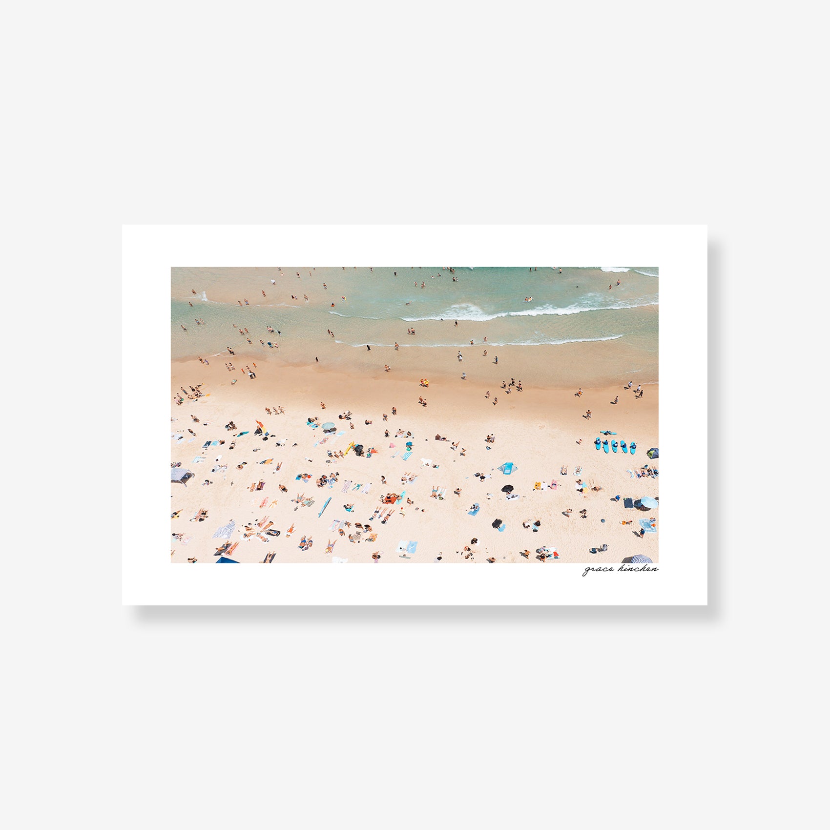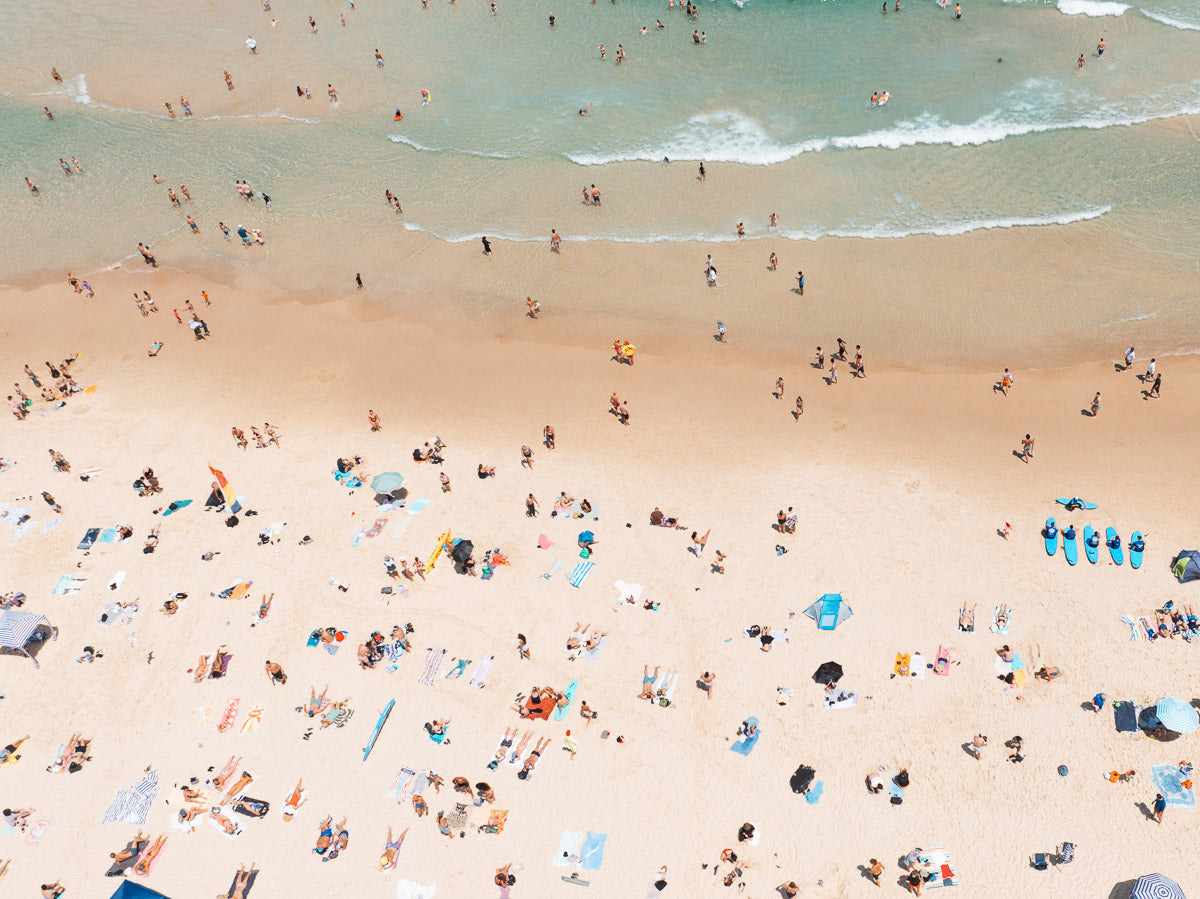 From above, Bondi Beach becomes a study in geometry and scale; beachgoers appearing as color-dotted specks along the shore, January 2025. Shot by drone.