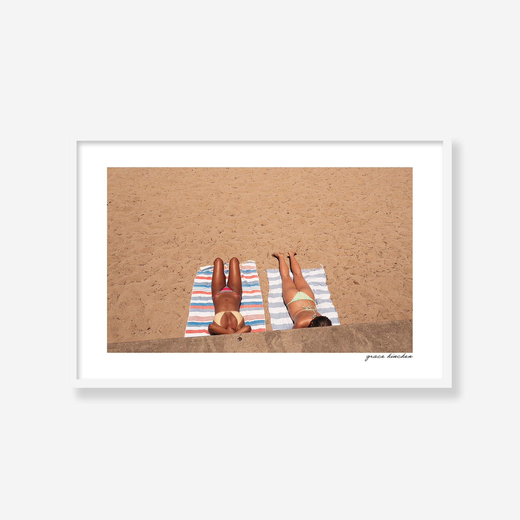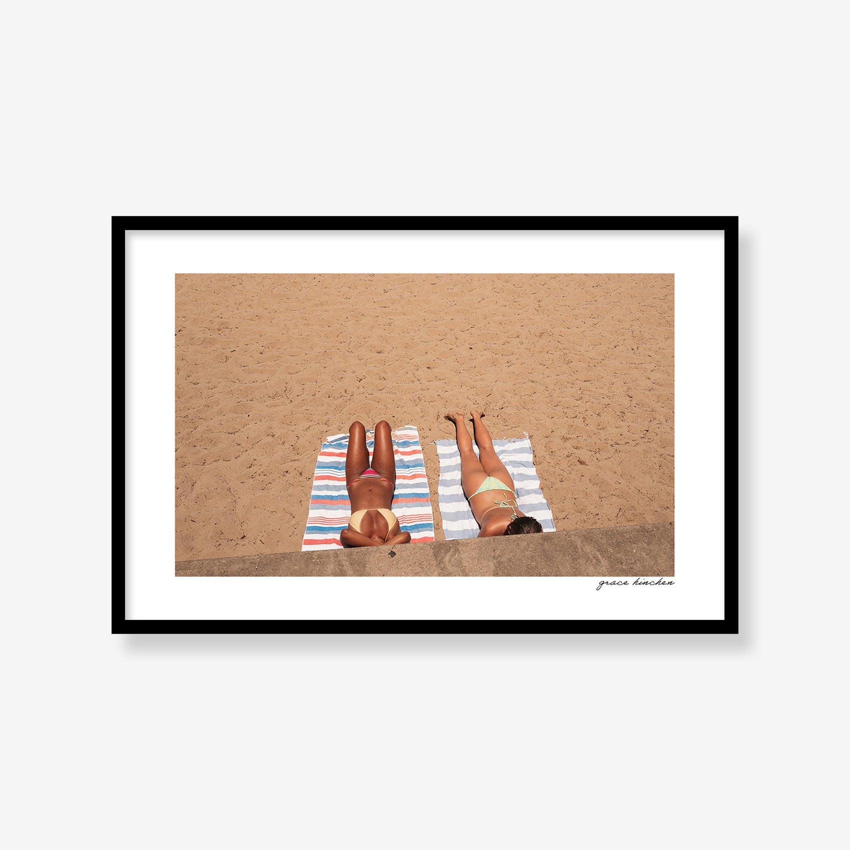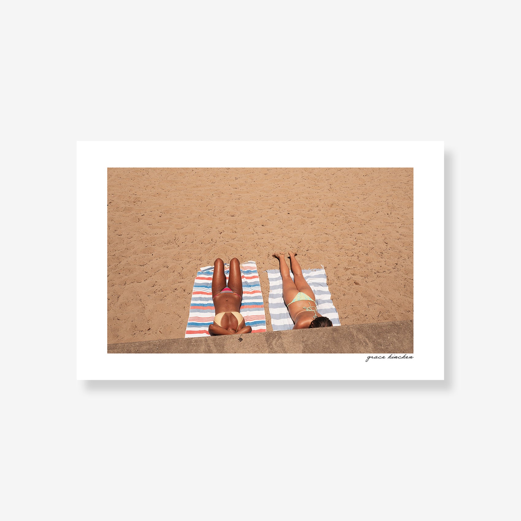 Two girls sunbathe on the sand at Manly Cove Beach, January 2025.