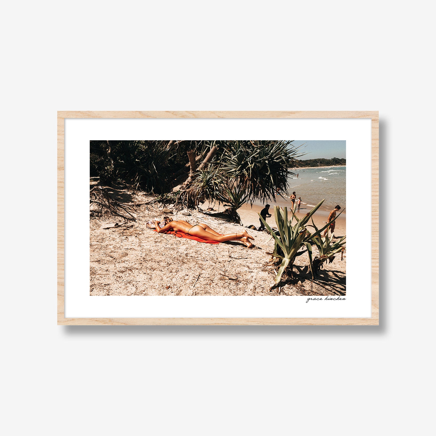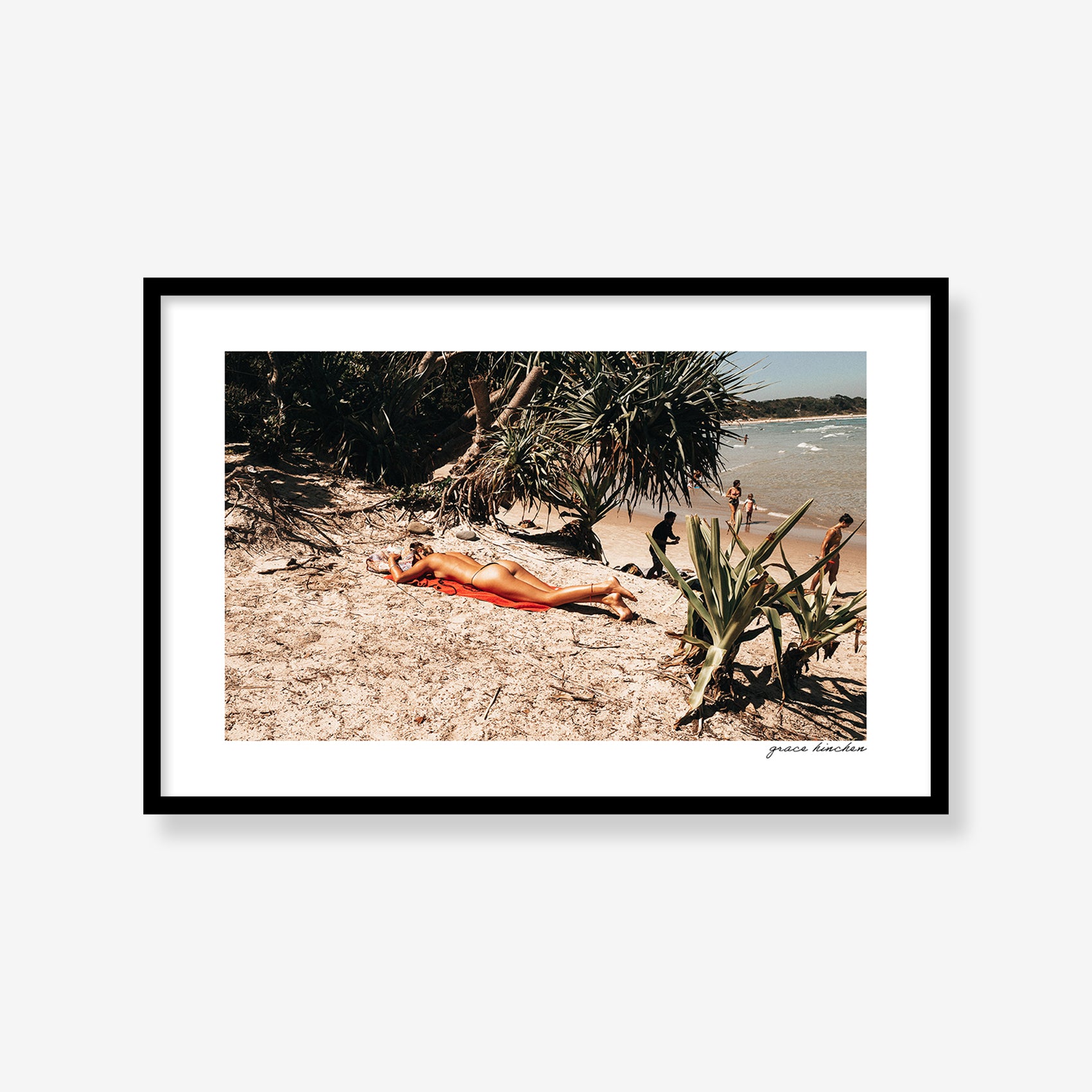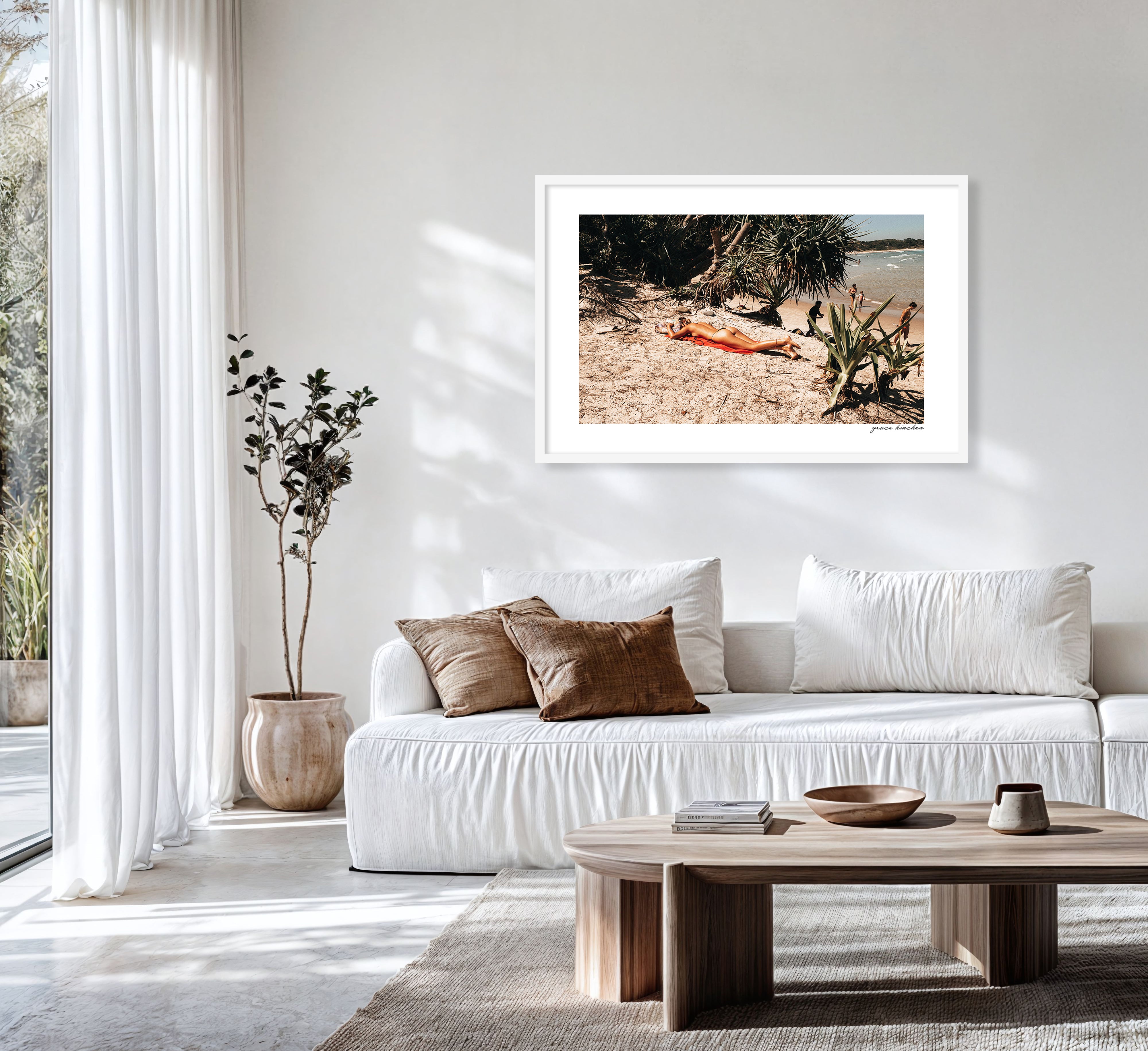 A woman sunbathes beside the car ramp at The Pass in Byron Bay, January 2025.