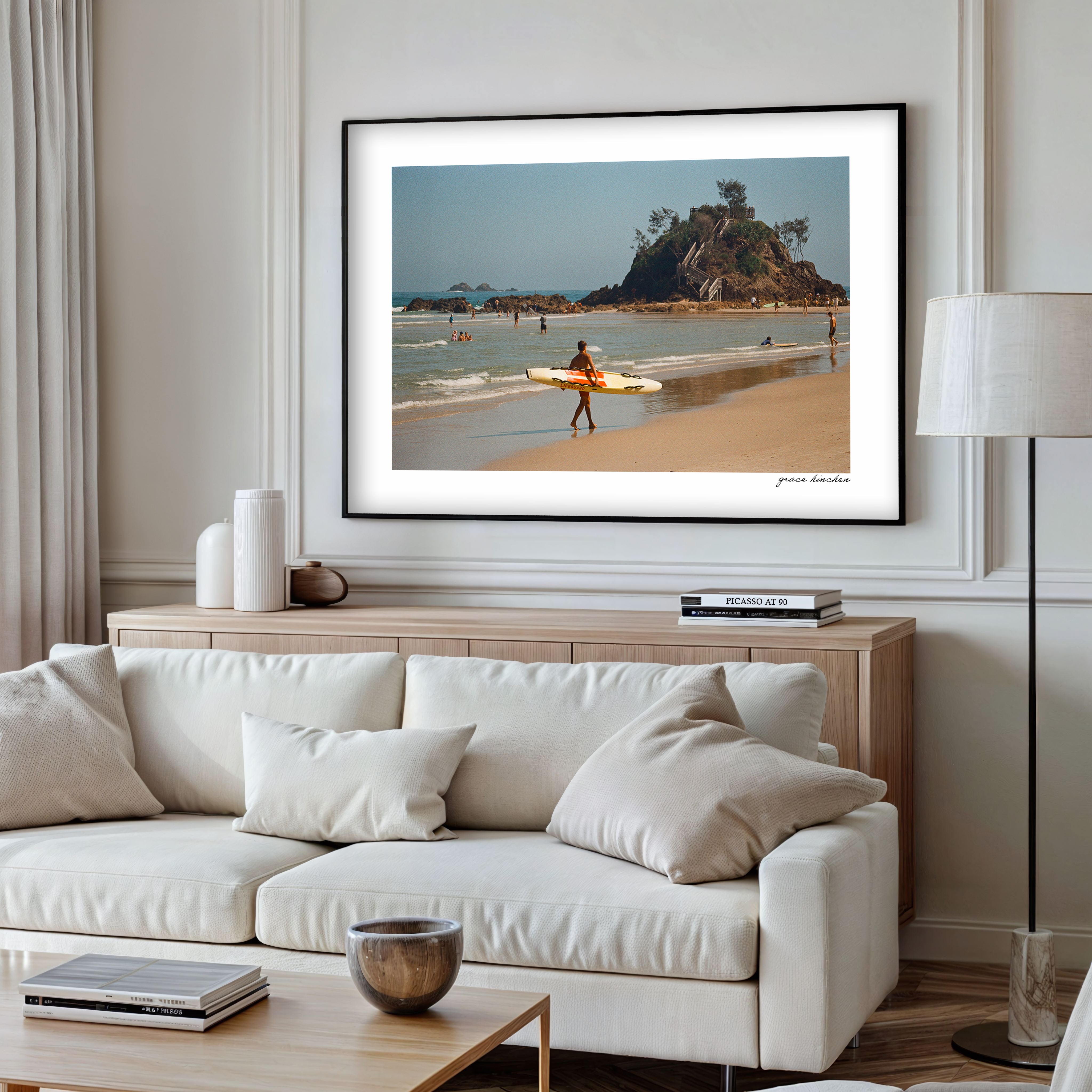 A Byron Bay surf lifesaver returns a surf ski to shore after a paddle break during patrol, January 2025. Shot on film.