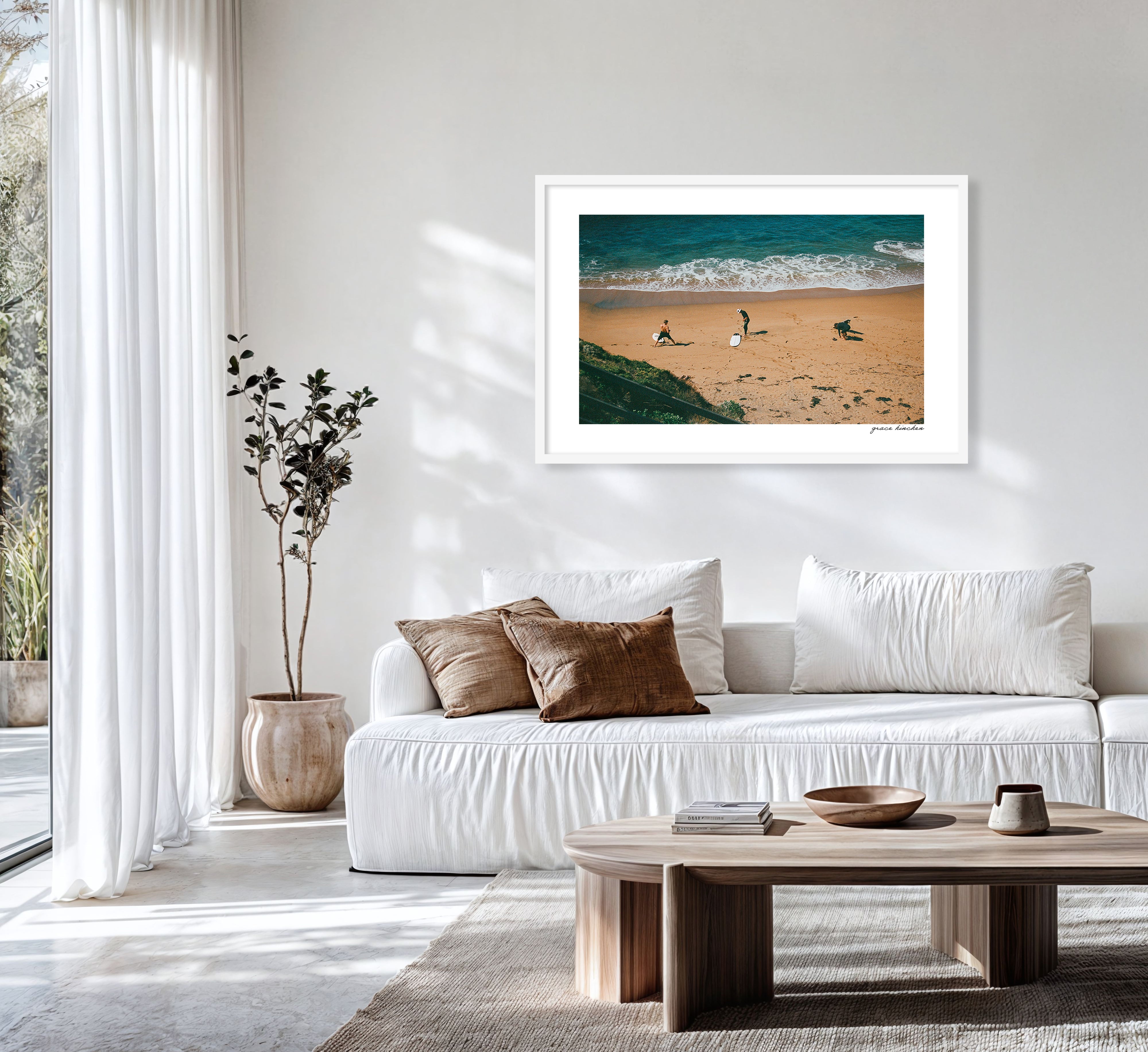 Three surfers prepare to paddle out at Bells Beach with stretching and quiet rituals, December 2024. Shot on film.