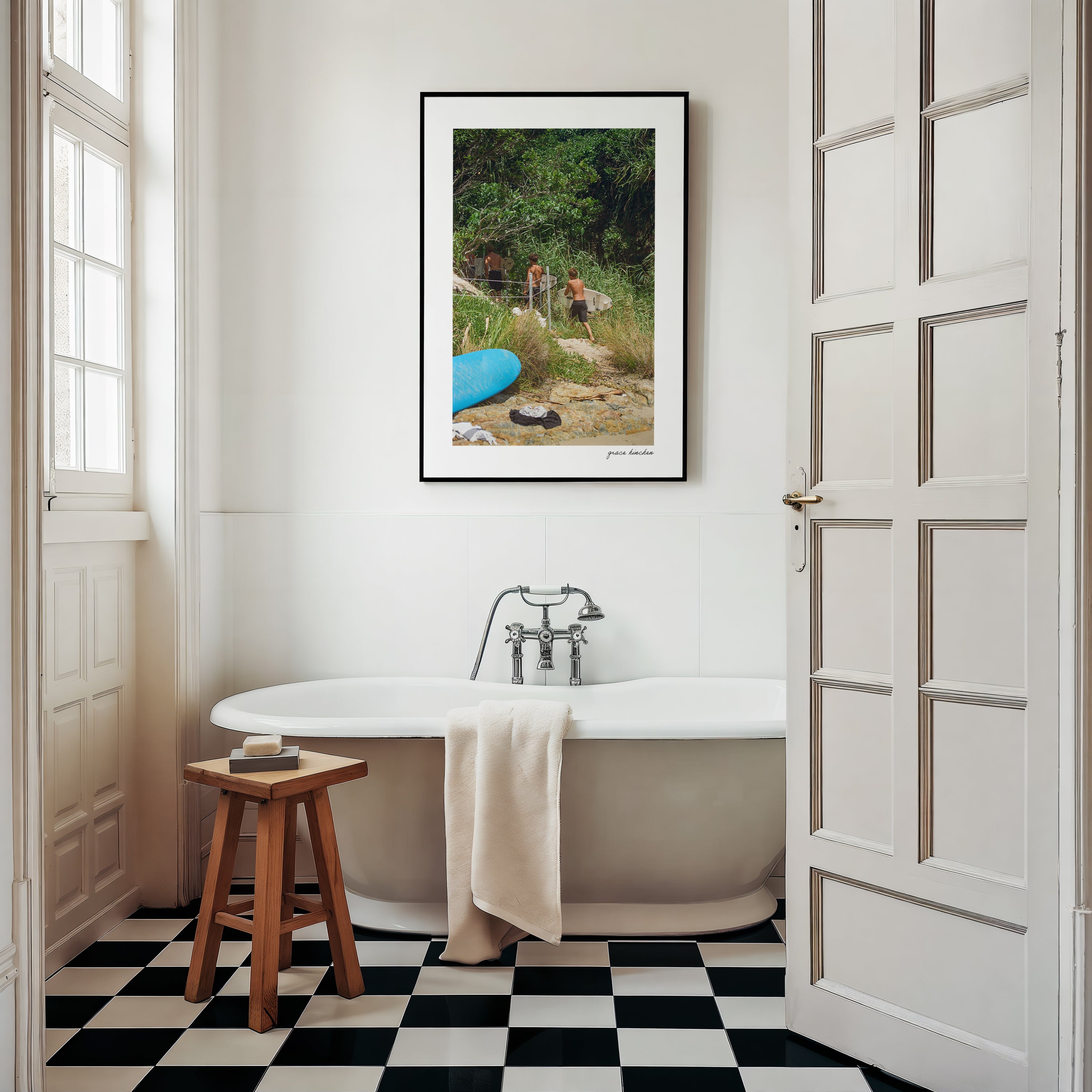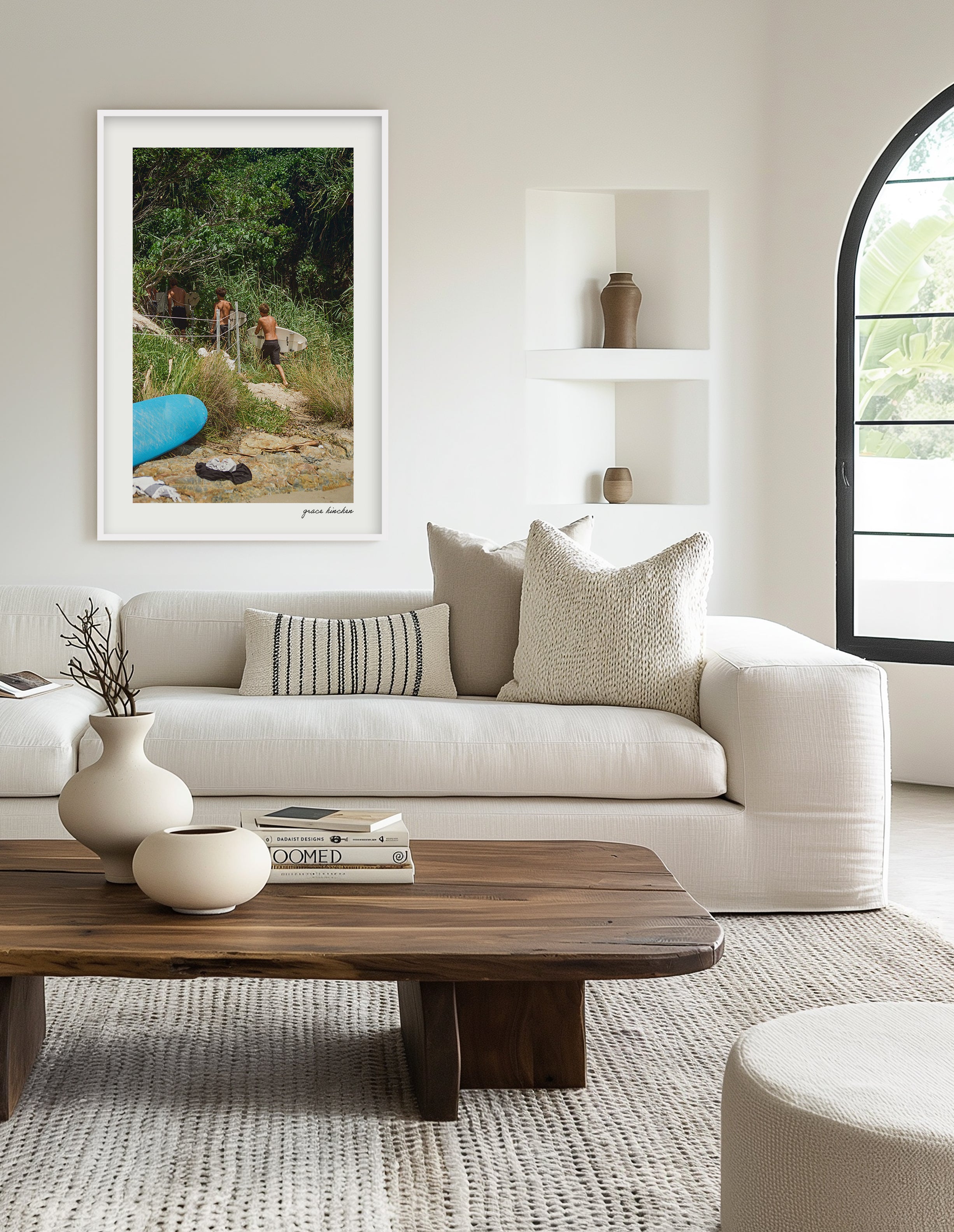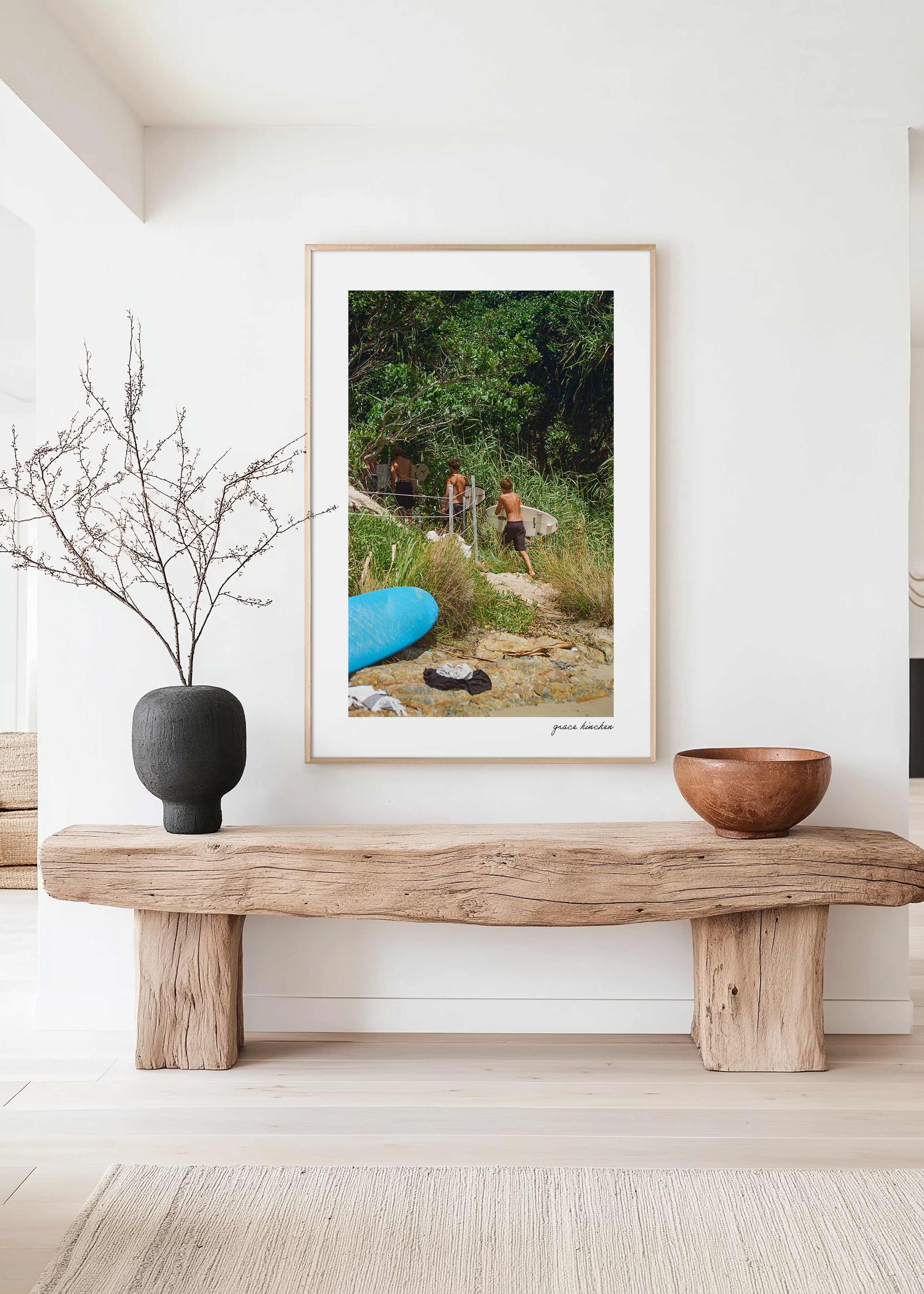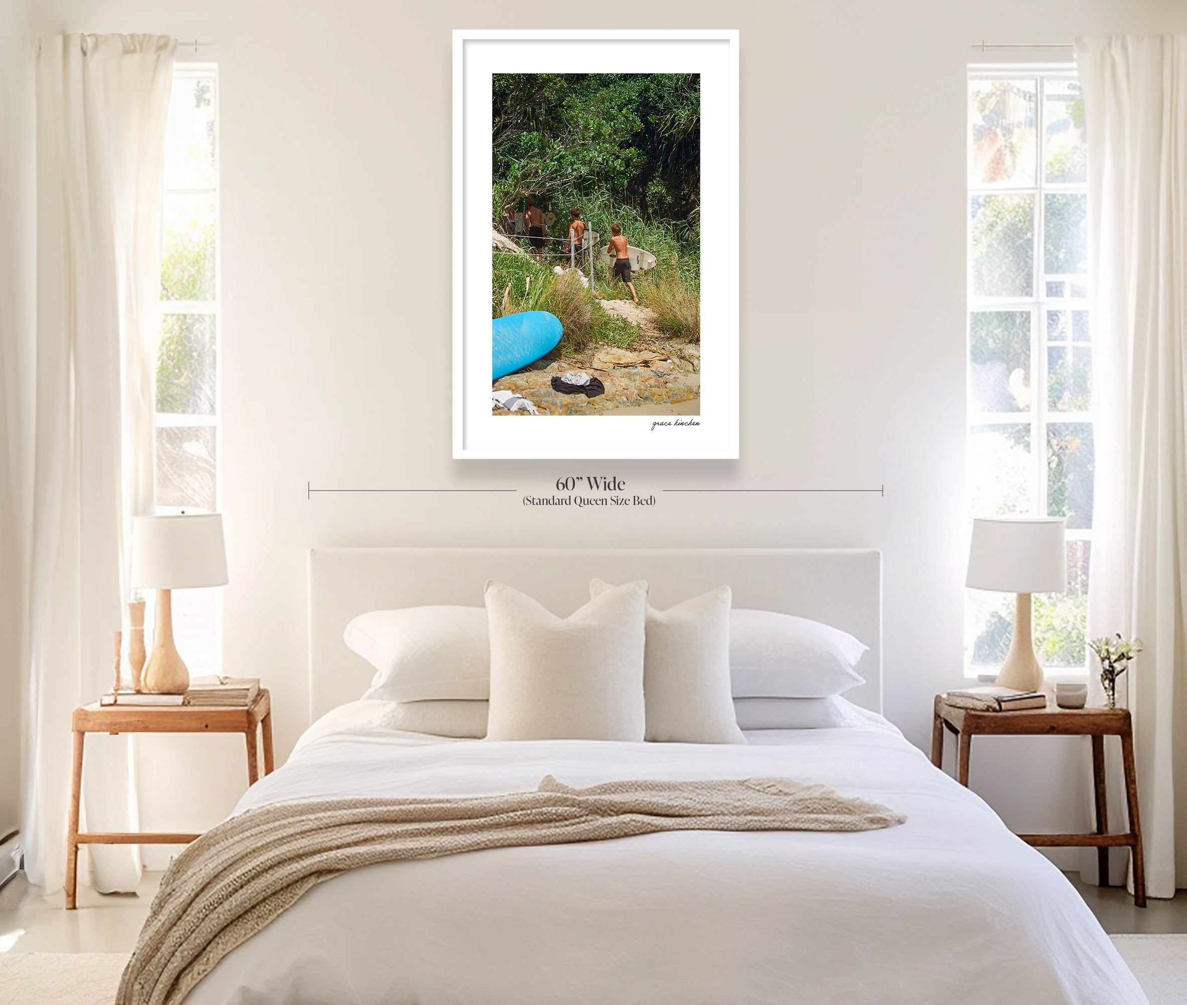 Four surfers make their way down an informal trail to reach the lineup at The Pass in Byron Bay, January 2025. Shot on film.