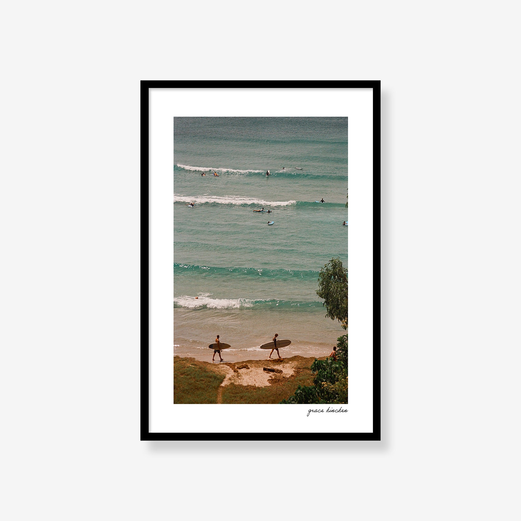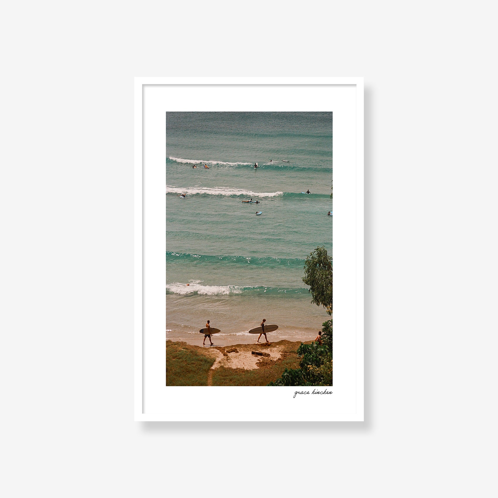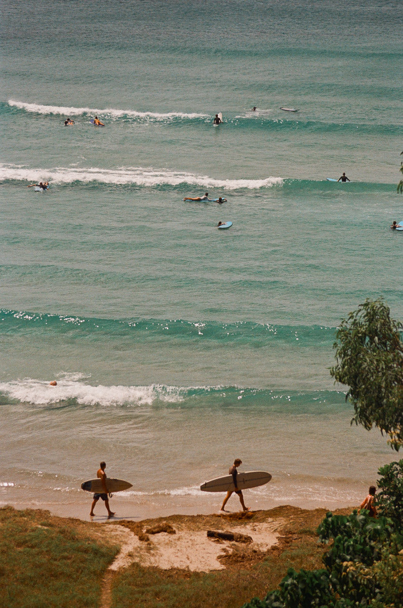 Surfers walk along Clarke's Beach to The Pass, January 2025. Shot on film.