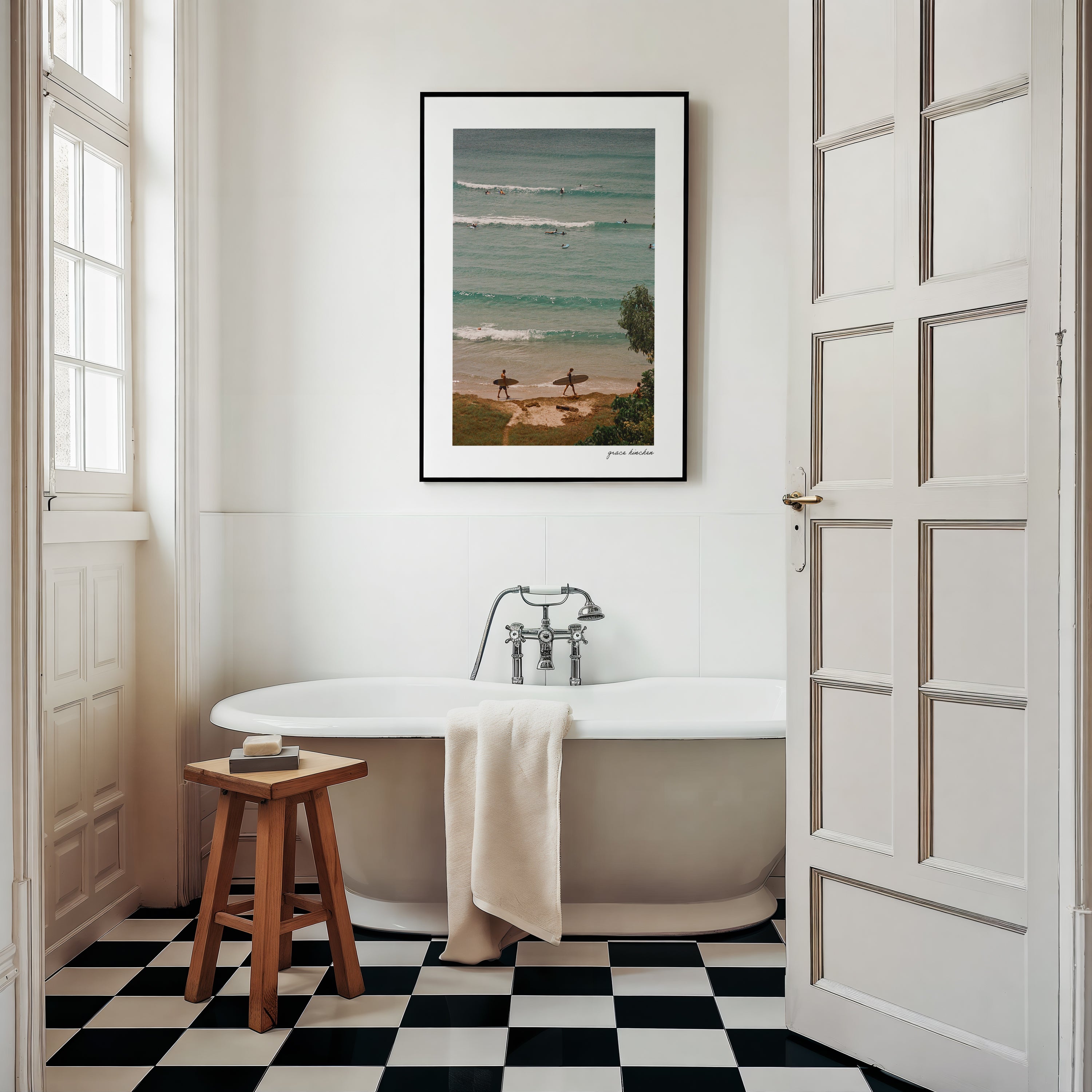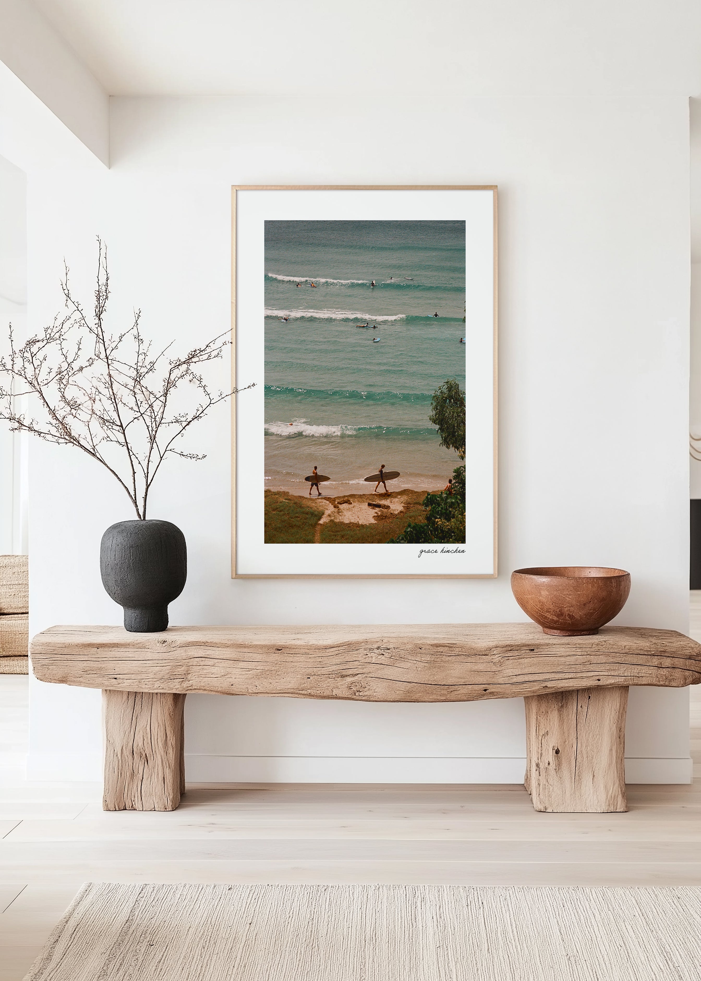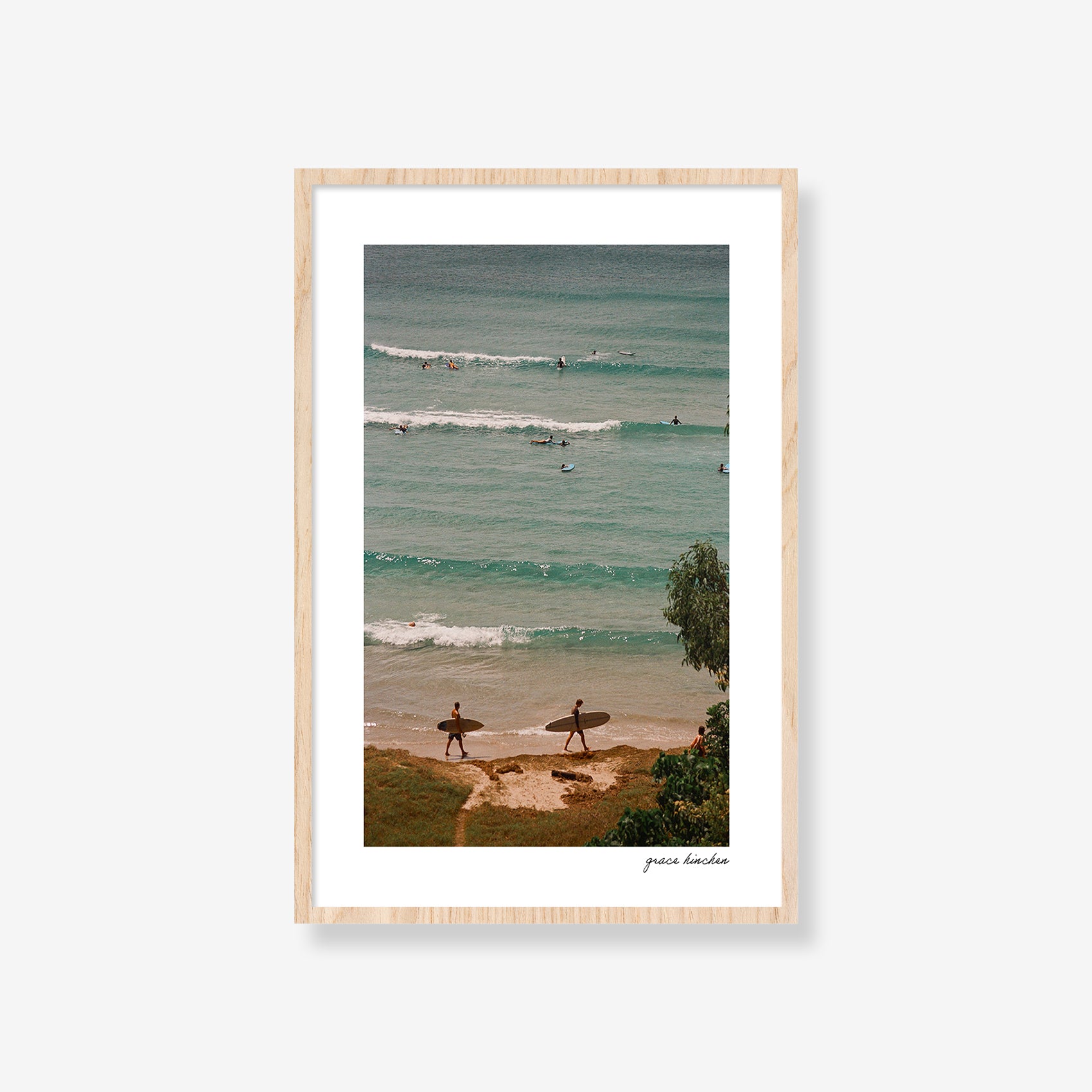 Surfers walk along Clarke's Beach to The Pass, January 2025. Shot on film.