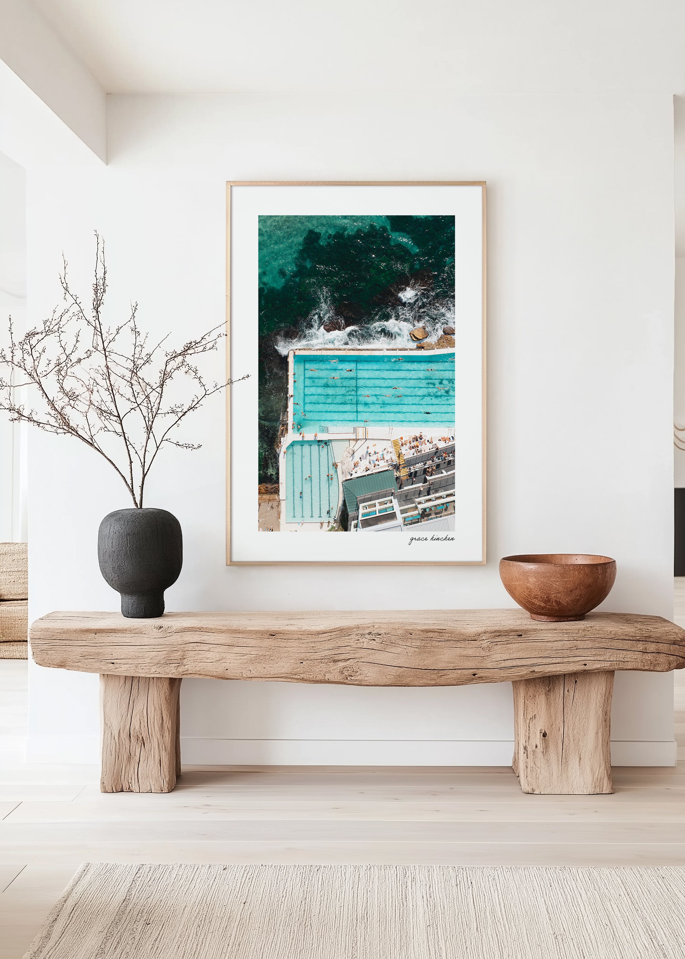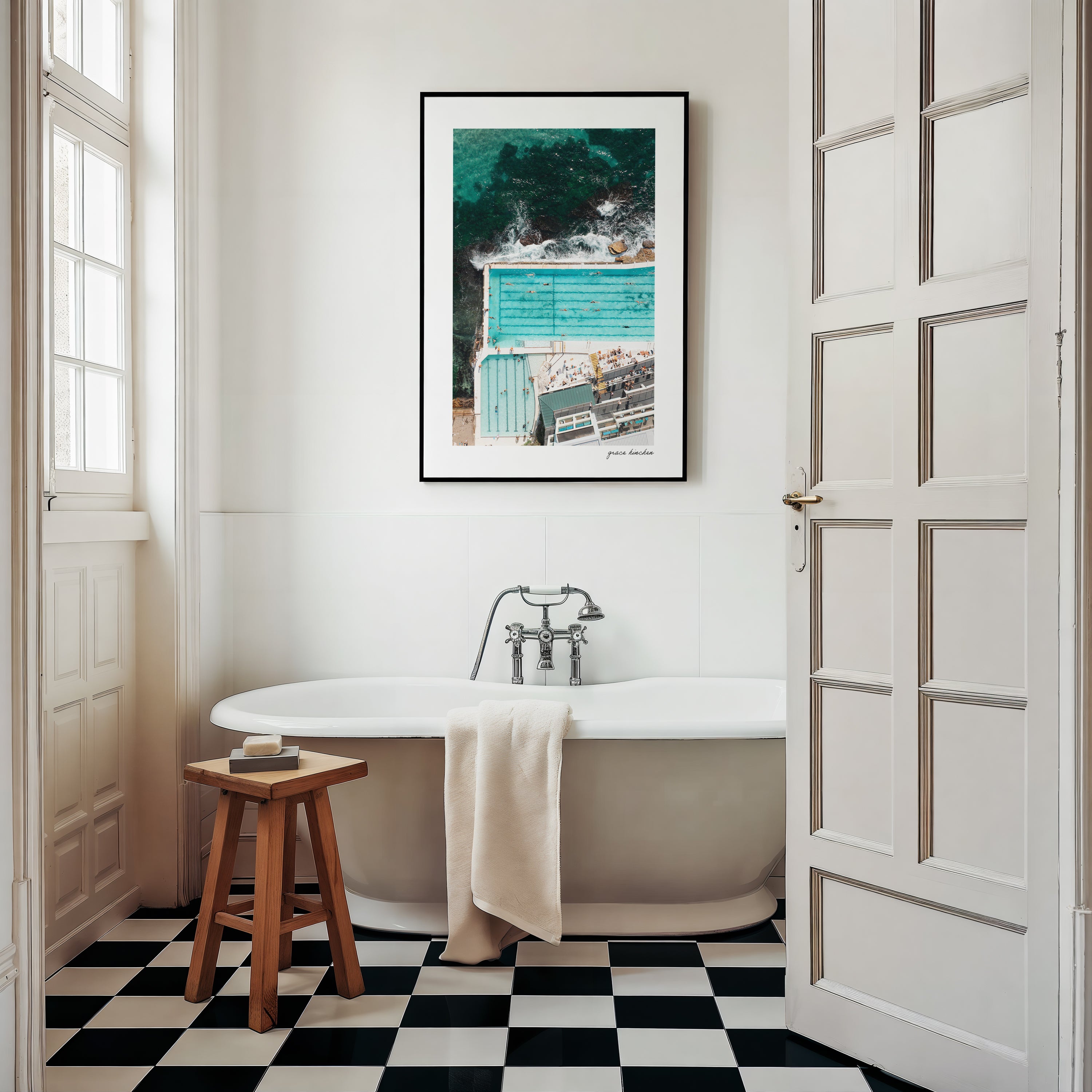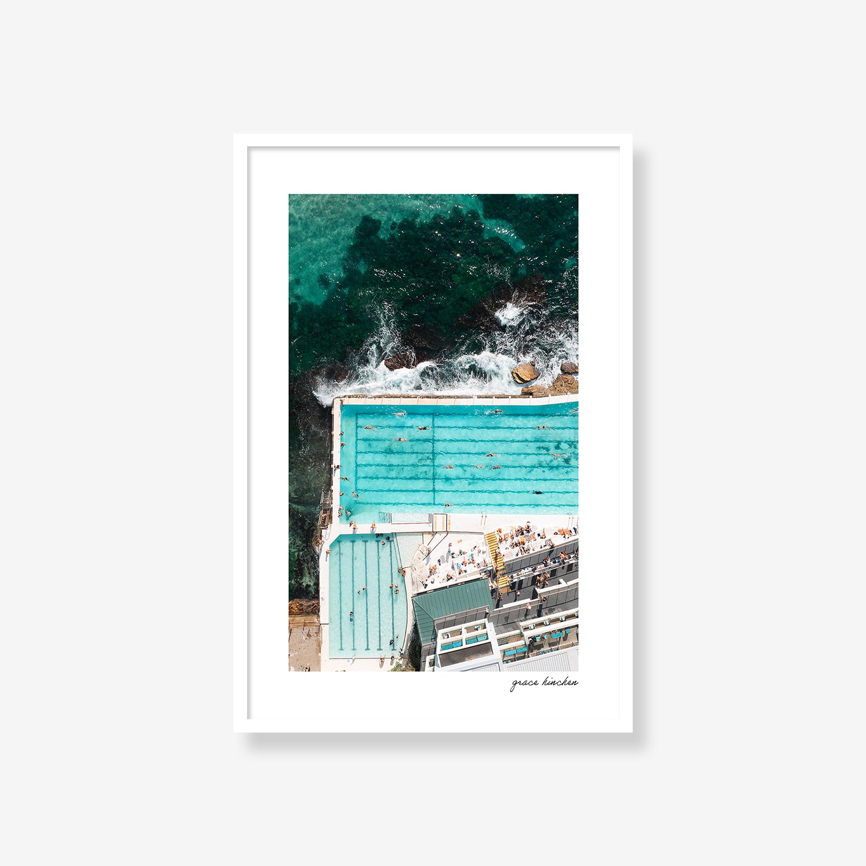 Aerial view of waves crashing into the Bondi Icebergs ocean pool - where nature meets routine, December 2023. Shot by drone.